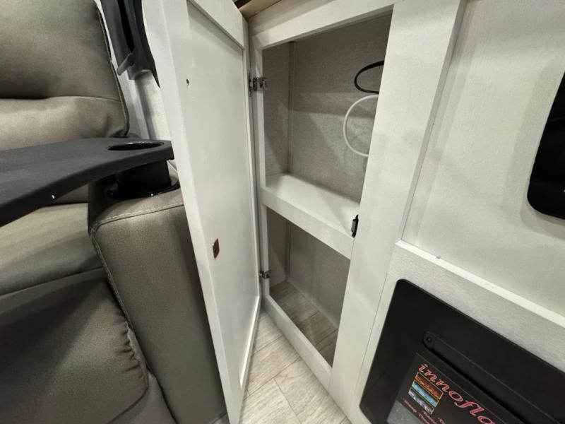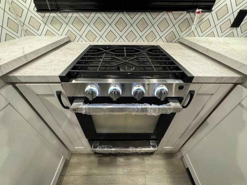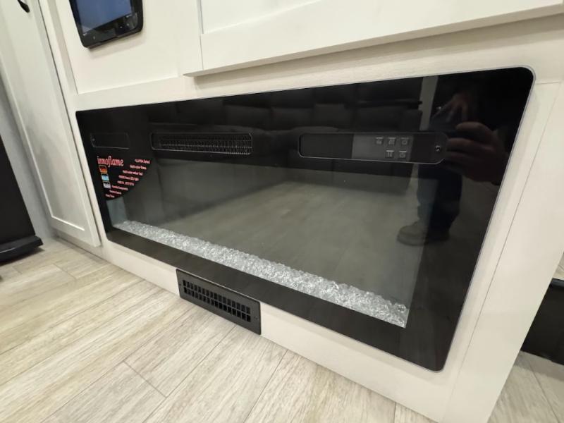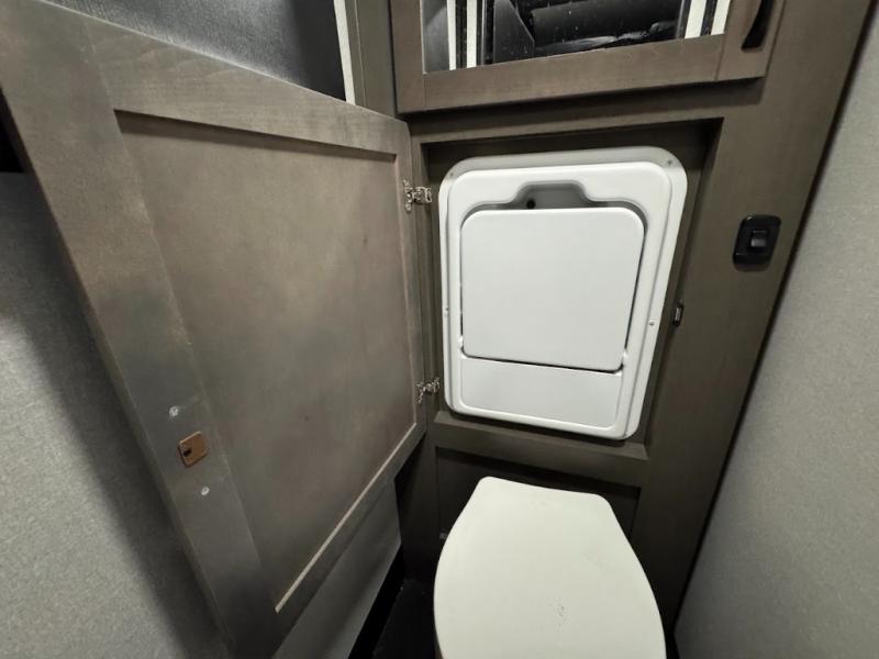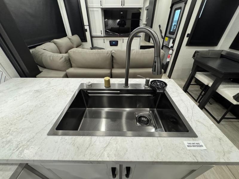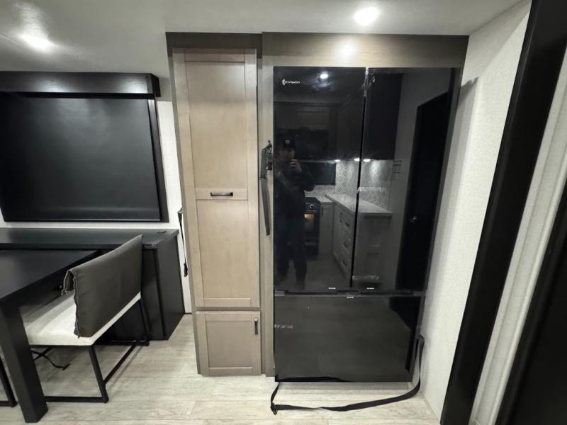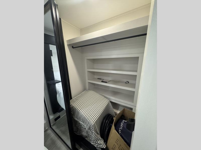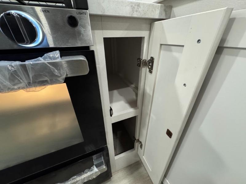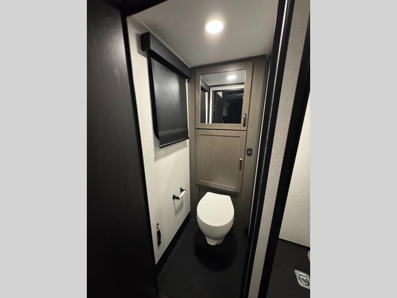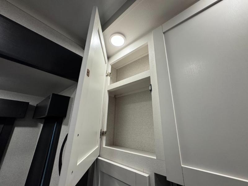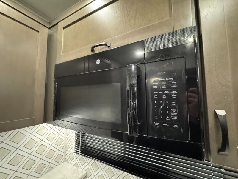 The 13' 6" garage is the perfect space for your toys, with enough room for your ATV, motorcycle, or other gear. Plus, the electric queen bed provides a comfortable spot to rest after a long day. The overhead loft with storage provides additional space for your gear, keeping it out of the way but still accessible. The kitchen is fully equipped with a microwave, sink, overhead cabinets, pantry, and coffee bar. The L-shaped sofa provides ample seating for relaxation, and the TV is perfectly positioned for viewing. The full bathroom is a welcome convenience, providing a private space to freshen up. Also, the front bedroom is a luxurious retreat, featuring a king bed, a walk-in closet, and drawers, and on the exterior, the two entry/exit doors provide easy access to the outside, making it perfect for loading and unloading your gear.