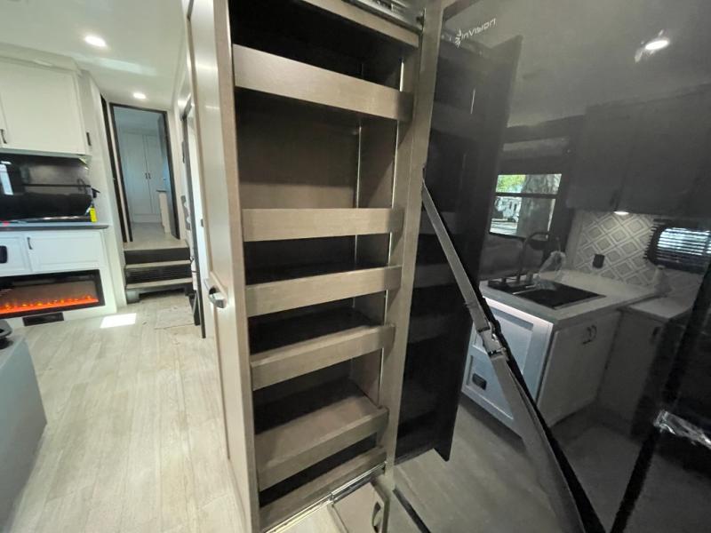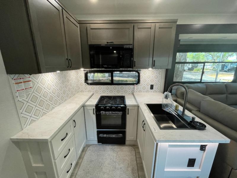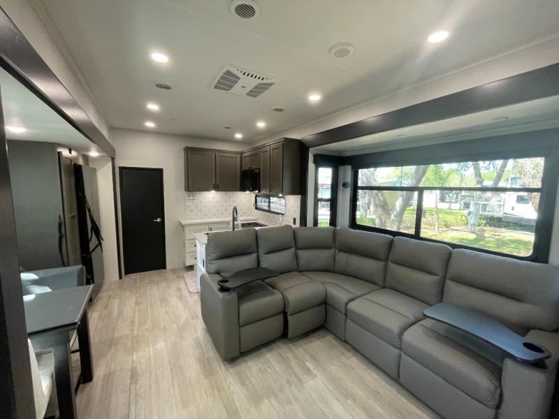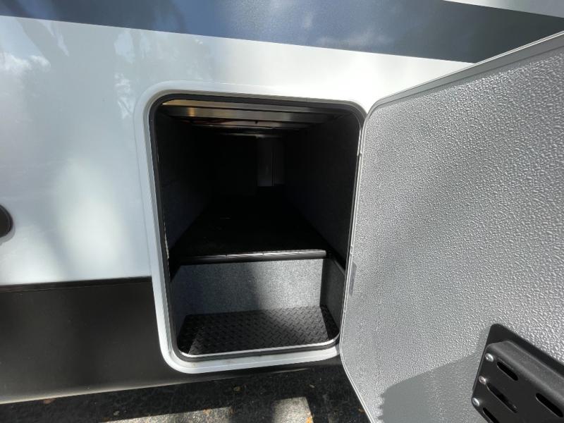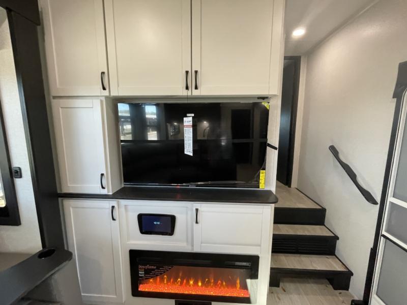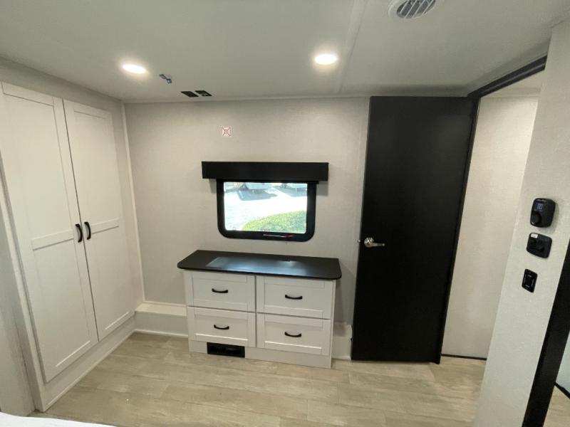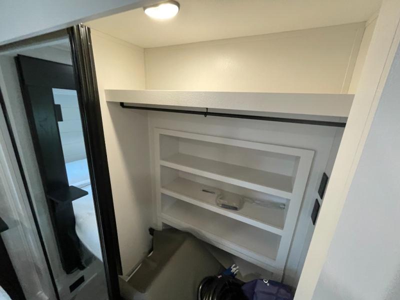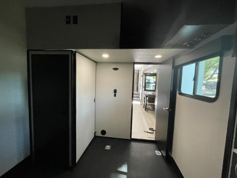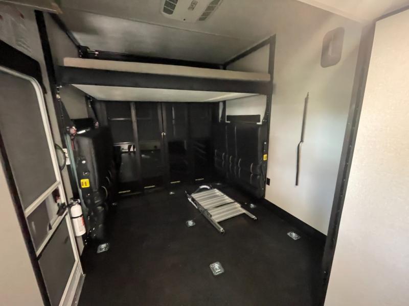 The 13' 6" garage is the perfect space for your toys, with enough room for your ATV, motorcycle, or other gear. Plus, the electric queen bed provides a comfortable spot to rest after a long day. The overhead loft with storage provides additional space for your gear, keeping it out of the way but still accessible. The kitchen is fully equipped with a microwave, sink, overhead cabinets, pantry, and coffee bar. The L-shaped sofa provides ample seating for relaxation, and the TV is perfectly positioned for viewing. The full bathroom is a welcome convenience, providing a private space to freshen up. Also, the front bedroom is a luxurious retreat, featuring a king bed, a walk-in closet, and drawers, and on the exterior, the two entry/exit doors provide easy access to the outside, making it perfect for loading and unloading your gear.