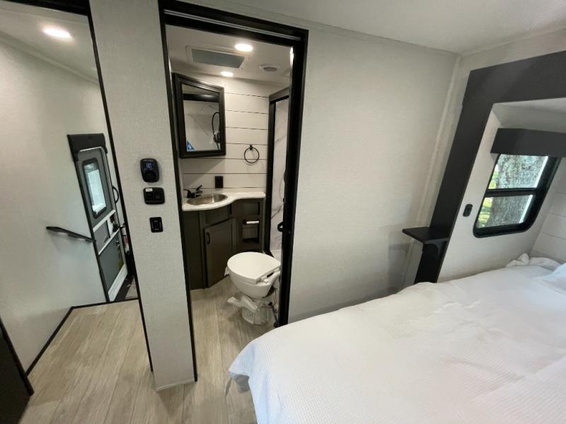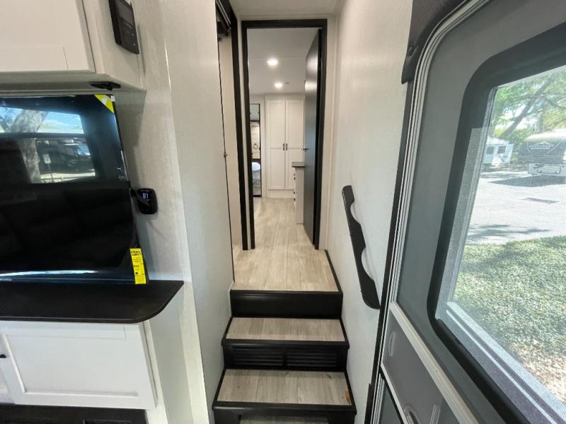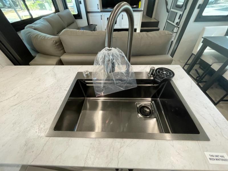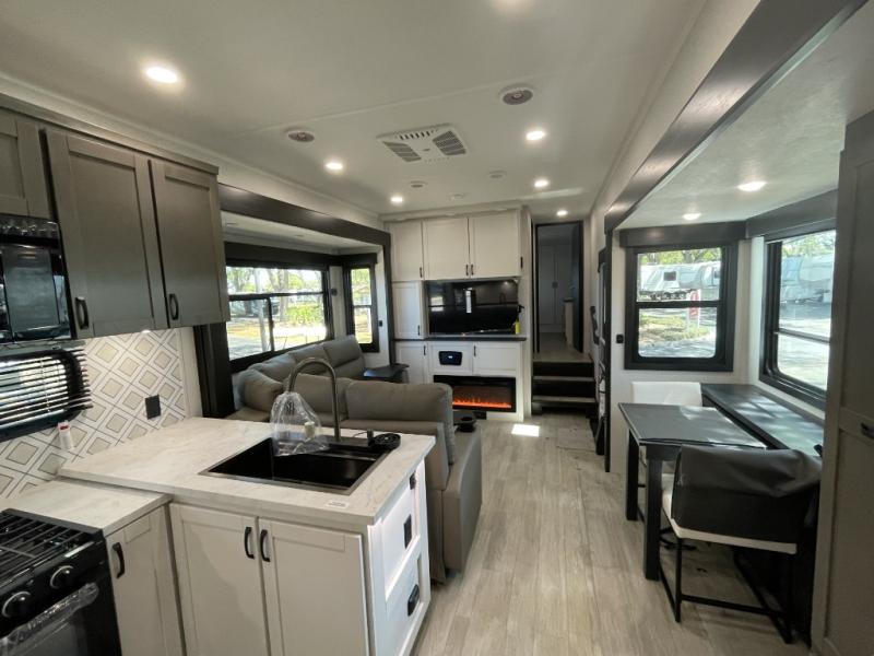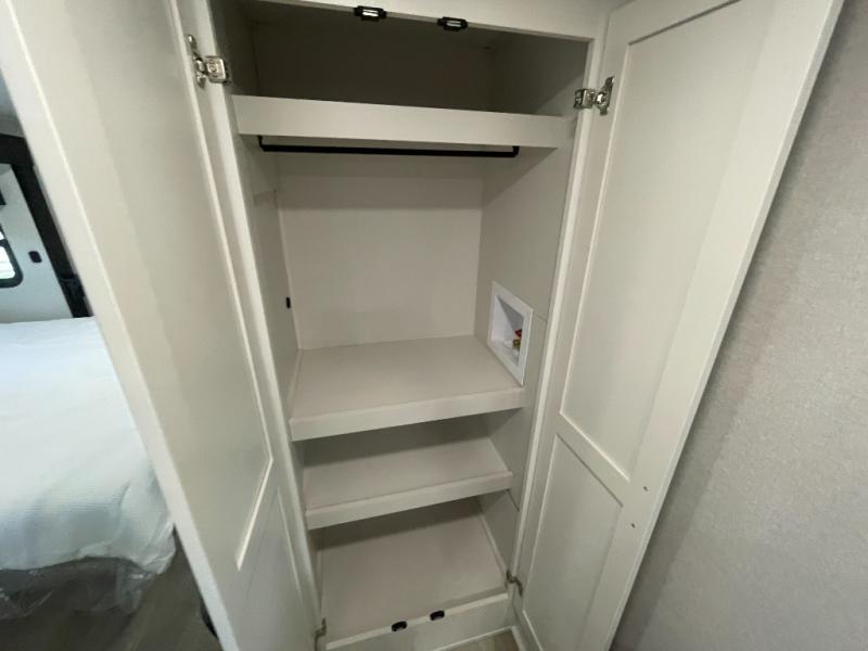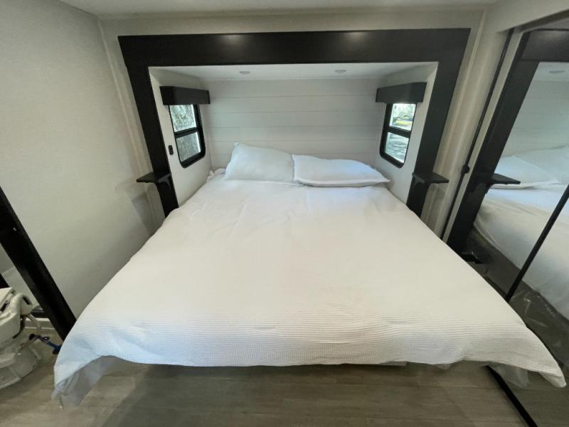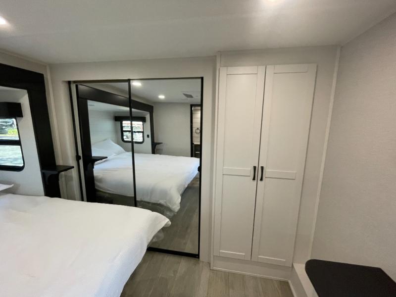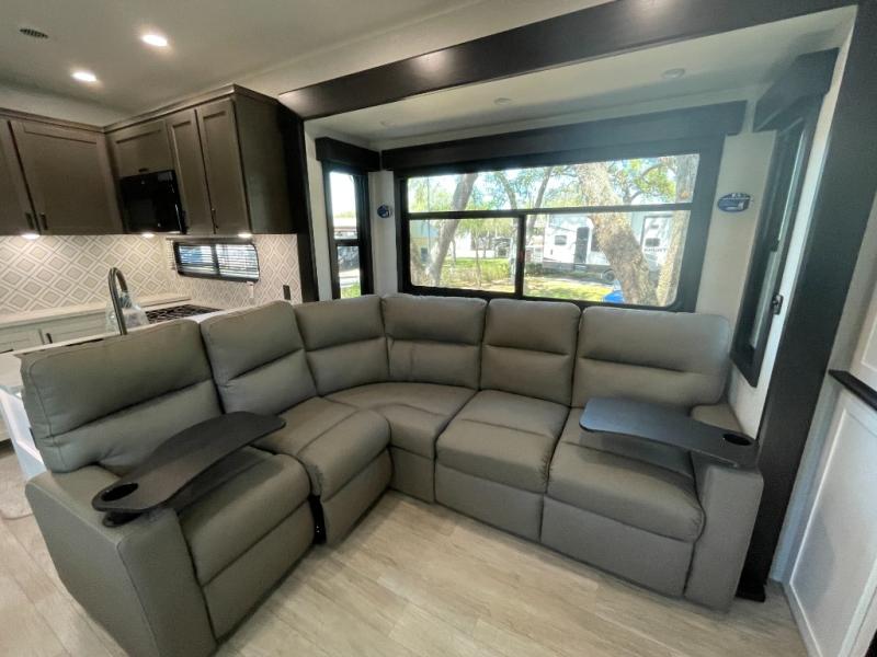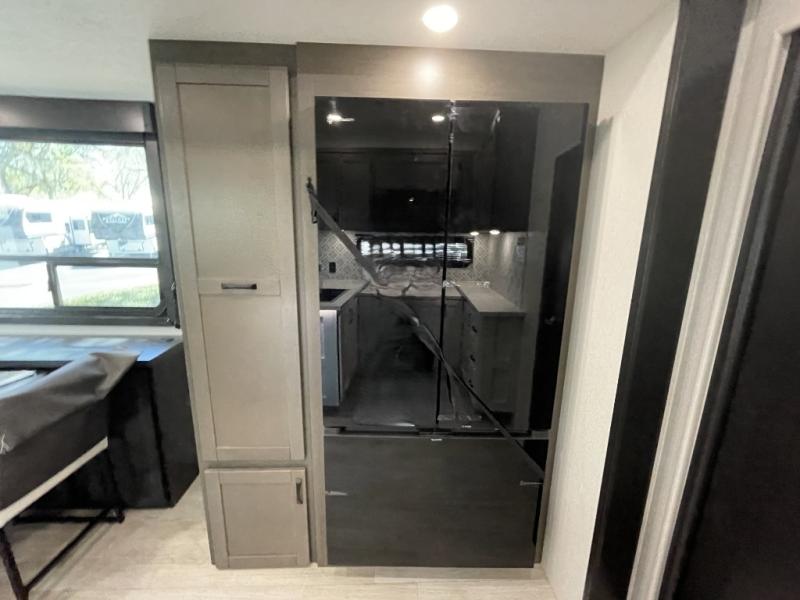 The 13' 6" garage is the perfect space for your toys, with enough room for your ATV, motorcycle, or other gear. Plus, the electric queen bed provides a comfortable spot to rest after a long day. The overhead loft with storage provides additional space for your gear, keeping it out of the way but still accessible. The kitchen is fully equipped with a microwave, sink, overhead cabinets, pantry, and coffee bar. The L-shaped sofa provides ample seating for relaxation, and the TV is perfectly positioned for viewing. The full bathroom is a welcome convenience, providing a private space to freshen up. Also, the front bedroom is a luxurious retreat, featuring a king bed, a walk-in closet, and drawers, and on the exterior, the two entry/exit doors provide easy access to the outside, making it perfect for loading and unloading your gear.