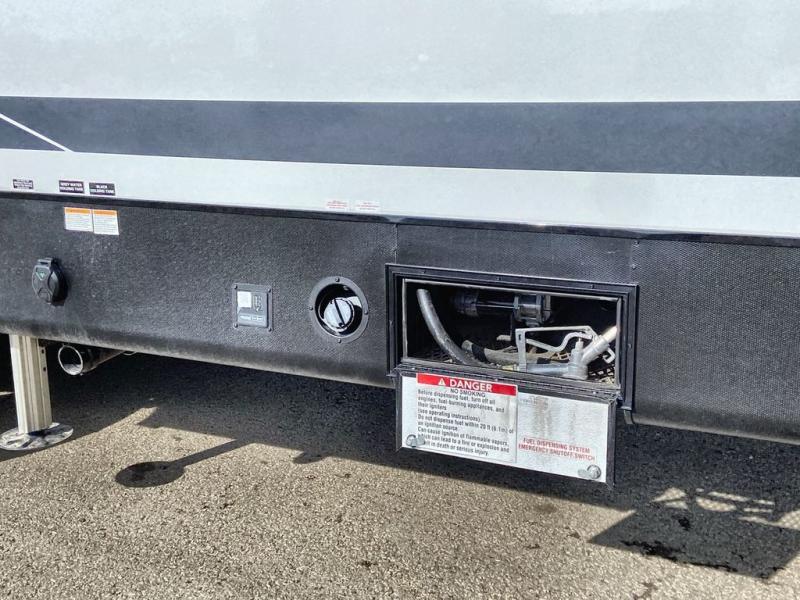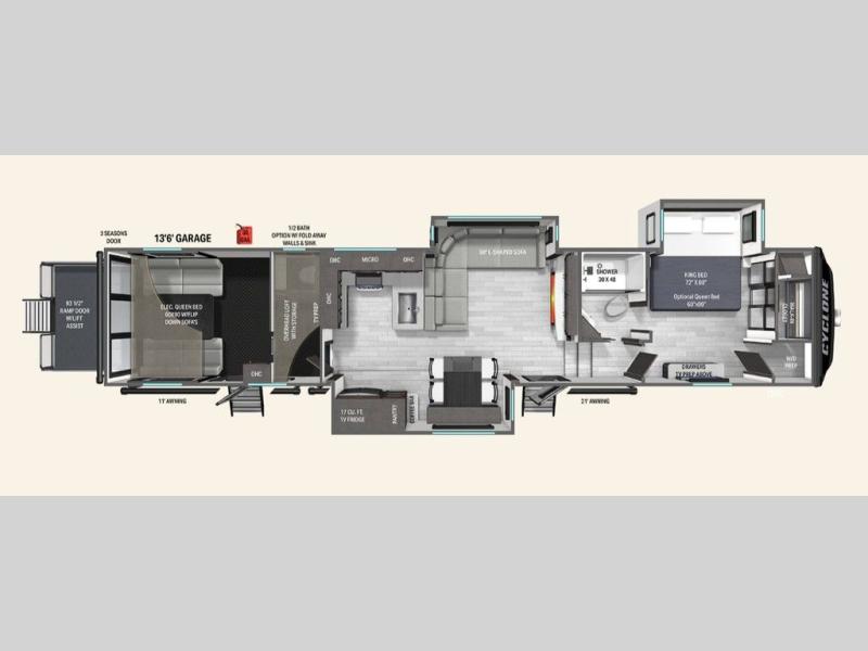 Satisfy your wanderlust with a Heartland Cyclone fifth wheel toy hauler! You won't have to sacrifice any luxury either, with indulgent features like the ducted, fully enclosed, and heated underbelly provides added protection and warmth. Inside, the LED interior lighting throughout ensures that every corner of your RV is bright and inviting, and the bathroom skylight brings in natural light and fresh air, creating a welcoming and refreshing space. Plus, the central command center with built-in tank monitoring keeps you informed and in control, making it easy to manage your resources. Also, the Premium Exterior Package includes diverse features such as Dexter axles with ABS and tow assist with sway mitigation, and the Keyed-Alike lock system ensures that all your locks are keyed the same, providing added security and convenience. Come find the perfect model for you today!