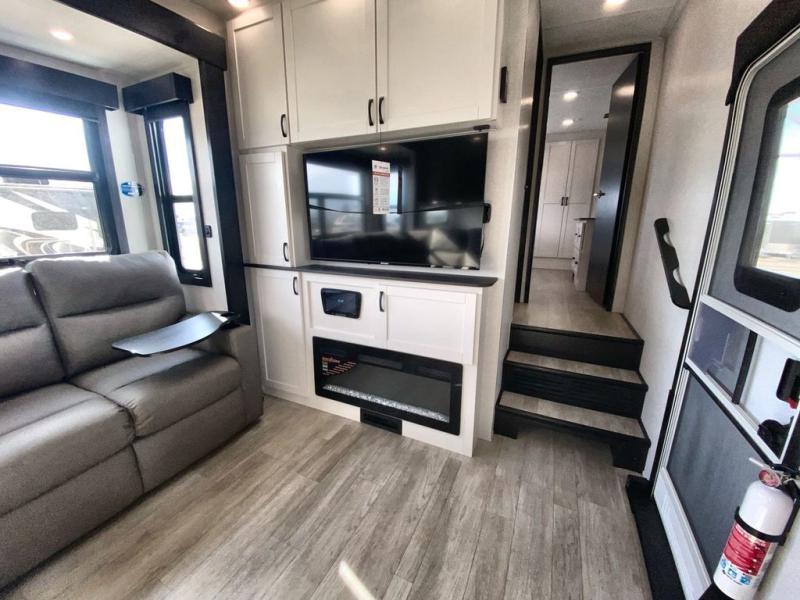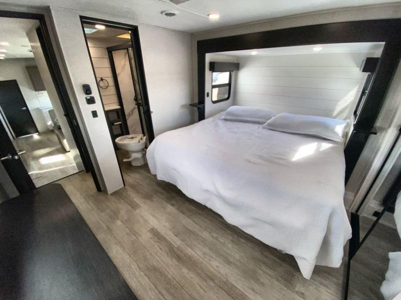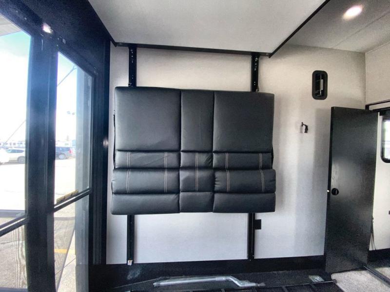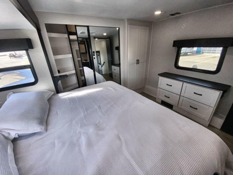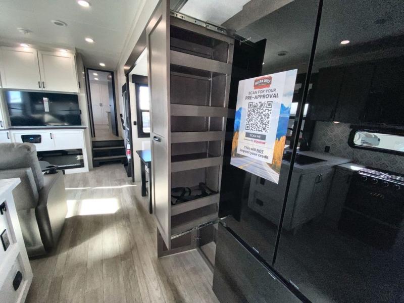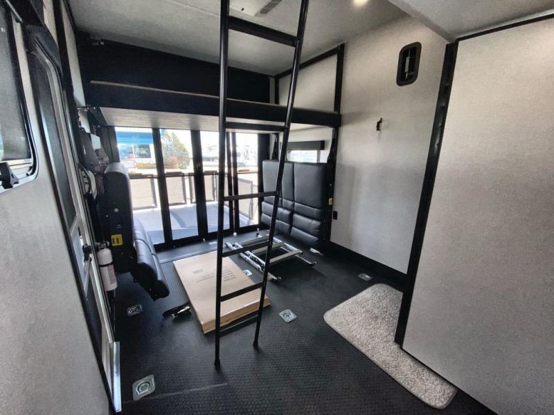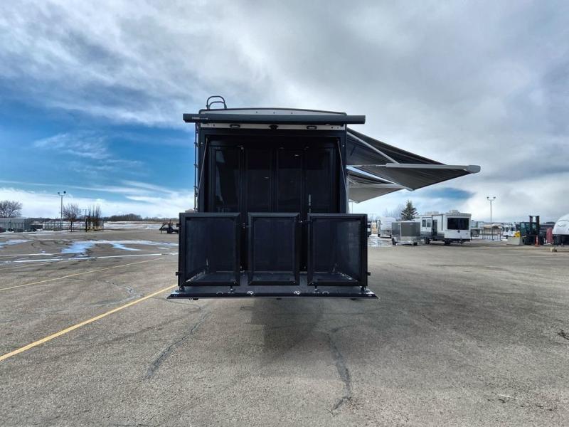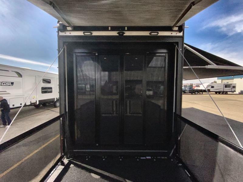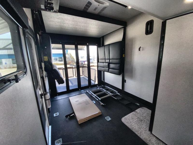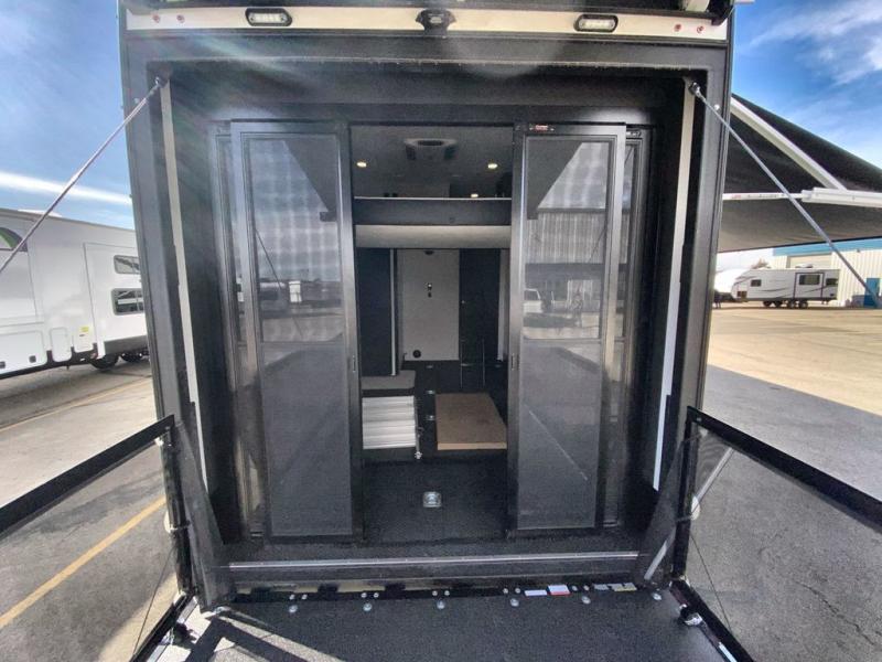 The 13' 6" garage is the perfect space for your toys, with enough room for your ATV, motorcycle, or other gear. Plus, the electric queen bed provides a comfortable spot to rest after a long day. The overhead loft with storage provides additional space for your gear, keeping it out of the way but still accessible. The kitchen is fully equipped with a microwave, sink, overhead cabinets, pantry, and coffee bar. The L-shaped sofa provides ample seating for relaxation, and the TV is perfectly positioned for viewing. The full bathroom is a welcome convenience, providing a private space to freshen up. Also, the front bedroom is a luxurious retreat, featuring a king bed, a walk-in closet, and drawers, and on the exterior, the two entry/exit doors provide easy access to the outside, making it perfect for loading and unloading your gear.