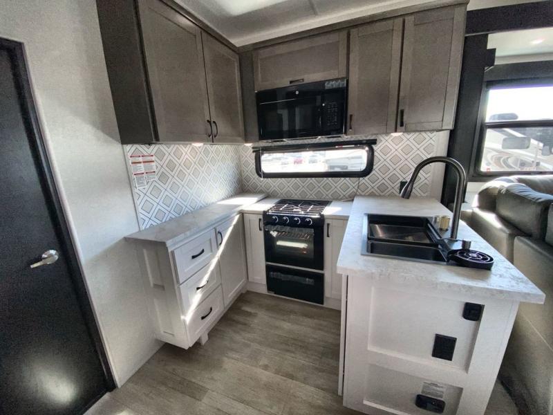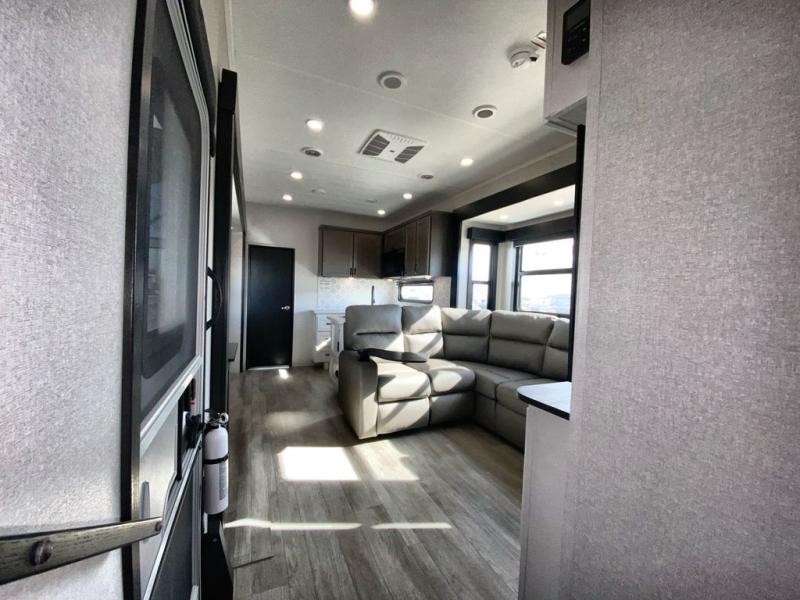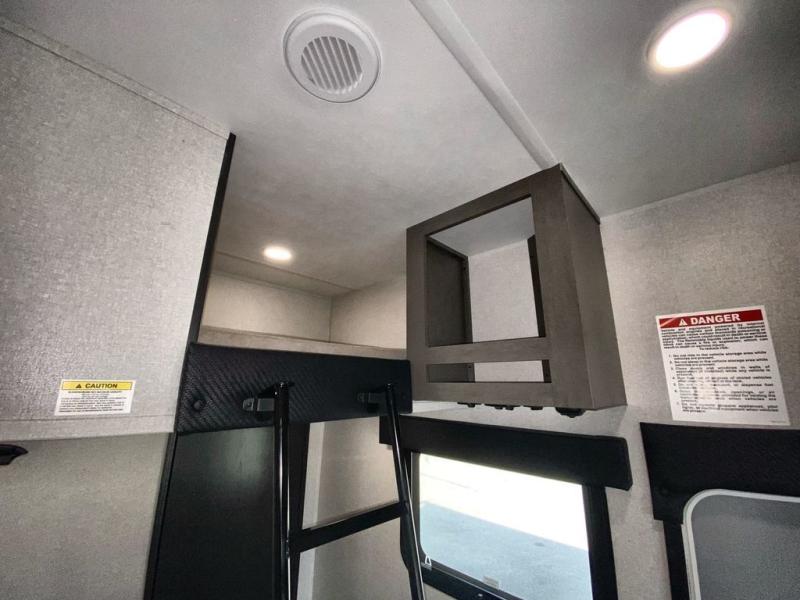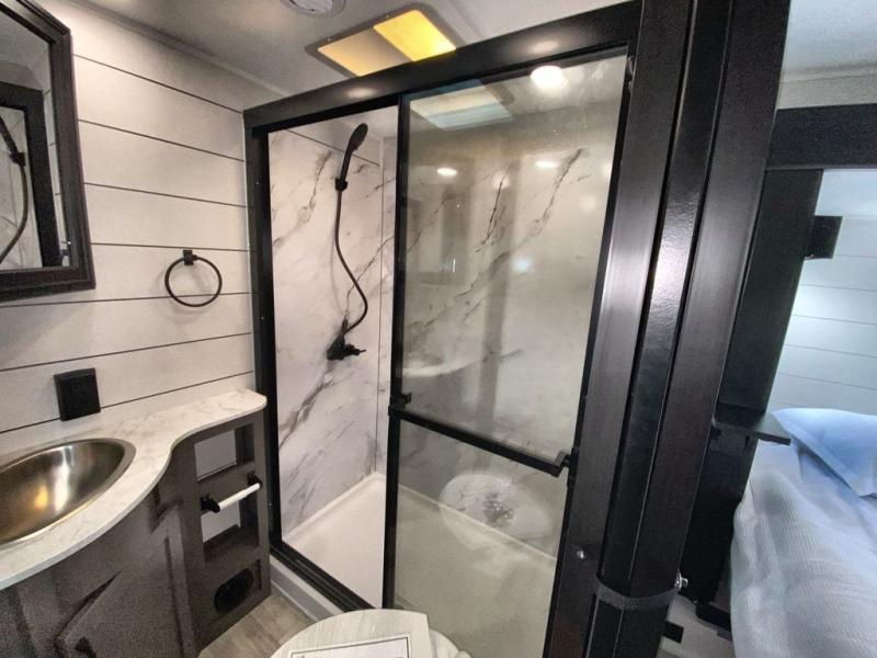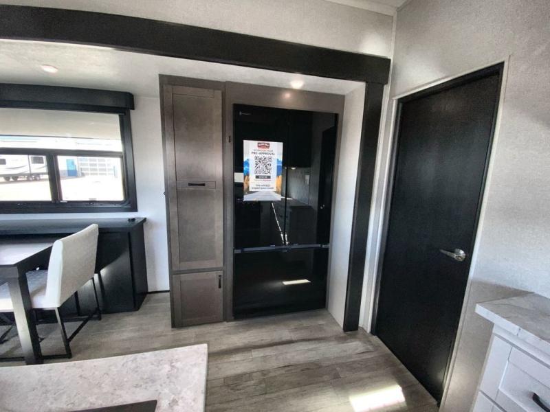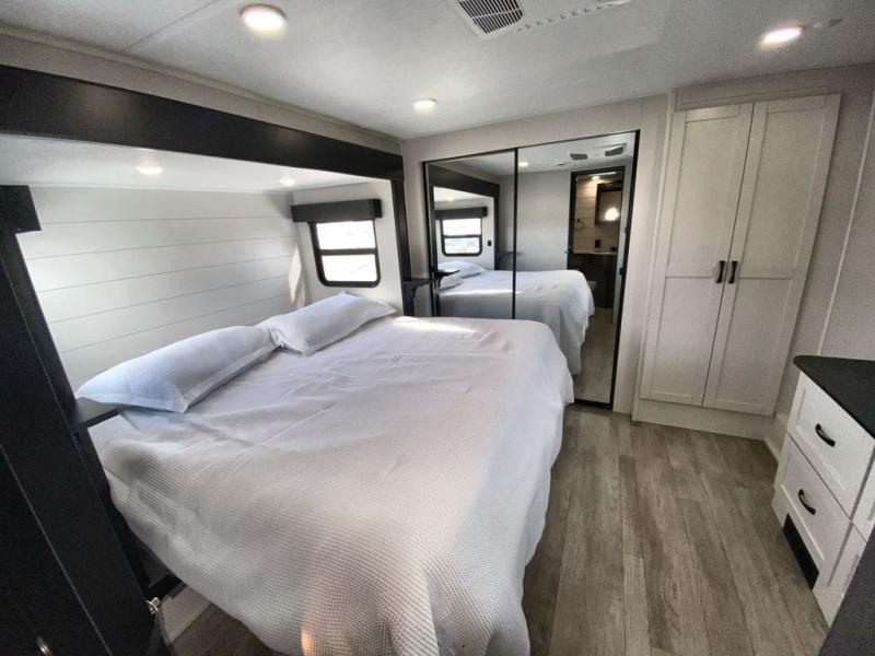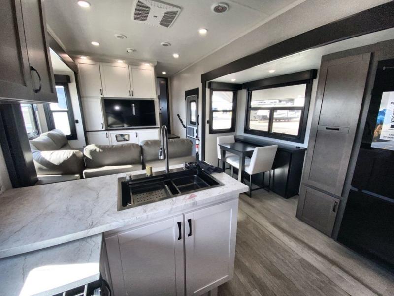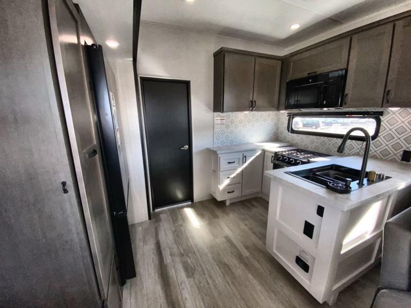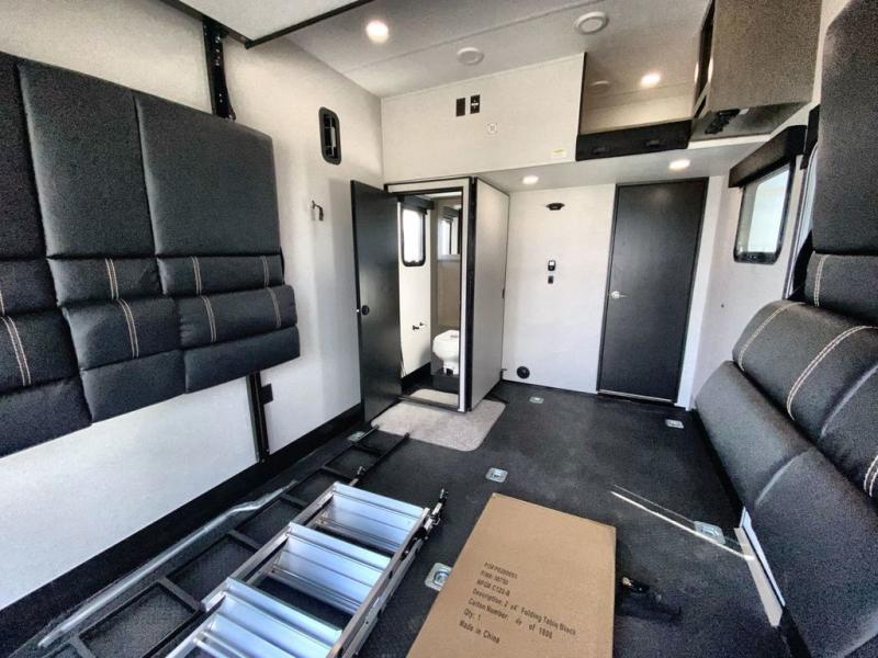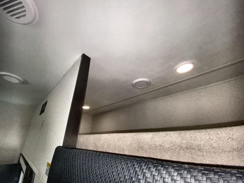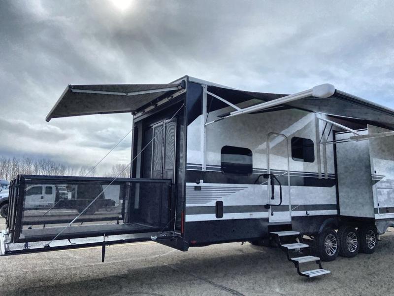 The 13' 6" garage is the perfect space for your toys, with enough room for your ATV, motorcycle, or other gear. Plus, the electric queen bed provides a comfortable spot to rest after a long day. The overhead loft with storage provides additional space for your gear, keeping it out of the way but still accessible. The kitchen is fully equipped with a microwave, sink, overhead cabinets, pantry, and coffee bar. The L-shaped sofa provides ample seating for relaxation, and the TV is perfectly positioned for viewing. The full bathroom is a welcome convenience, providing a private space to freshen up. Also, the front bedroom is a luxurious retreat, featuring a king bed, a walk-in closet, and drawers, and on the exterior, the two entry/exit doors provide easy access to the outside, making it perfect for loading and unloading your gear.