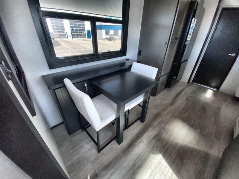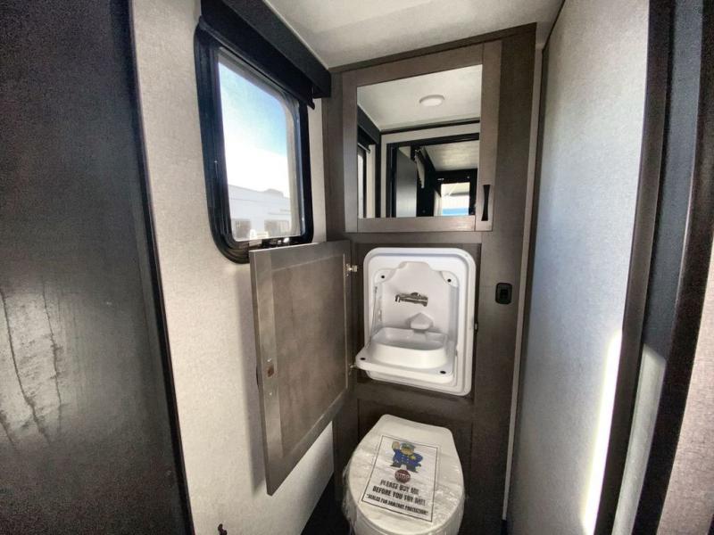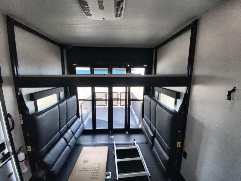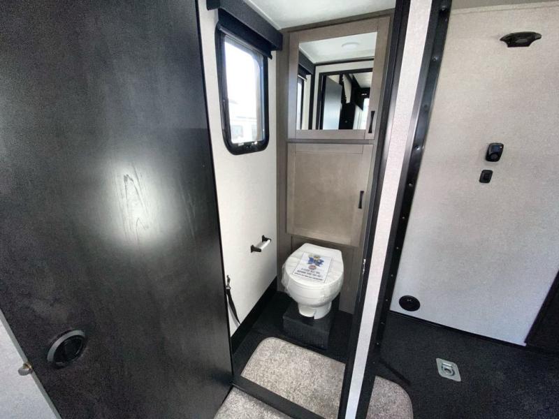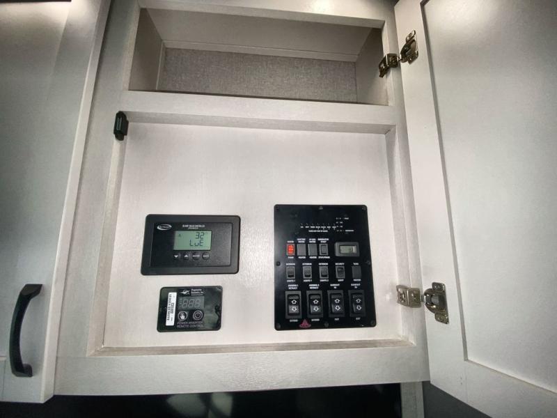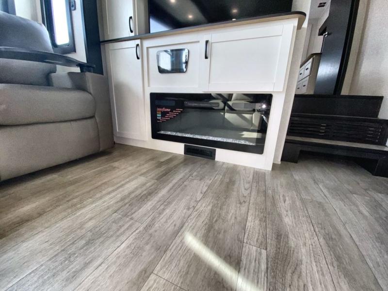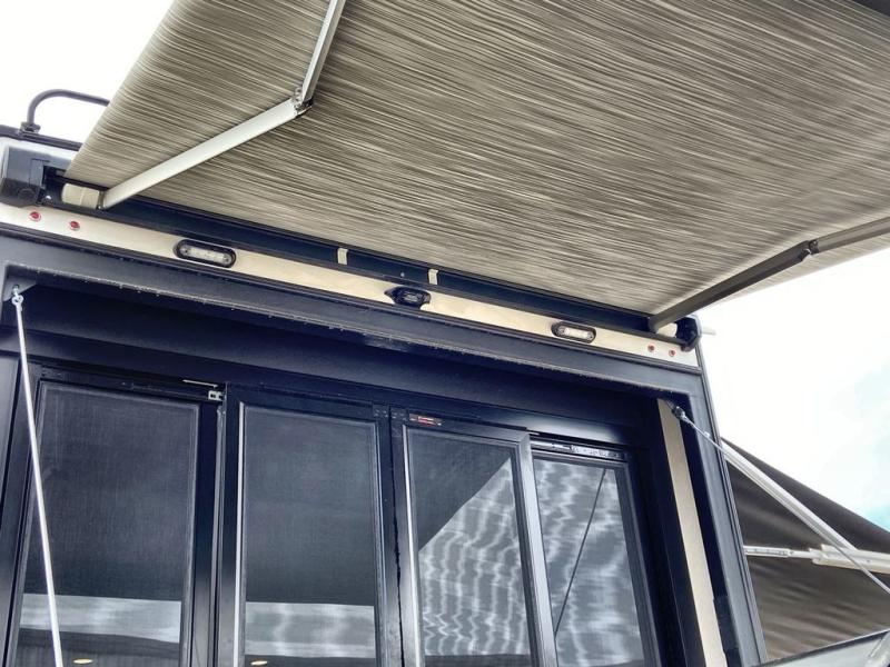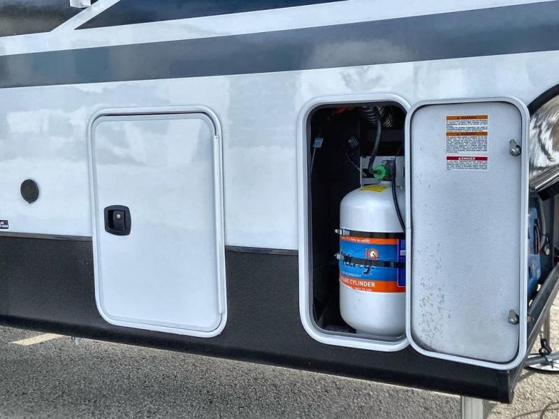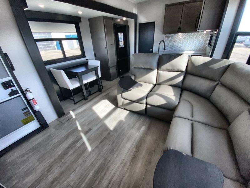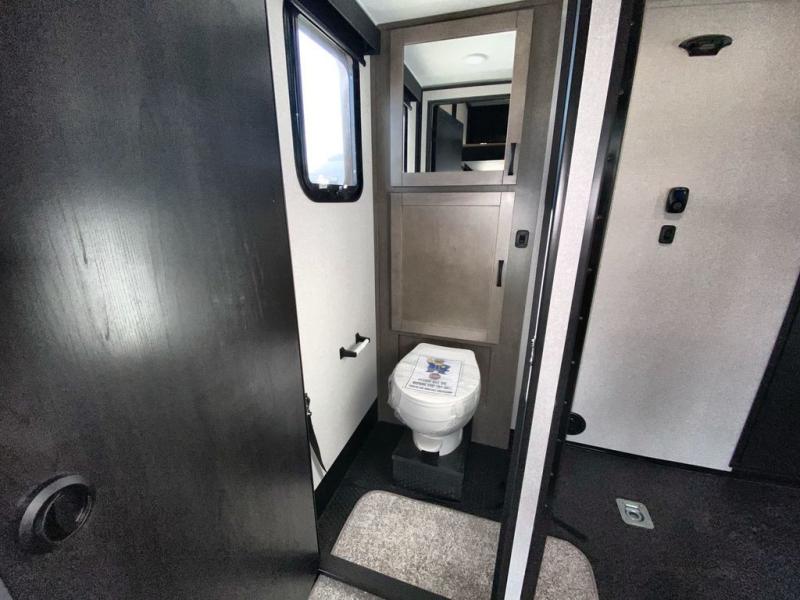 The 13' 6" garage is the perfect space for your toys, with enough room for your ATV, motorcycle, or other gear. Plus, the electric queen bed provides a comfortable spot to rest after a long day. The overhead loft with storage provides additional space for your gear, keeping it out of the way but still accessible. The kitchen is fully equipped with a microwave, sink, overhead cabinets, pantry, and coffee bar. The L-shaped sofa provides ample seating for relaxation, and the TV is perfectly positioned for viewing. The full bathroom is a welcome convenience, providing a private space to freshen up. Also, the front bedroom is a luxurious retreat, featuring a king bed, a walk-in closet, and drawers, and on the exterior, the two entry/exit doors provide easy access to the outside, making it perfect for loading and unloading your gear.