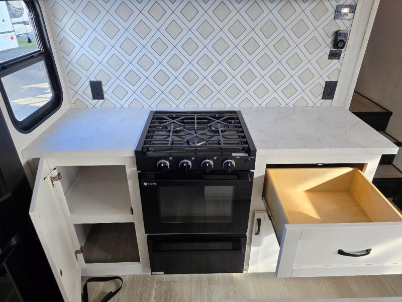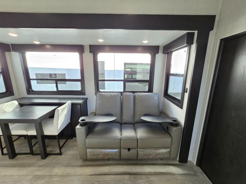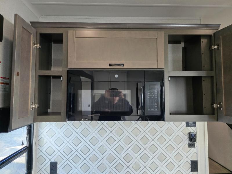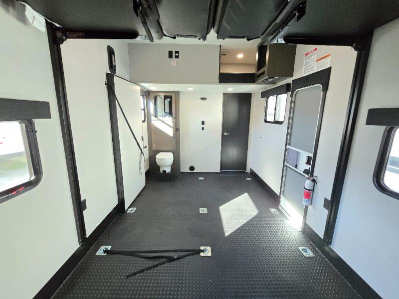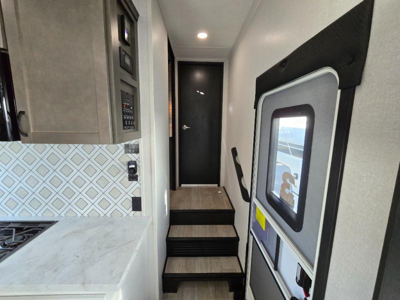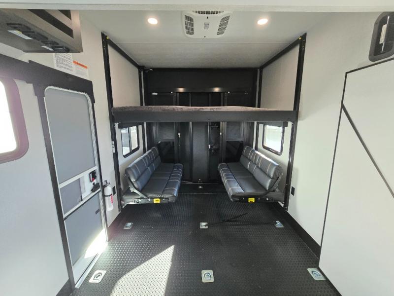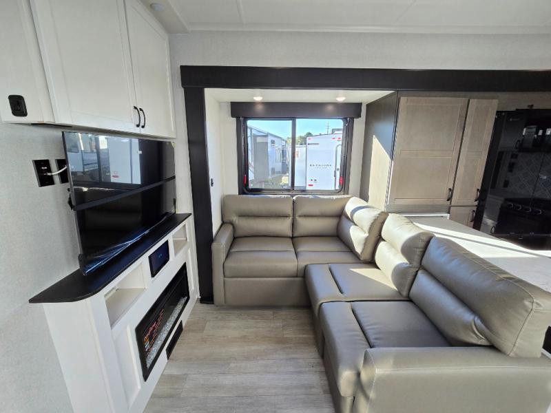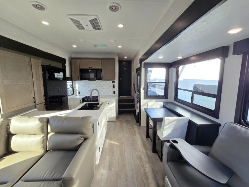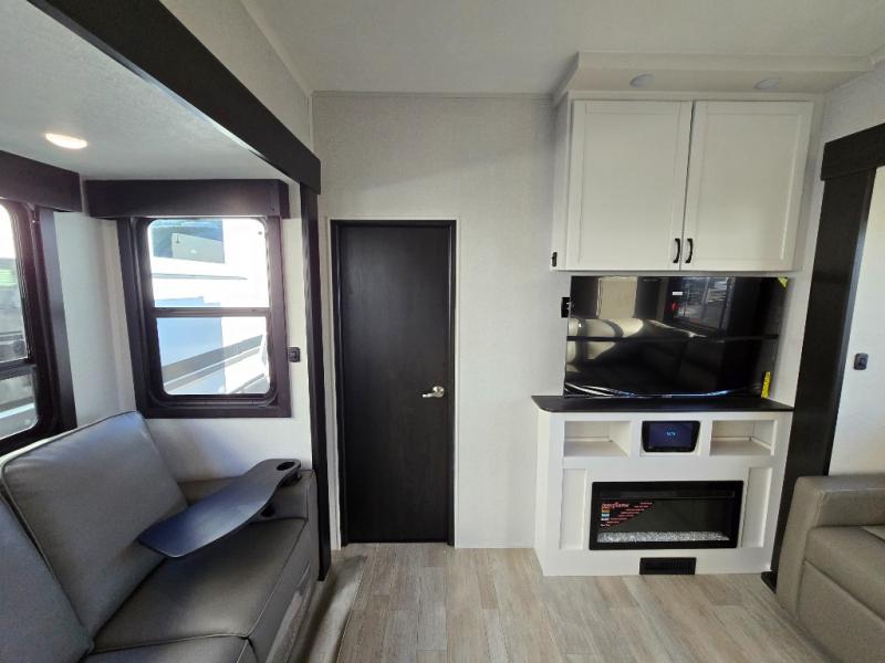 Get on the road with this toy hauler fifth wheel! The 14' garage is a playground for your toys, offering ample space for your ATV, motorcycle, or other gear. The loft above provides additional storage and an electric queen bed for a comfortable rest. The living room is a haven for relaxation, featuring an L-shaped sofa and a theater-style seat perfect for enjoying your favorite shows or movies on the TV. The kitchen is a culinary delight, equipped with a 12V refrigerator, microwave, overhead cabinets, and ample countertop space. The credenza with roll-out table is perfect for meal prep or serving, and the full bathroom provides a private space to freshen up, while the half bath option in the garage gives you more options. The cherry on top is that the front bedroom is a regal retreat, featuring a king bed, drawers, and a spacious walk-in closet.