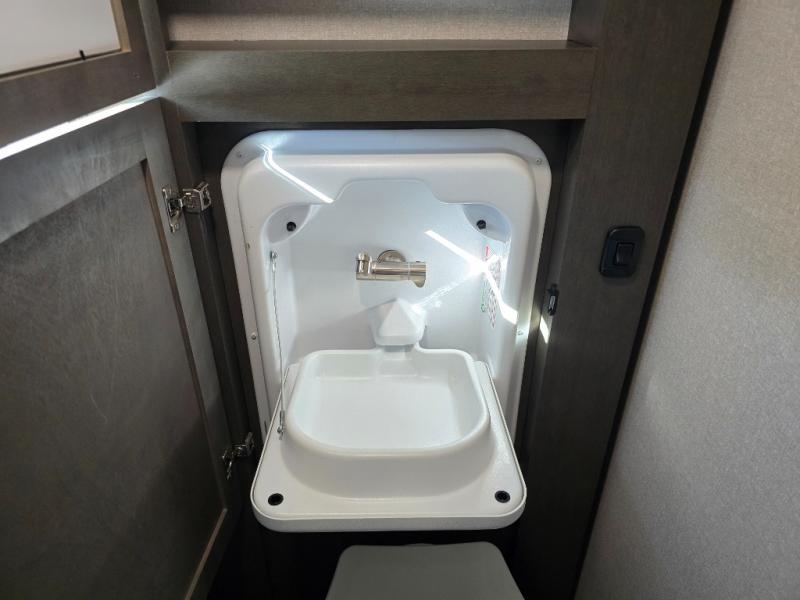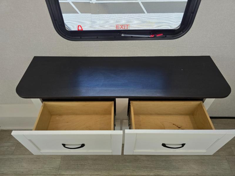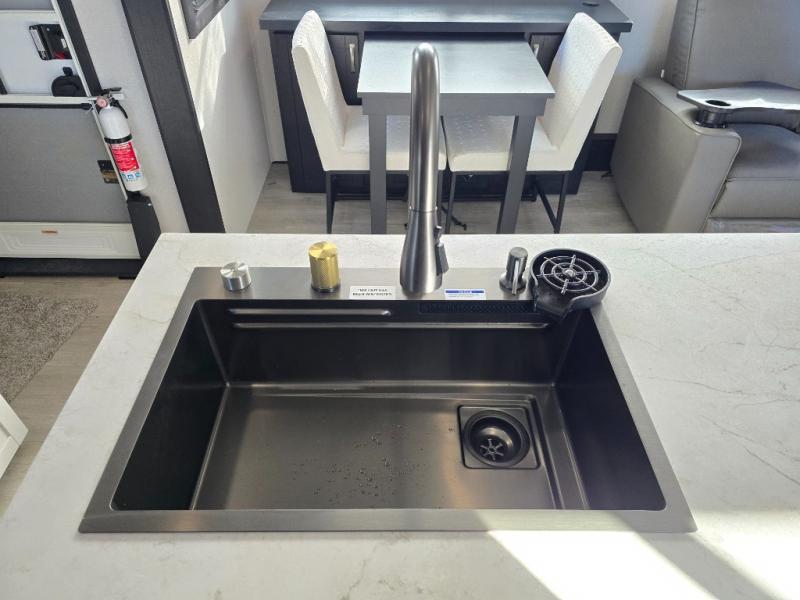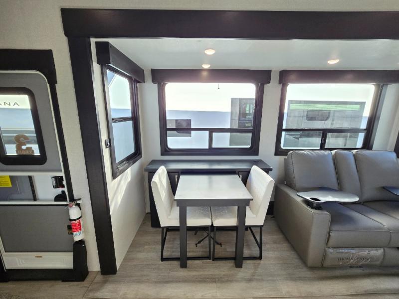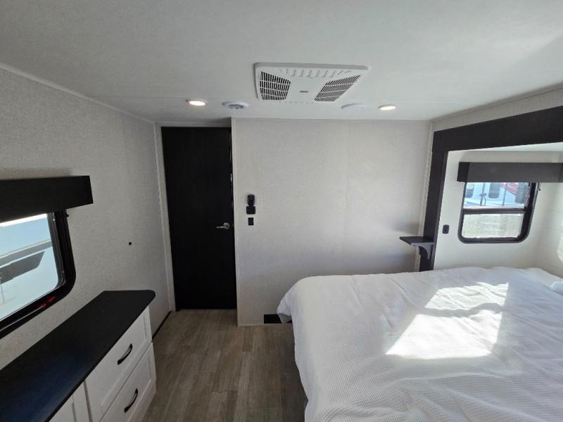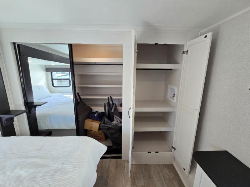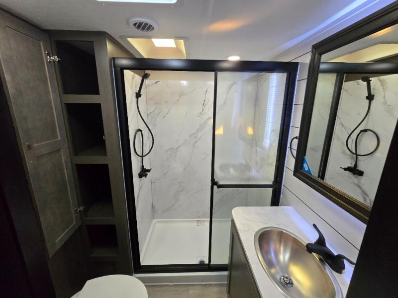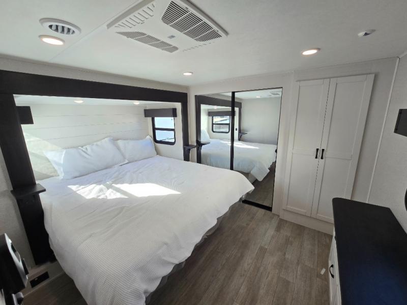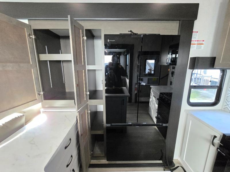Get on the road with this toy hauler fifth wheel! The 14' garage is a playground for your toys, offering ample space for your ATV, motorcycle, or other gear. The loft above provides additional storage and an electric queen bed for a comfortable rest. The living room is a haven for relaxation, featuring an L-shaped sofa and a theater-style seat perfect for enjoying your favorite shows or movies on the TV. The kitchen is a culinary delight, equipped with a 12V refrigerator, microwave, overhead cabinets, and ample countertop space. The credenza with roll-out table is perfect for meal prep or serving, and the full bathroom provides a private space to freshen up, while the half bath option in the garage gives you more options. The cherry on top is that the front bedroom is a regal retreat, featuring a king bed, drawers, and a spacious walk-in closet.