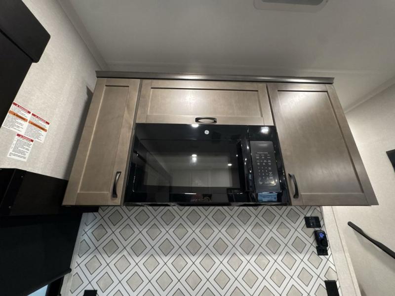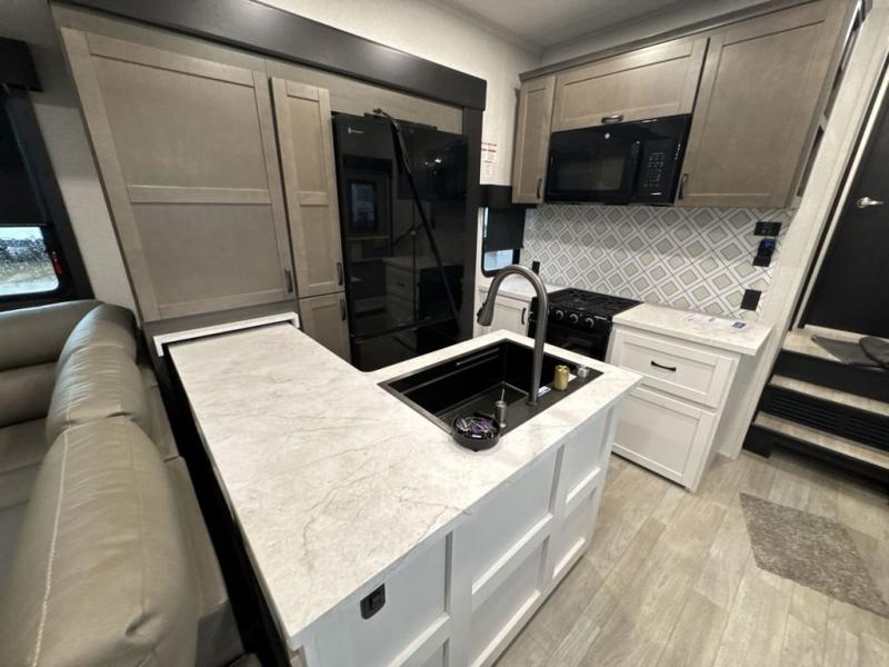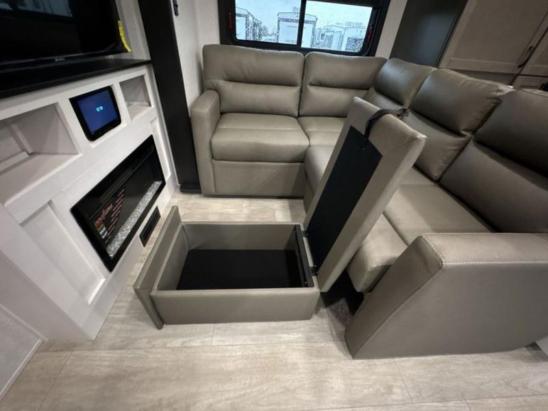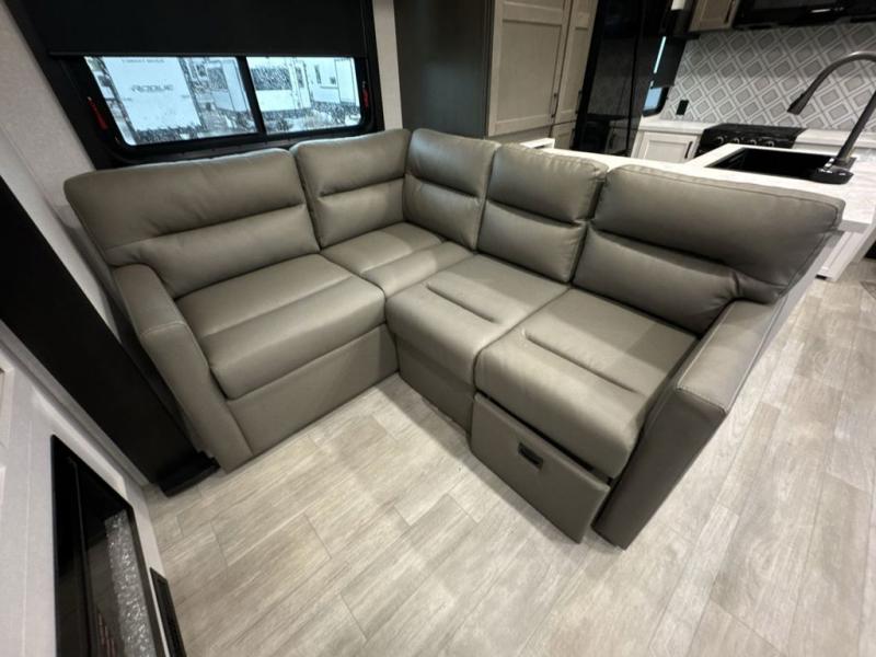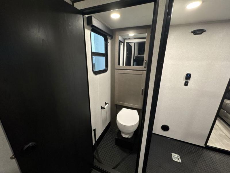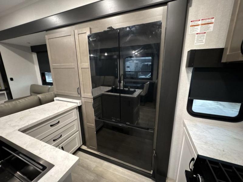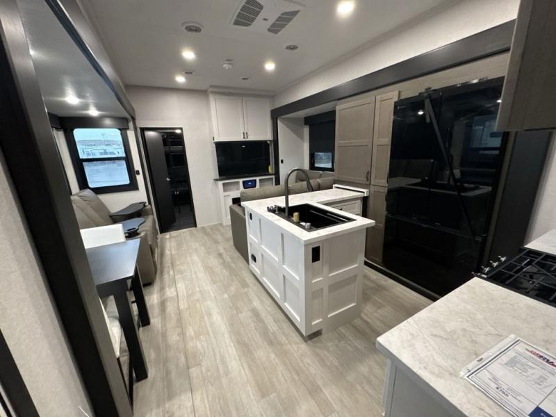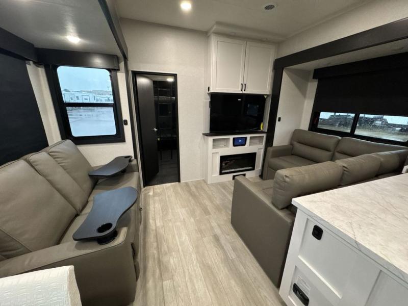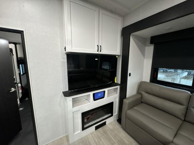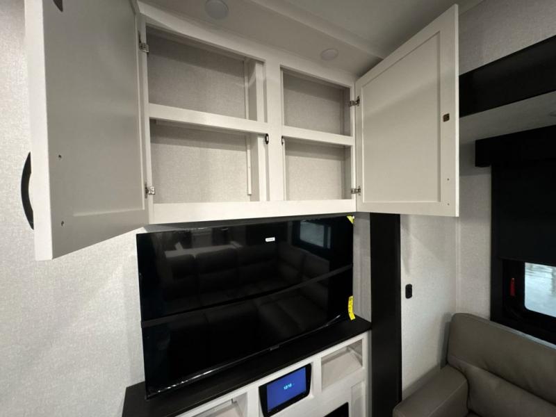 Get on the road with this toy hauler fifth wheel! The 14' garage is a playground for your toys, offering ample space for your ATV, motorcycle, or other gear. The loft above provides additional storage and an electric queen bed for a comfortable rest. The living room is a haven for relaxation, featuring an L-shaped sofa and a theater-style seat perfect for enjoying your favorite shows or movies on the TV. The kitchen is a culinary delight, equipped with a 12V refrigerator, microwave, overhead cabinets, and ample countertop space. The credenza with roll-out table is perfect for meal prep or serving, and the full bathroom provides a private space to freshen up, while the half bath option in the garage gives you more options. The cherry on top is that the front bedroom is a regal retreat, featuring a king bed, drawers, and a spacious walk-in closet.