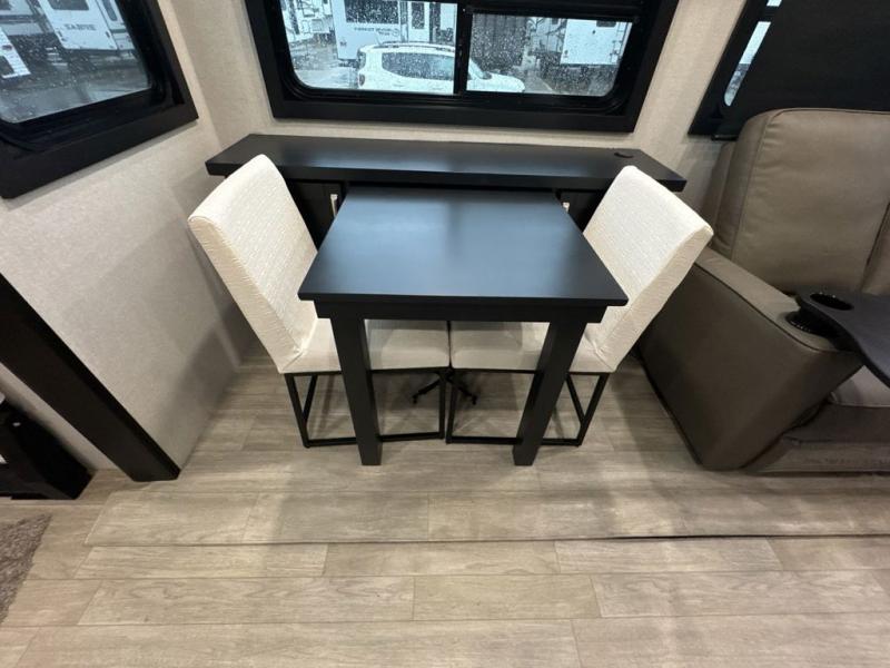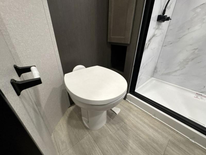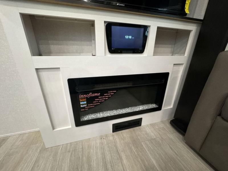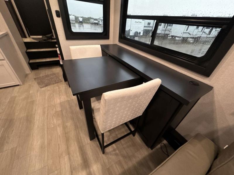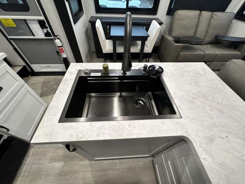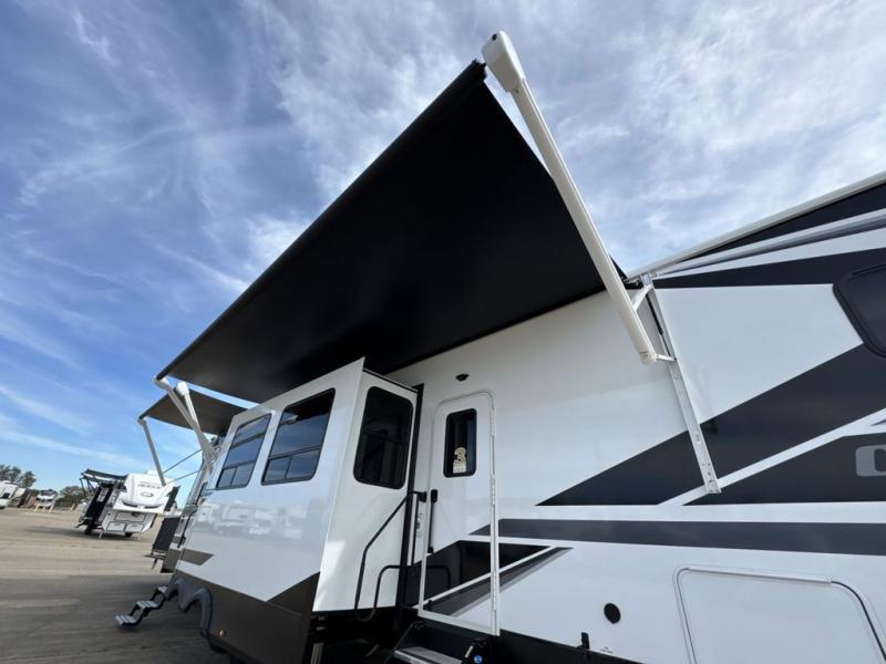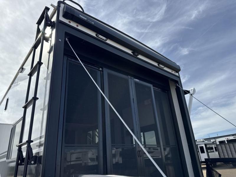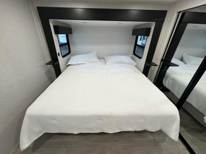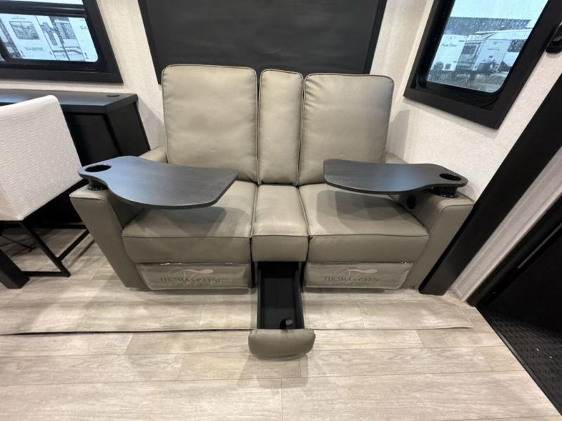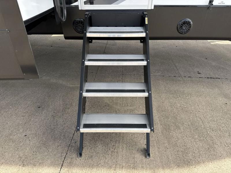 Get on the road with this toy hauler fifth wheel! The 14' garage is a playground for your toys, offering ample space for your ATV, motorcycle, or other gear. The loft above provides additional storage and an electric queen bed for a comfortable rest. The living room is a haven for relaxation, featuring an L-shaped sofa and a theater-style seat perfect for enjoying your favorite shows or movies on the TV. The kitchen is a culinary delight, equipped with a 12V refrigerator, microwave, overhead cabinets, and ample countertop space. The credenza with roll-out table is perfect for meal prep or serving, and the full bathroom provides a private space to freshen up, while the half bath option in the garage gives you more options. The cherry on top is that the front bedroom is a regal retreat, featuring a king bed, drawers, and a spacious walk-in closet.