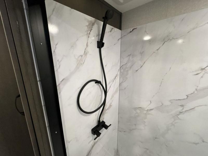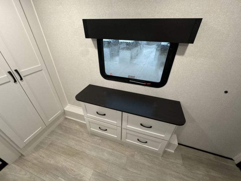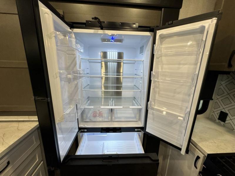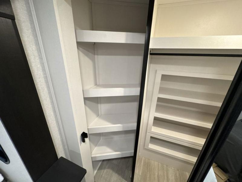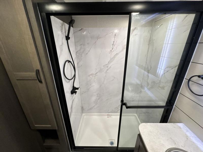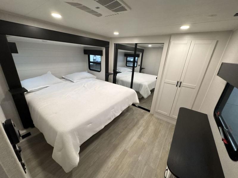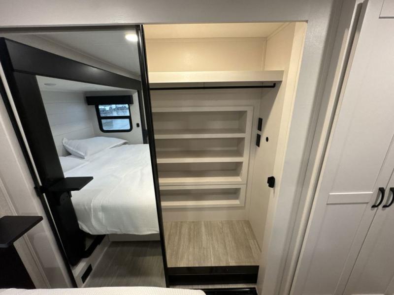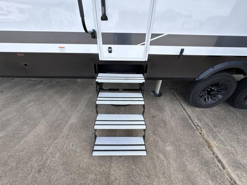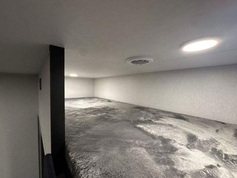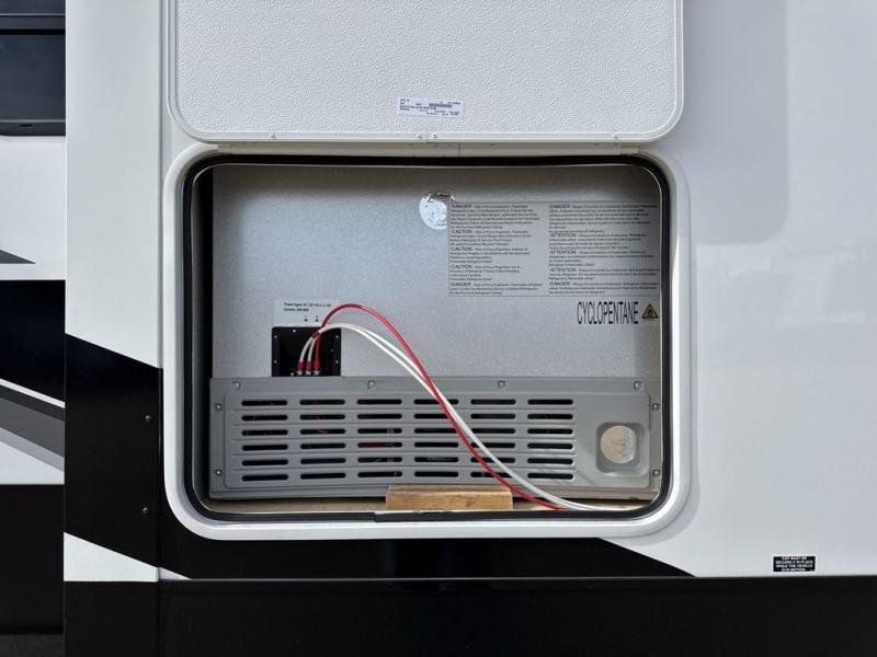 Get on the road with this toy hauler fifth wheel! The 14' garage is a playground for your toys, offering ample space for your ATV, motorcycle, or other gear. The loft above provides additional storage and an electric queen bed for a comfortable rest. The living room is a haven for relaxation, featuring an L-shaped sofa and a theater-style seat perfect for enjoying your favorite shows or movies on the TV. The kitchen is a culinary delight, equipped with a 12V refrigerator, microwave, overhead cabinets, and ample countertop space. The credenza with roll-out table is perfect for meal prep or serving, and the full bathroom provides a private space to freshen up, while the half bath option in the garage gives you more options. The cherry on top is that the front bedroom is a regal retreat, featuring a king bed, drawers, and a spacious walk-in closet.