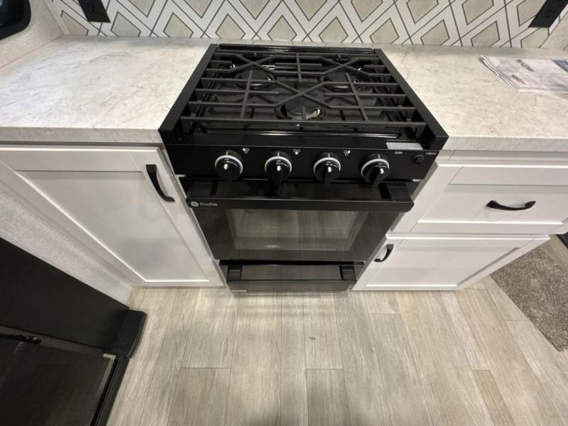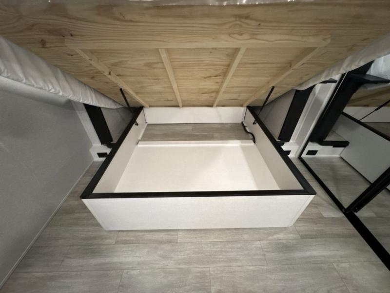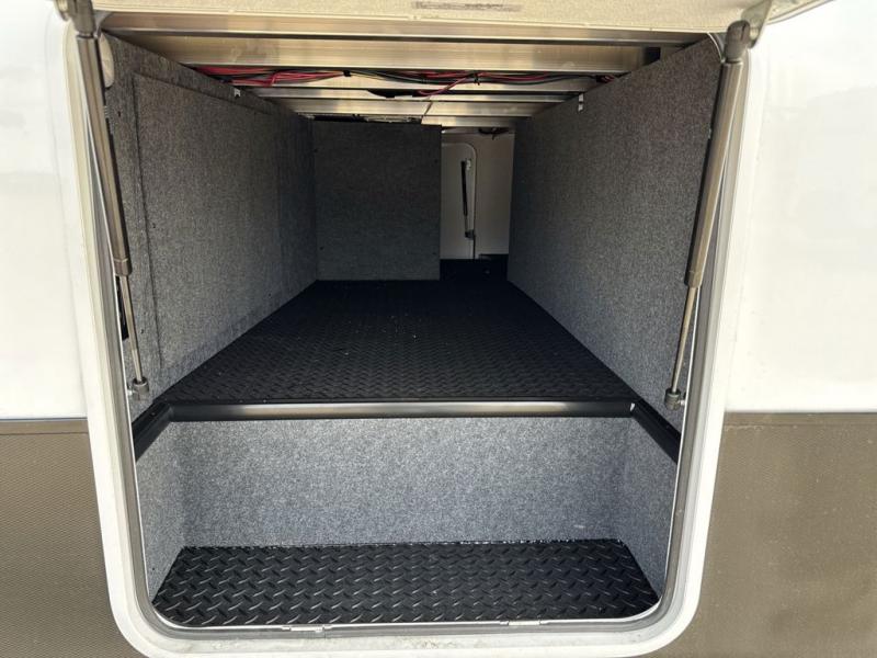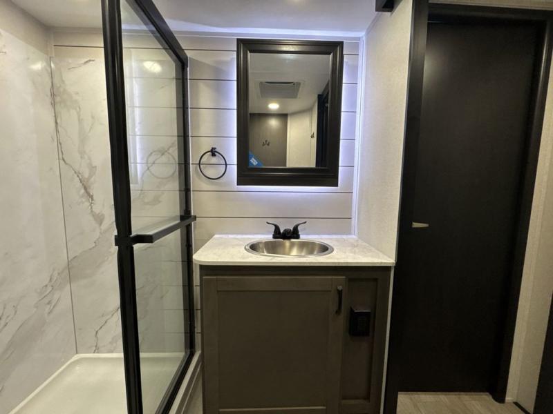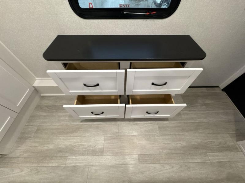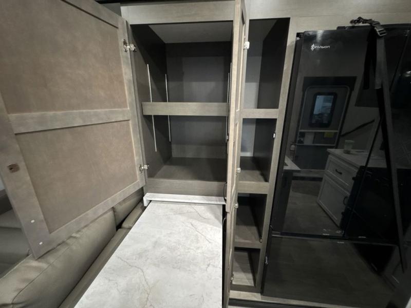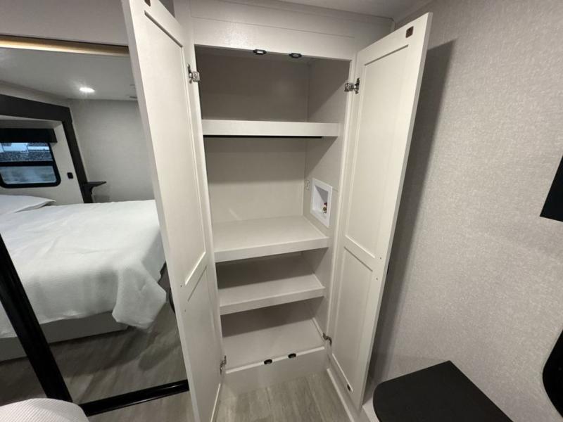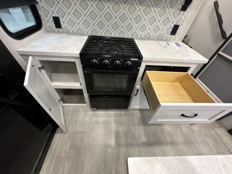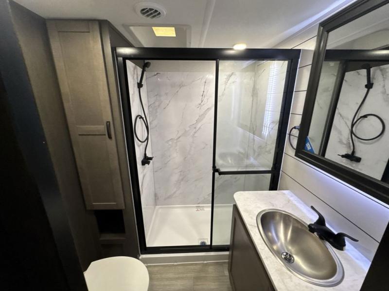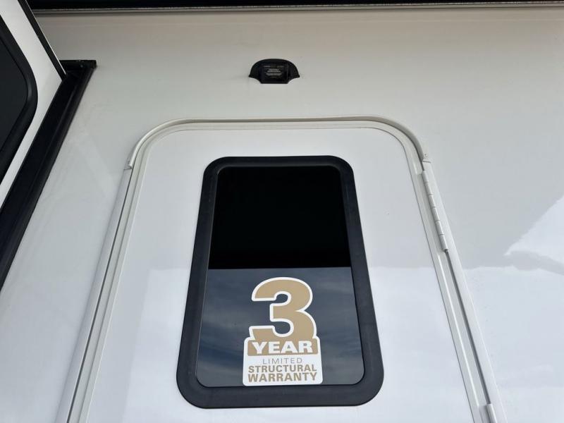 Get on the road with this toy hauler fifth wheel! The 14' garage is a playground for your toys, offering ample space for your ATV, motorcycle, or other gear. The loft above provides additional storage and an electric queen bed for a comfortable rest. The living room is a haven for relaxation, featuring an L-shaped sofa and a theater-style seat perfect for enjoying your favorite shows or movies on the TV. The kitchen is a culinary delight, equipped with a 12V refrigerator, microwave, overhead cabinets, and ample countertop space. The credenza with roll-out table is perfect for meal prep or serving, and the full bathroom provides a private space to freshen up, while the half bath option in the garage gives you more options. The cherry on top is that the front bedroom is a regal retreat, featuring a king bed, drawers, and a spacious walk-in closet.