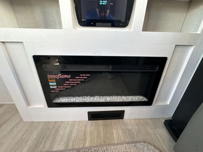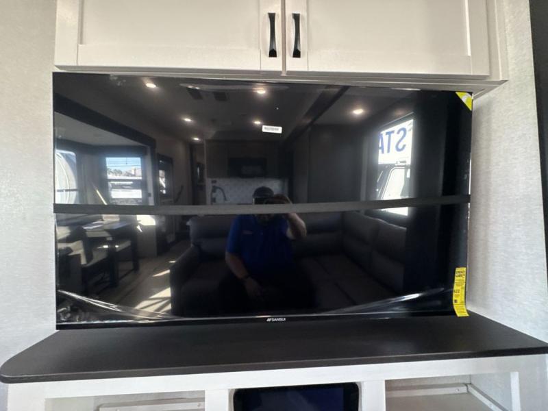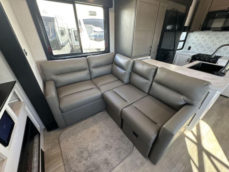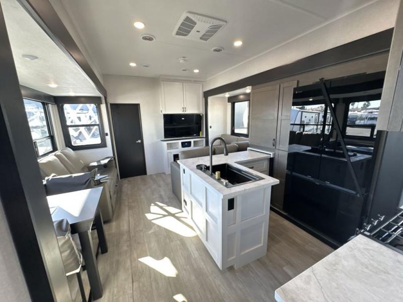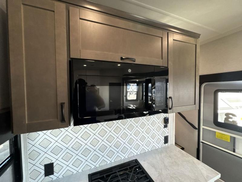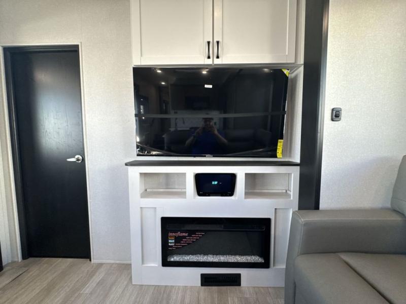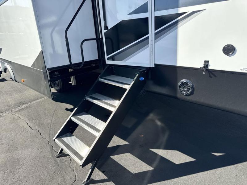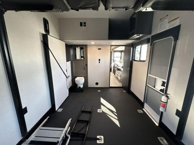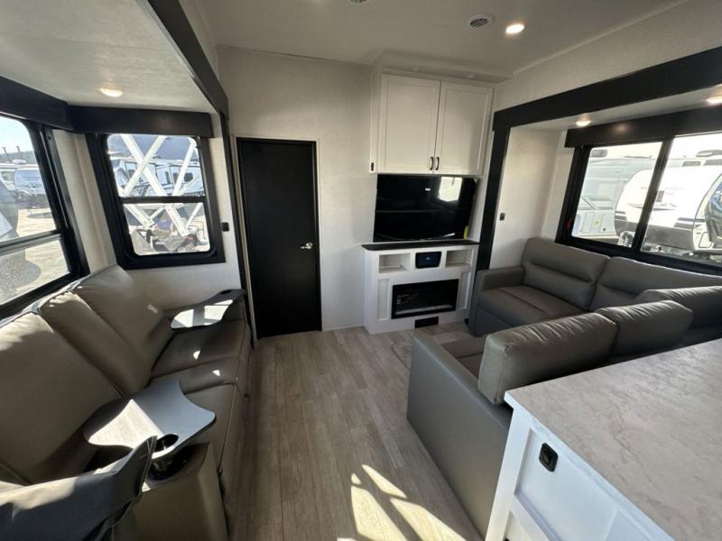 Get on the road with this toy hauler fifth wheel! The 14' garage is a playground for your toys, offering ample space for your ATV, motorcycle, or other gear. The loft above provides additional storage and an electric queen bed for a comfortable rest. The living room is a haven for relaxation, featuring an L-shaped sofa and a theater-style seat perfect for enjoying your favorite shows or movies on the TV. The kitchen is a culinary delight, equipped with a 12V refrigerator, microwave, overhead cabinets, and ample countertop space. The credenza with roll-out table is perfect for meal prep or serving, and the full bathroom provides a private space to freshen up, while the half bath option in the garage gives you more options. The cherry on top is that the front bedroom is a regal retreat, featuring a king bed, drawers, and a spacious walk-in closet.