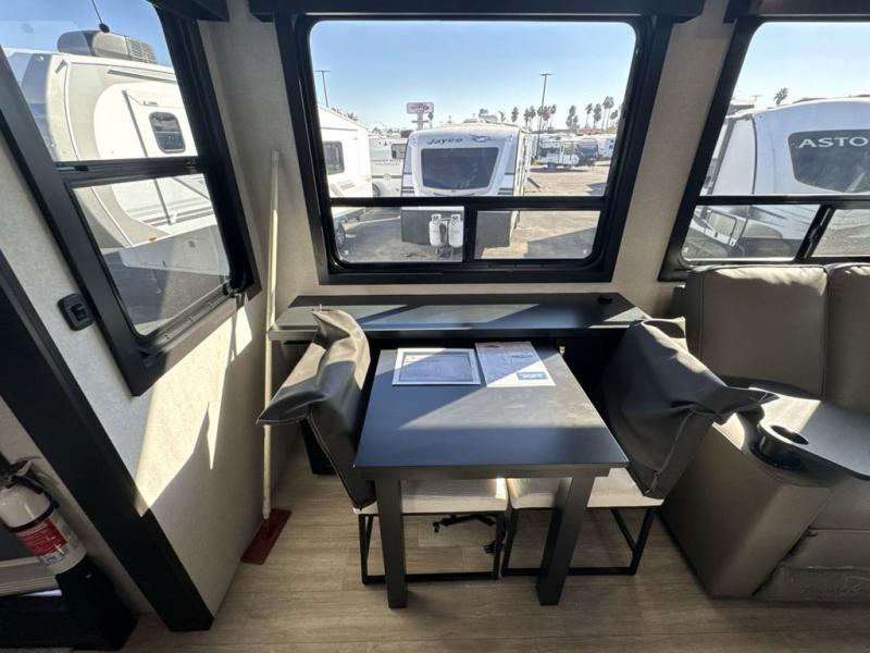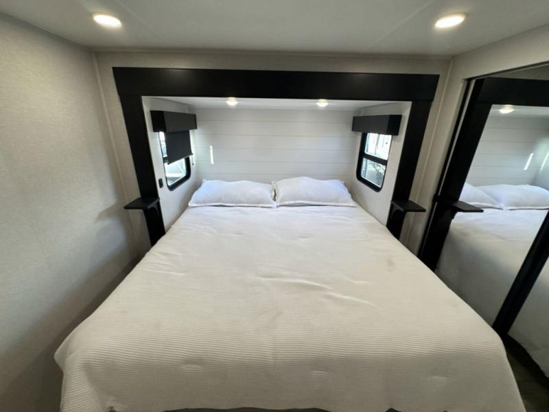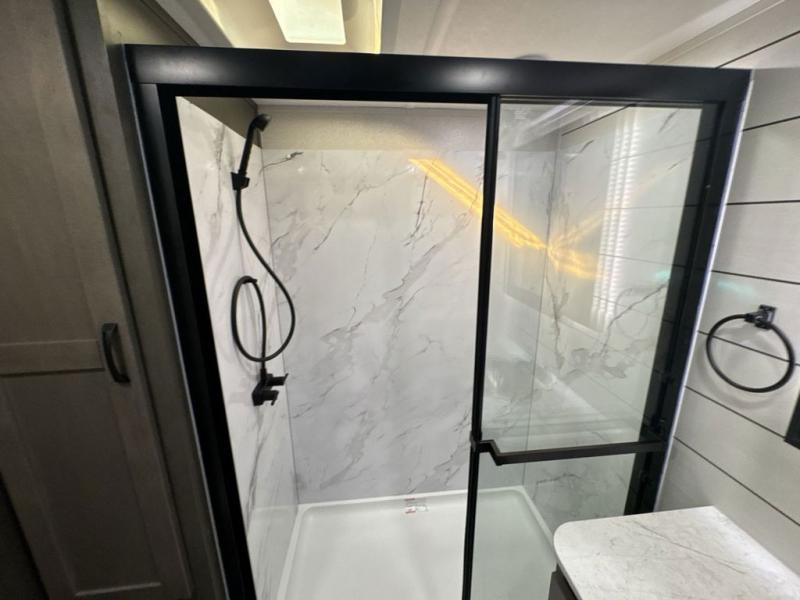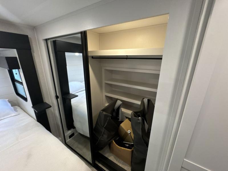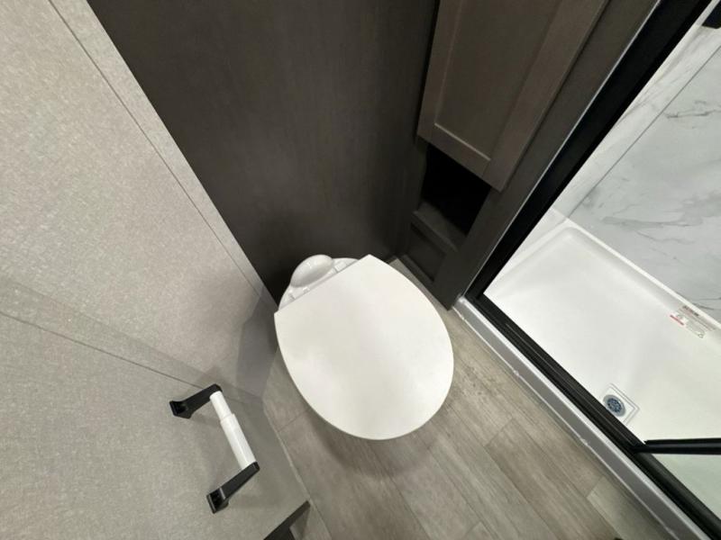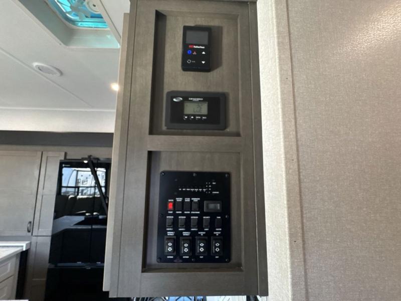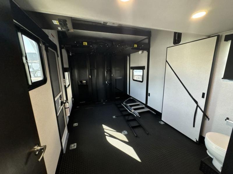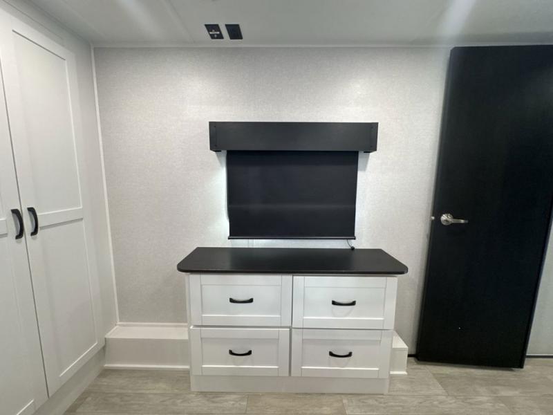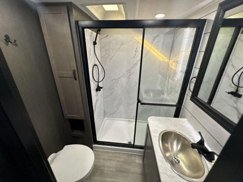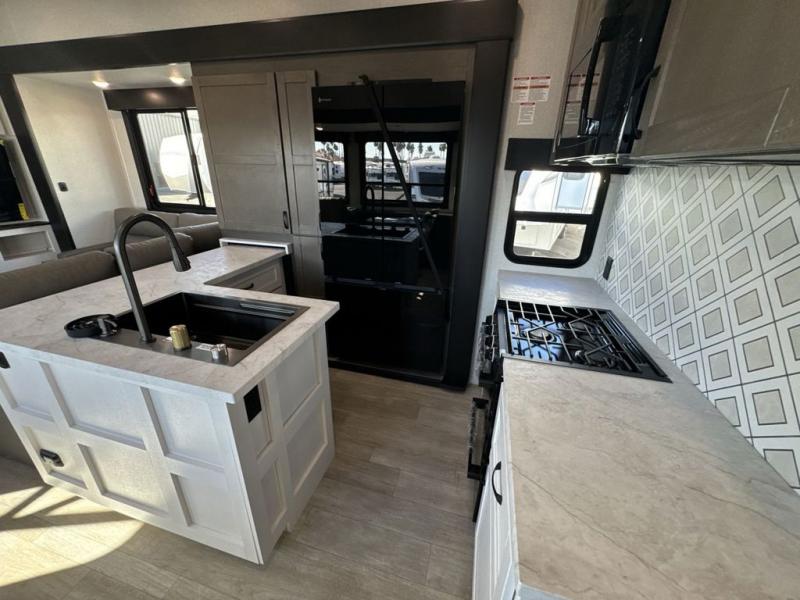 Get on the road with this toy hauler fifth wheel! The 14' garage is a playground for your toys, offering ample space for your ATV, motorcycle, or other gear. The loft above provides additional storage and an electric queen bed for a comfortable rest. The living room is a haven for relaxation, featuring an L-shaped sofa and a theater-style seat perfect for enjoying your favorite shows or movies on the TV. The kitchen is a culinary delight, equipped with a 12V refrigerator, microwave, overhead cabinets, and ample countertop space. The credenza with roll-out table is perfect for meal prep or serving, and the full bathroom provides a private space to freshen up, while the half bath option in the garage gives you more options. The cherry on top is that the front bedroom is a regal retreat, featuring a king bed, drawers, and a spacious walk-in closet.
