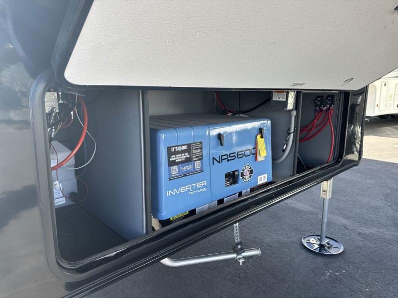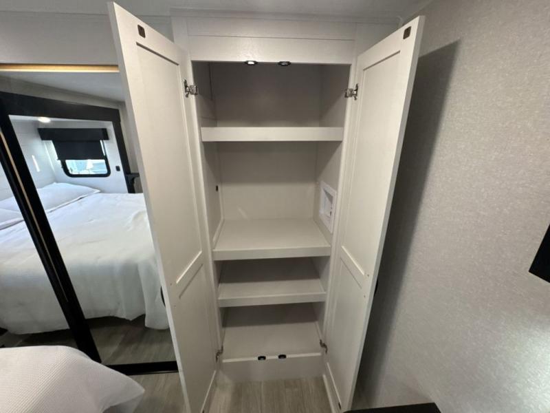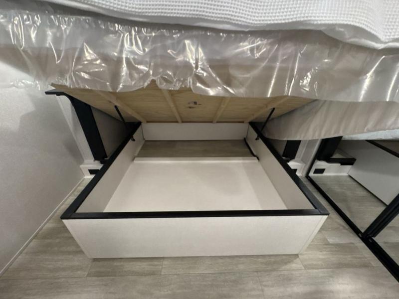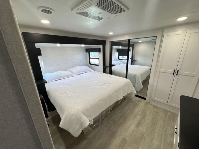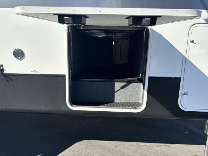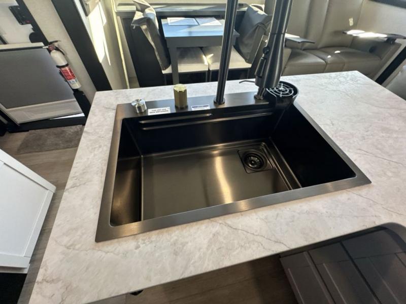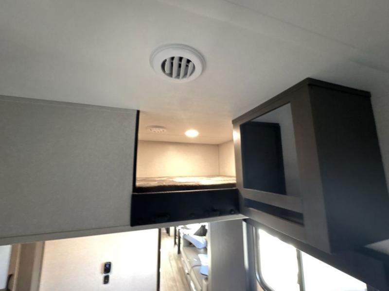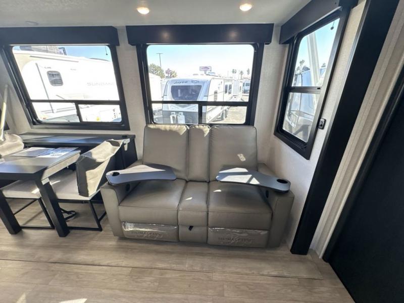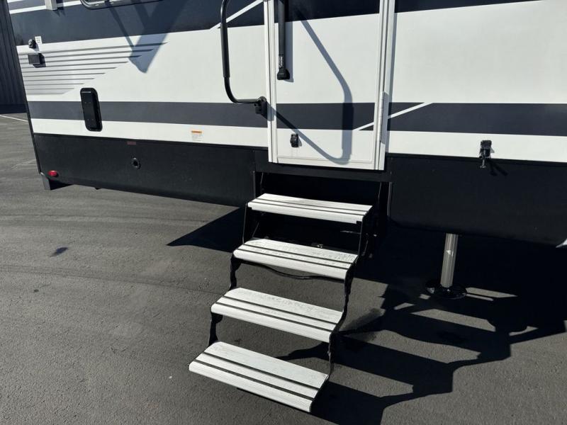 Get on the road with this toy hauler fifth wheel! The 14' garage is a playground for your toys, offering ample space for your ATV, motorcycle, or other gear. The loft above provides additional storage and an electric queen bed for a comfortable rest. The living room is a haven for relaxation, featuring an L-shaped sofa and a theater-style seat perfect for enjoying your favorite shows or movies on the TV. The kitchen is a culinary delight, equipped with a 12V refrigerator, microwave, overhead cabinets, and ample countertop space. The credenza with roll-out table is perfect for meal prep or serving, and the full bathroom provides a private space to freshen up, while the half bath option in the garage gives you more options. The cherry on top is that the front bedroom is a regal retreat, featuring a king bed, drawers, and a spacious walk-in closet.