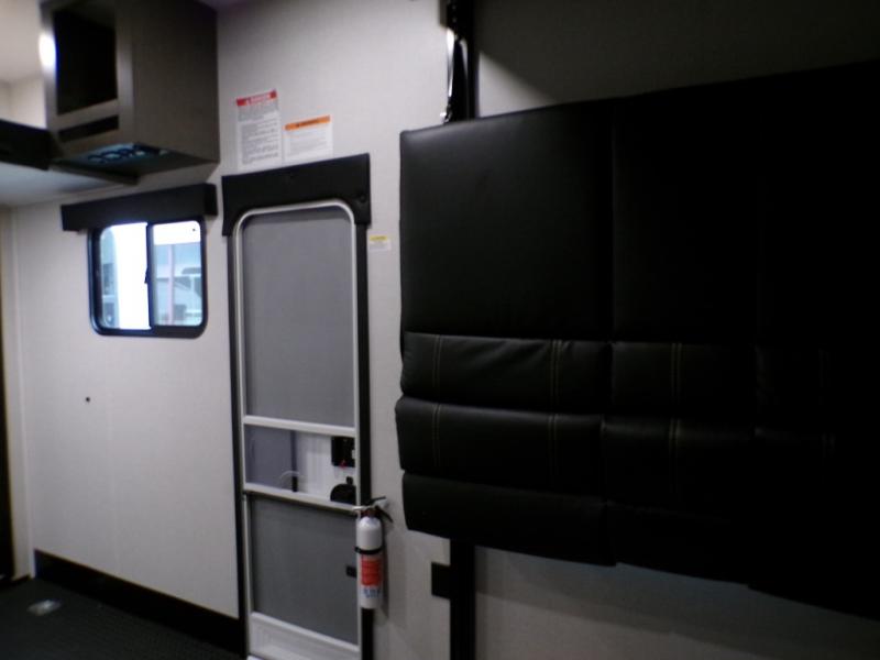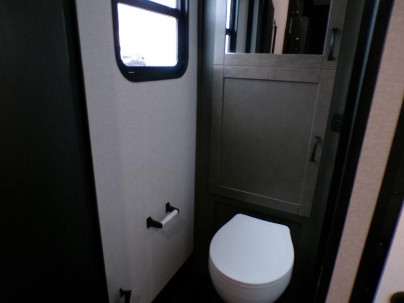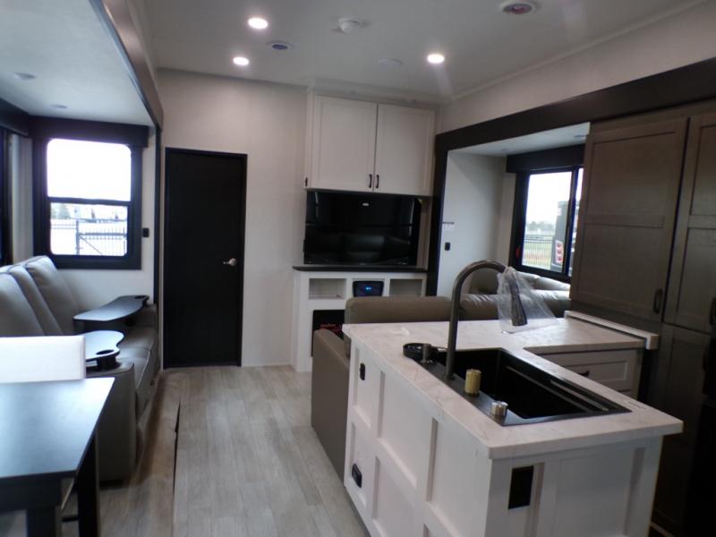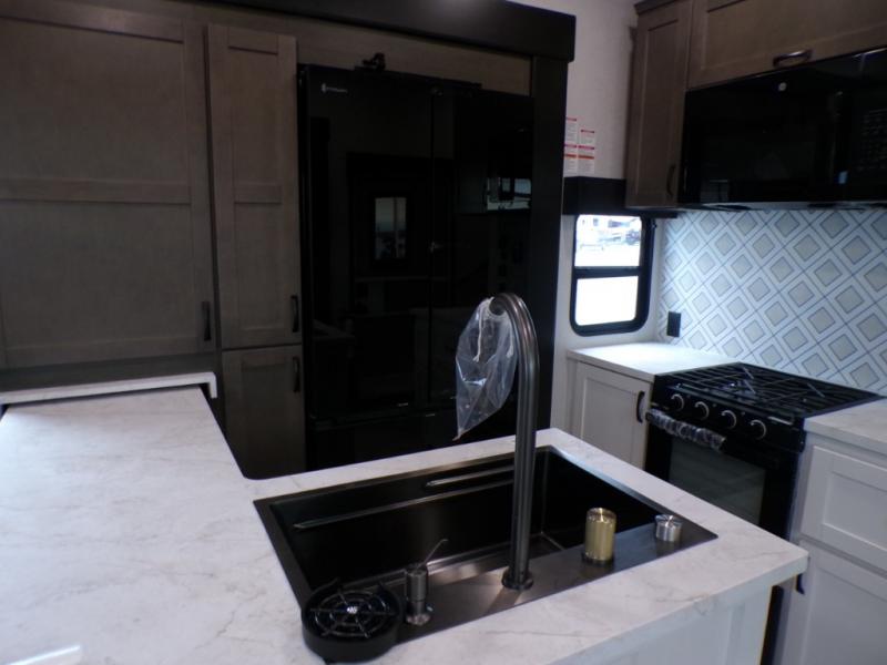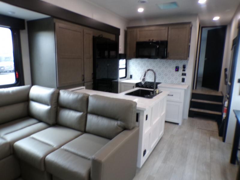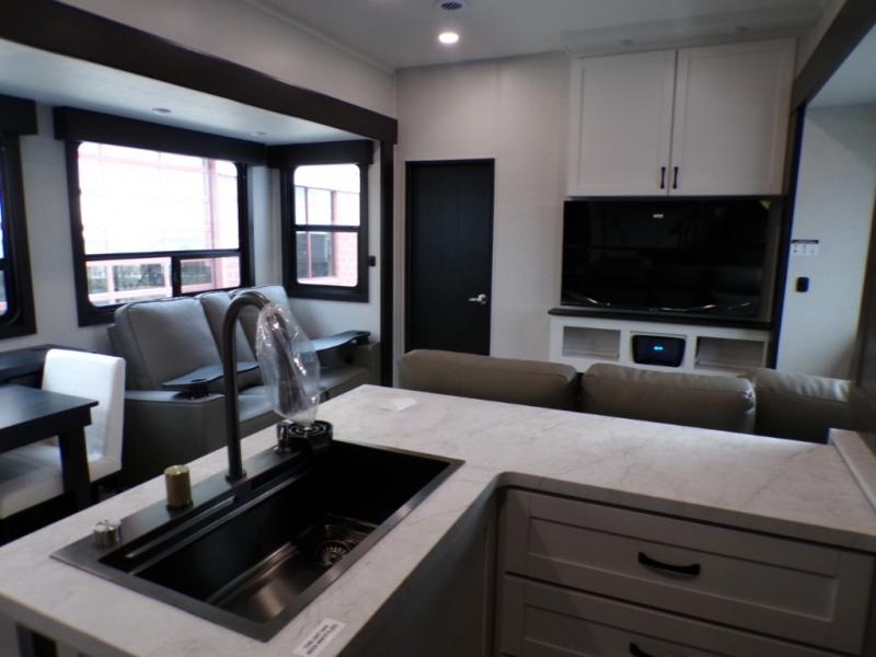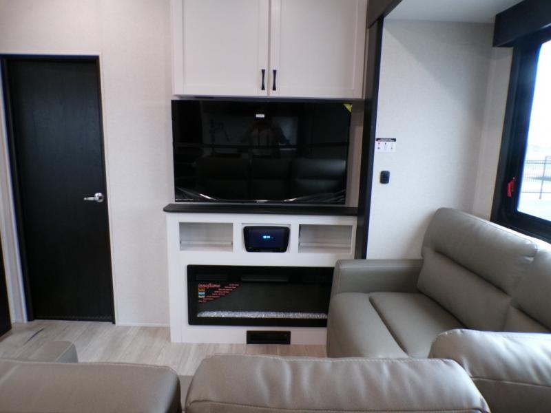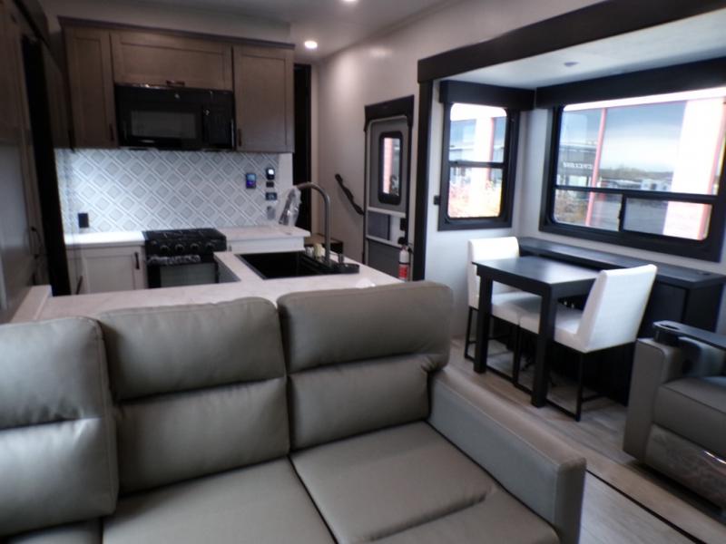 Get on the road with this toy hauler fifth wheel! The 14' garage is a playground for your toys, offering ample space for your ATV, motorcycle, or other gear. The loft above provides additional storage and an electric queen bed for a comfortable rest. The living room is a haven for relaxation, featuring an L-shaped sofa and a theater-style seat perfect for enjoying your favorite shows or movies on the TV. The kitchen is a culinary delight, equipped with a 12V refrigerator, microwave, overhead cabinets, and ample countertop space. The credenza with roll-out table is perfect for meal prep or serving, and the full bathroom provides a private space to freshen up, while the half bath option in the garage gives you more options. The cherry on top is that the front bedroom is a regal retreat, featuring a king bed, drawers, and a spacious walk-in closet.