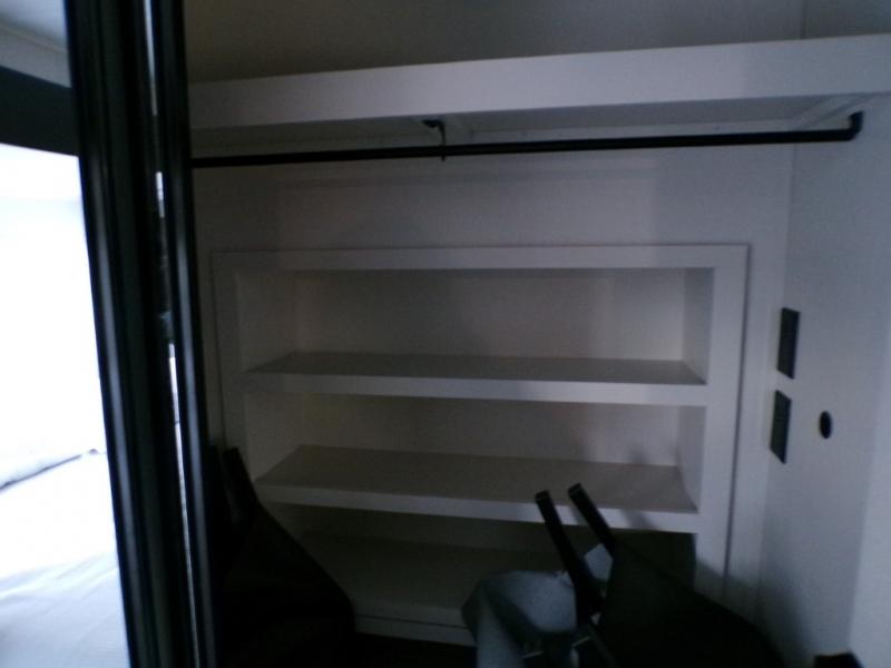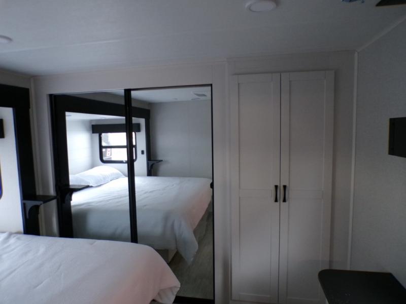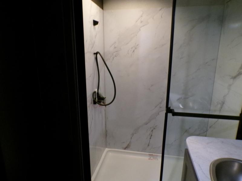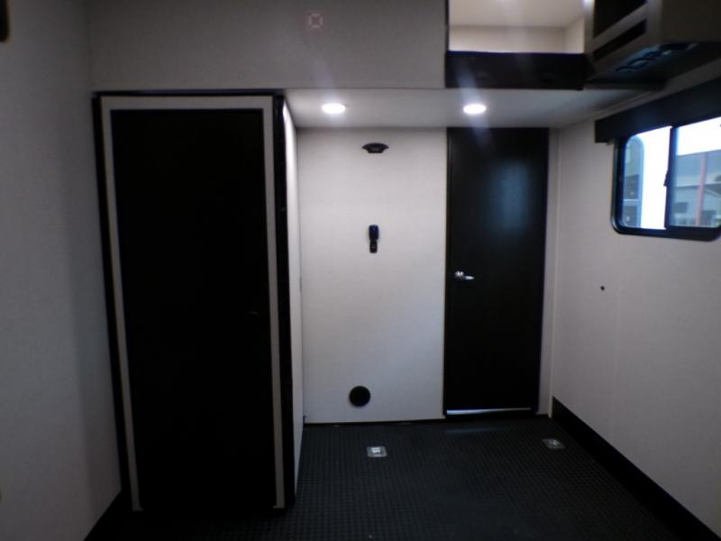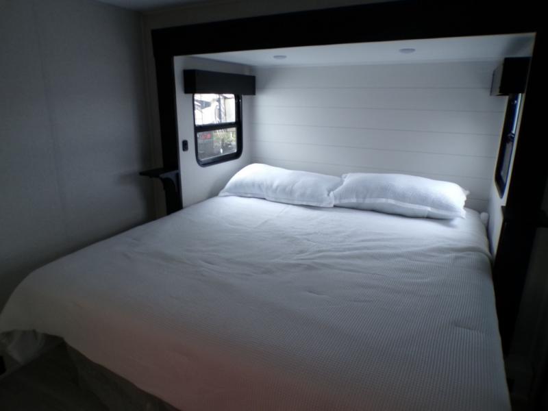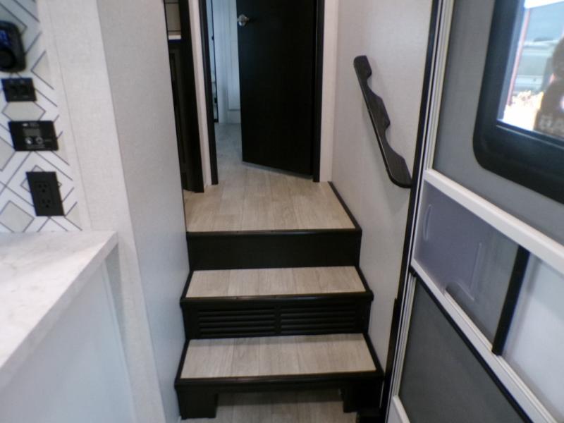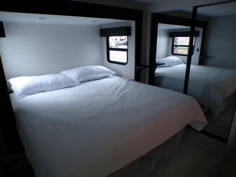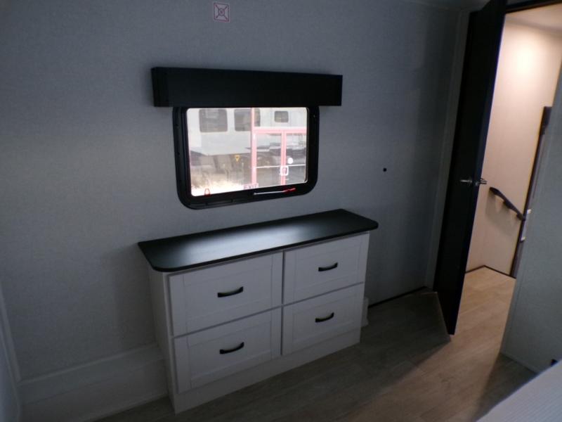 Get on the road with this toy hauler fifth wheel! The 14' garage is a playground for your toys, offering ample space for your ATV, motorcycle, or other gear. The loft above provides additional storage and an electric queen bed for a comfortable rest. The living room is a haven for relaxation, featuring an L-shaped sofa and a theater-style seat perfect for enjoying your favorite shows or movies on the TV. The kitchen is a culinary delight, equipped with a 12V refrigerator, microwave, overhead cabinets, and ample countertop space. The credenza with roll-out table is perfect for meal prep or serving, and the full bathroom provides a private space to freshen up, while the half bath option in the garage gives you more options. The cherry on top is that the front bedroom is a regal retreat, featuring a king bed, drawers, and a spacious walk-in closet.