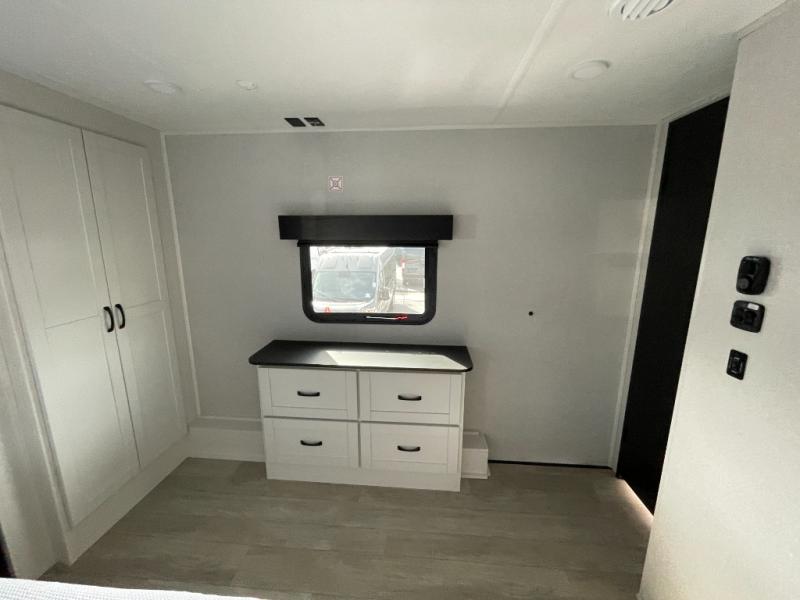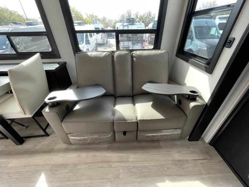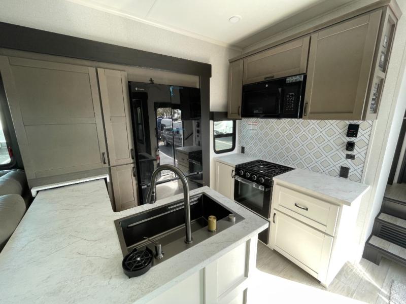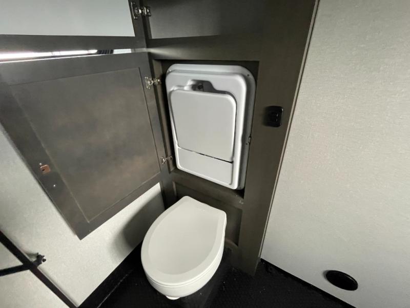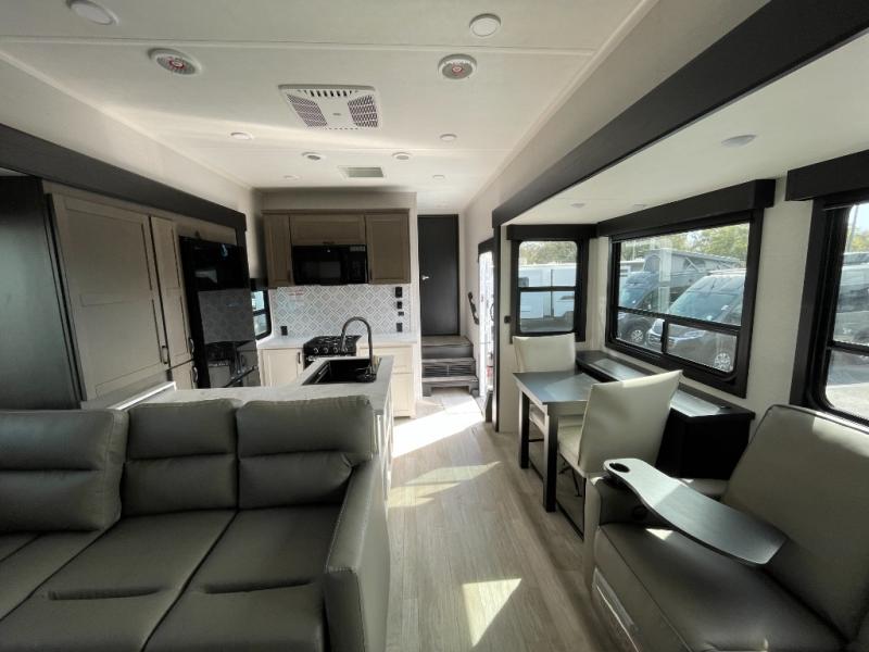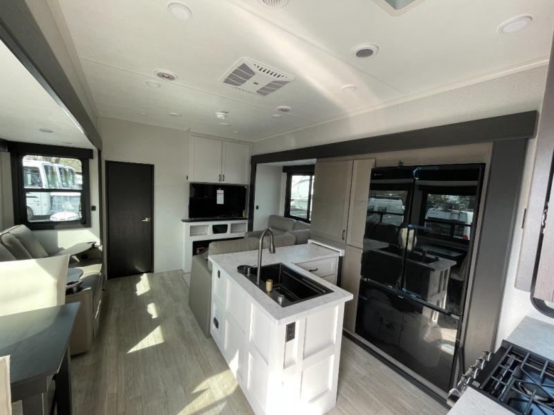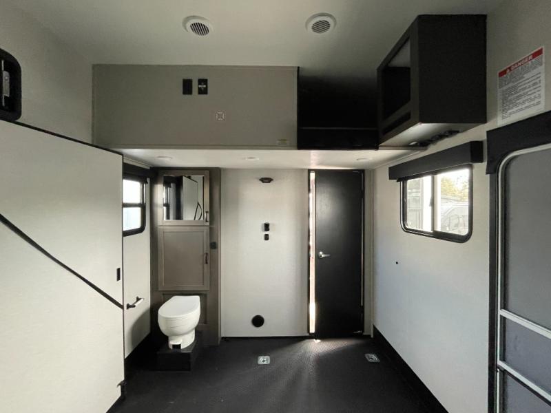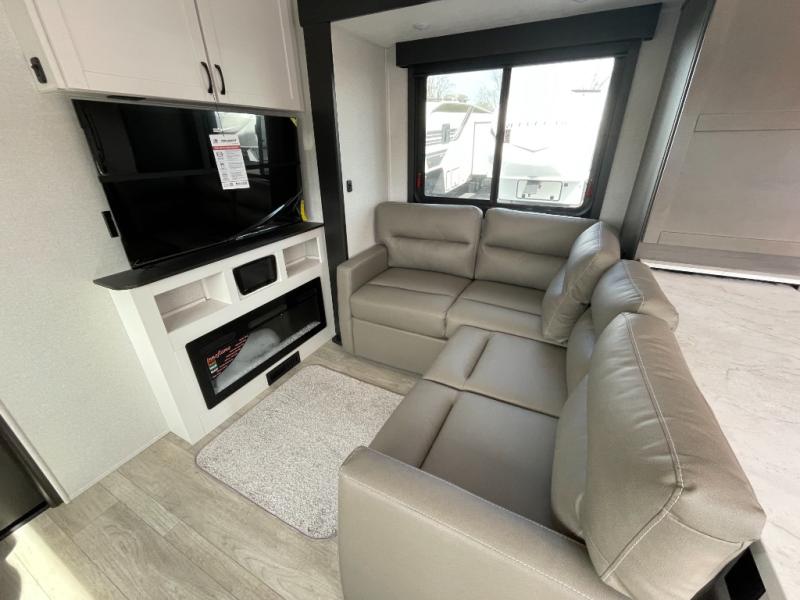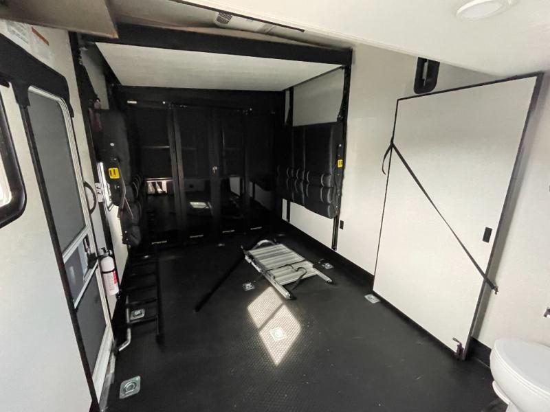 Get on the road with this toy hauler fifth wheel! The 14' garage is a playground for your toys, offering ample space for your ATV, motorcycle, or other gear. The loft above provides additional storage and an electric queen bed for a comfortable rest. The living room is a haven for relaxation, featuring an L-shaped sofa and a theater-style seat perfect for enjoying your favorite shows or movies on the TV. The kitchen is a culinary delight, equipped with a 12V refrigerator, microwave, overhead cabinets, and ample countertop space. The credenza with roll-out table is perfect for meal prep or serving, and the full bathroom provides a private space to freshen up, while the half bath option in the garage gives you more options. The cherry on top is that the front bedroom is a regal retreat, featuring a king bed, drawers, and a spacious walk-in closet.