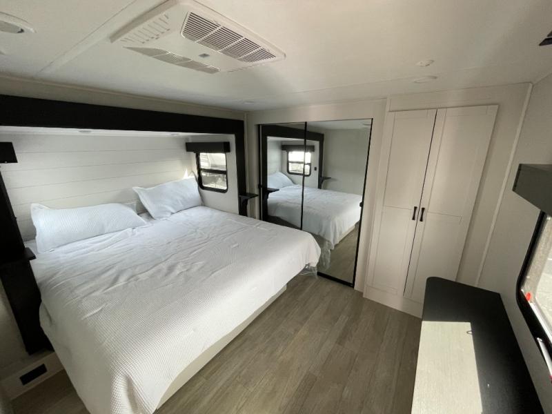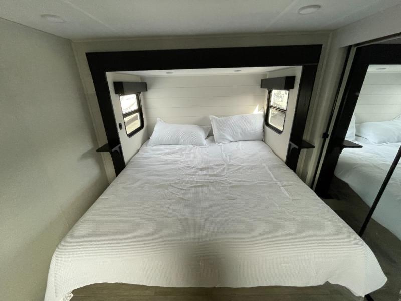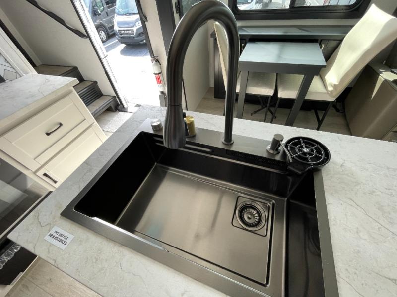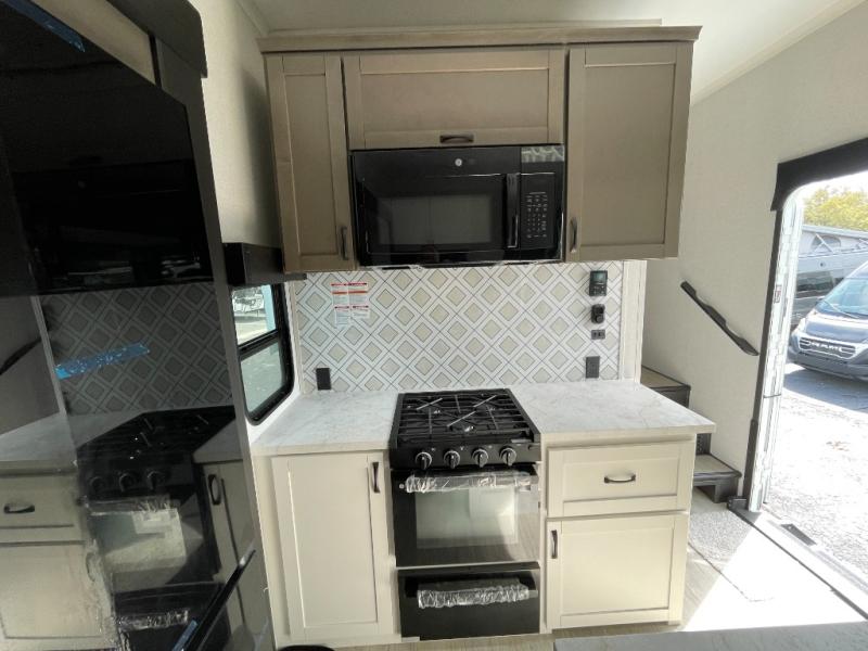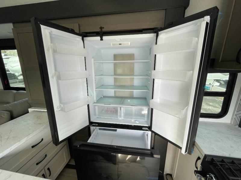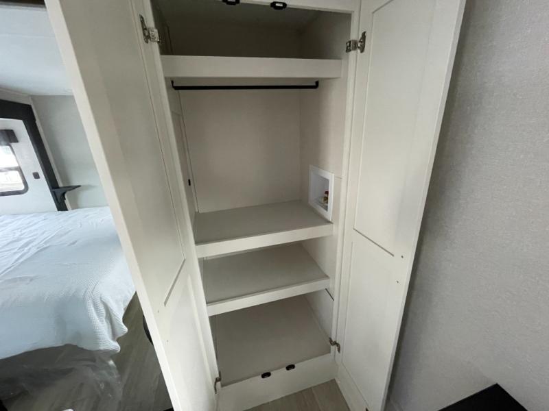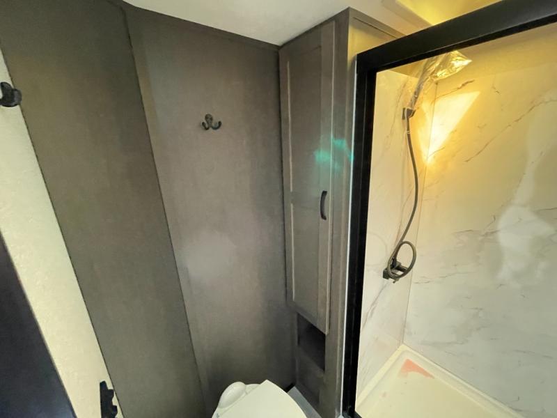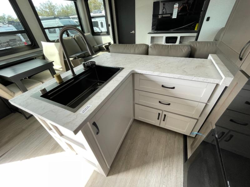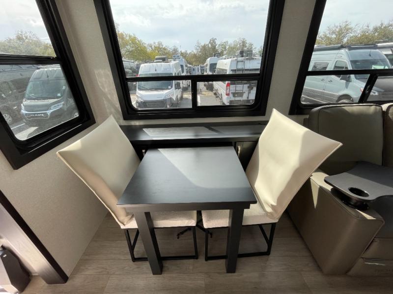 Get on the road with this toy hauler fifth wheel! The 14' garage is a playground for your toys, offering ample space for your ATV, motorcycle, or other gear. The loft above provides additional storage and an electric queen bed for a comfortable rest. The living room is a haven for relaxation, featuring an L-shaped sofa and a theater-style seat perfect for enjoying your favorite shows or movies on the TV. The kitchen is a culinary delight, equipped with a 12V refrigerator, microwave, overhead cabinets, and ample countertop space. The credenza with roll-out table is perfect for meal prep or serving, and the full bathroom provides a private space to freshen up, while the half bath option in the garage gives you more options. The cherry on top is that the front bedroom is a regal retreat, featuring a king bed, drawers, and a spacious walk-in closet.