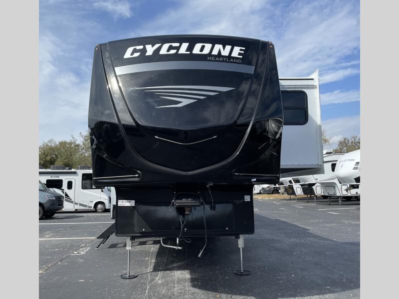 Satisfy your wanderlust with a Heartland Cyclone fifth wheel toy hauler! You won't have to sacrifice any luxury either, with indulgent features like the ducted, fully enclosed, and heated underbelly provides added protection and warmth. Inside, the LED interior lighting throughout ensures that every corner of your RV is bright and inviting, and the bathroom skylight brings in natural light and fresh air, creating a welcoming and refreshing space. Plus, the central command center with built-in tank monitoring keeps you informed and in control, making it easy to manage your resources. Also, the camping in comfort package includes diverse features such as Dexter axles with ABS and tow assist with sway mitigation, and the Keyed-Alike lock system ensures that all your locks are keyed the same, providing added security and convenience. Come find the perfect model for you today!