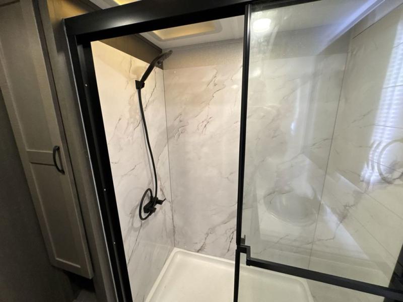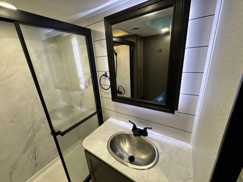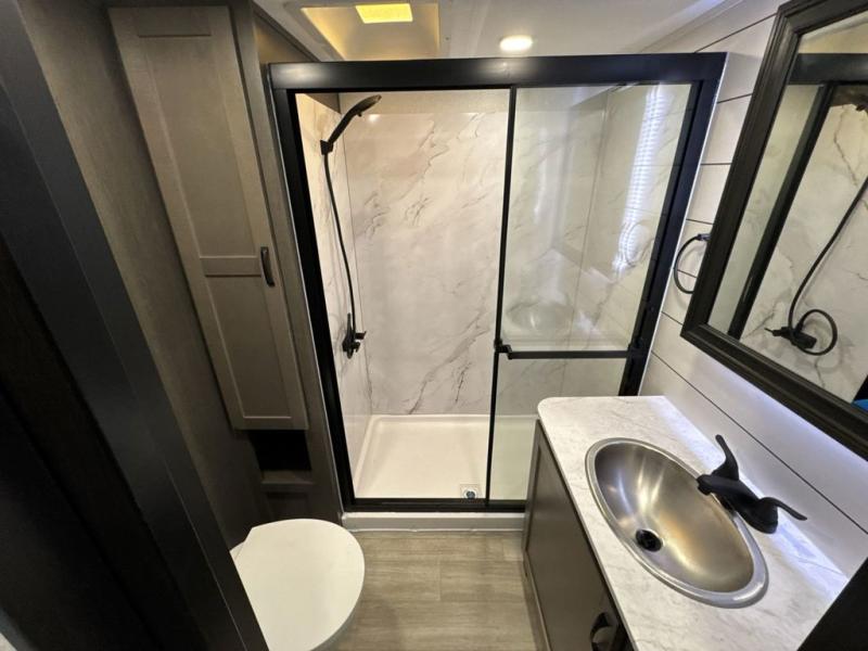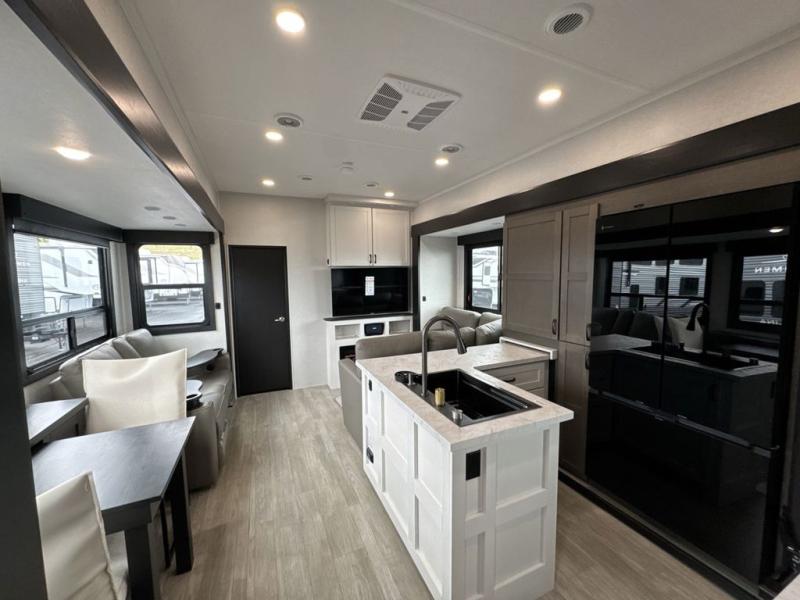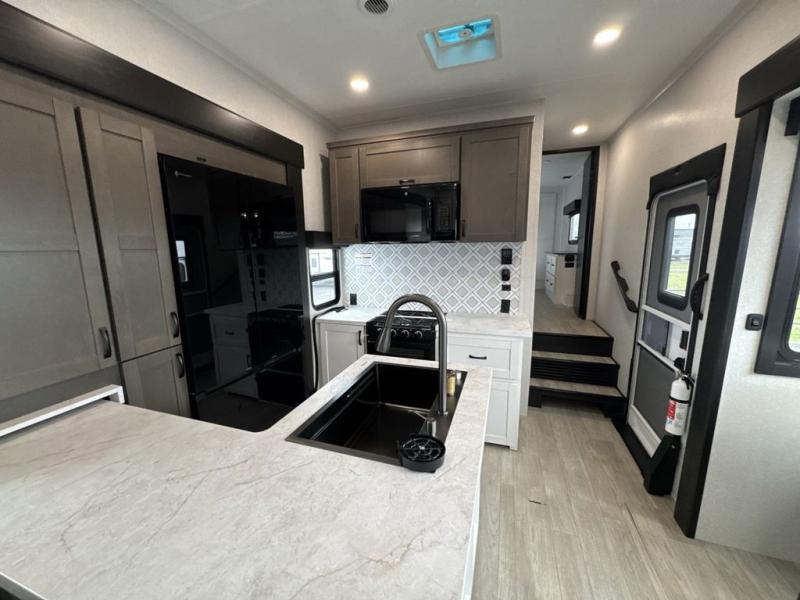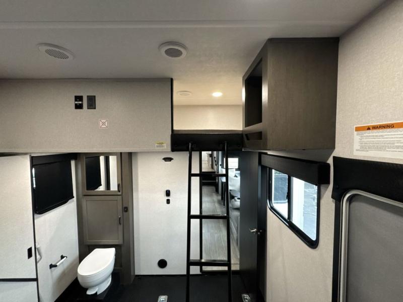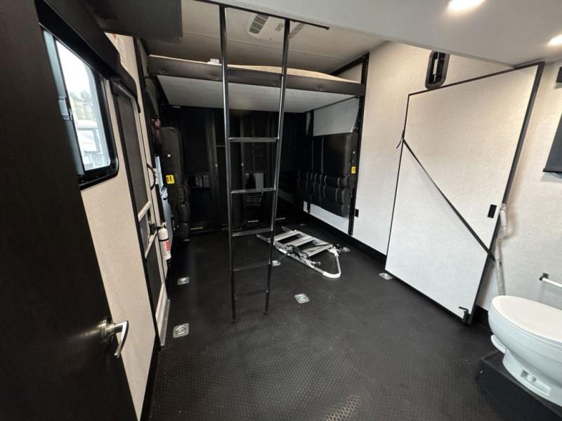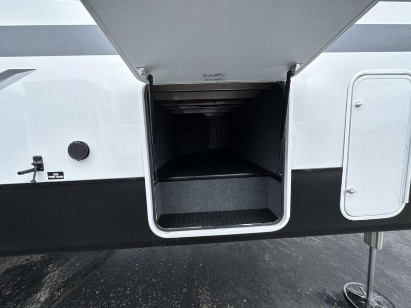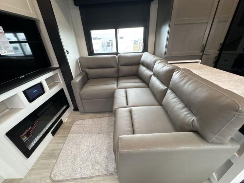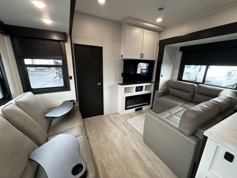 Get on the road with this toy hauler fifth wheel! The 14' garage is a playground for your toys, offering ample space for your ATV, motorcycle, or other gear. The loft above provides additional storage and an electric queen bed for a comfortable rest. The living room is a haven for relaxation, featuring an L-shaped sofa and a theater-style seat perfect for enjoying your favorite shows or movies on the TV. The kitchen is a culinary delight, equipped with a 12V refrigerator, microwave, overhead cabinets, and ample countertop space. The credenza with roll-out table is perfect for meal prep or serving, and the full bathroom provides a private space to freshen up, while the half bath option in the garage gives you more options. The cherry on top is that the front bedroom is a regal retreat, featuring a king bed, drawers, and a spacious walk-in closet.