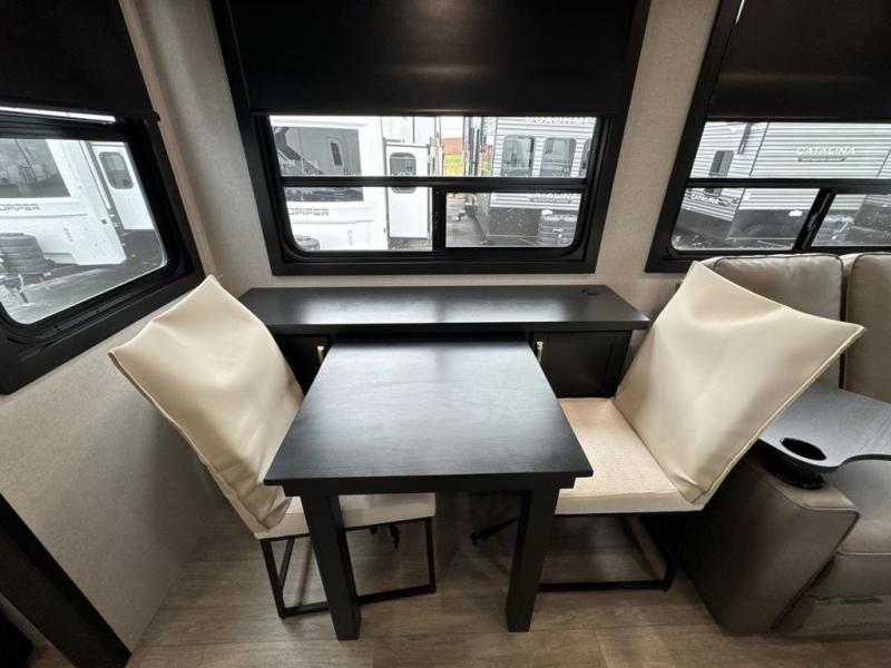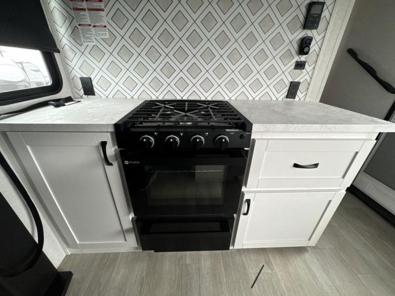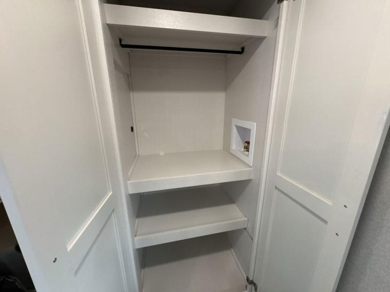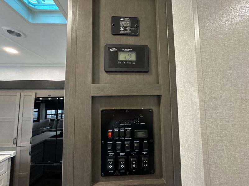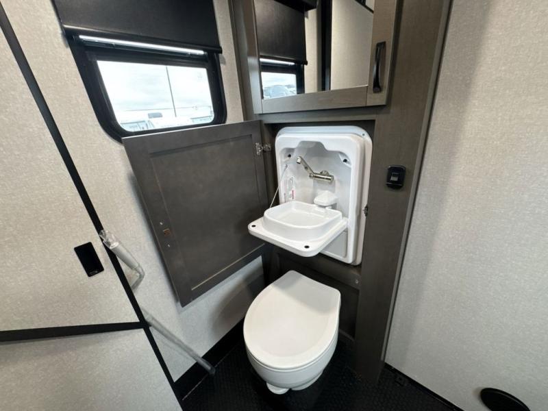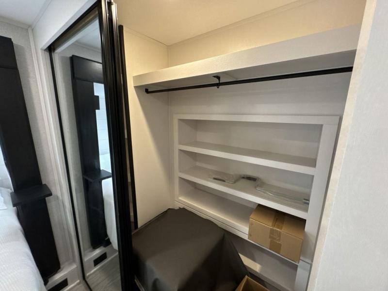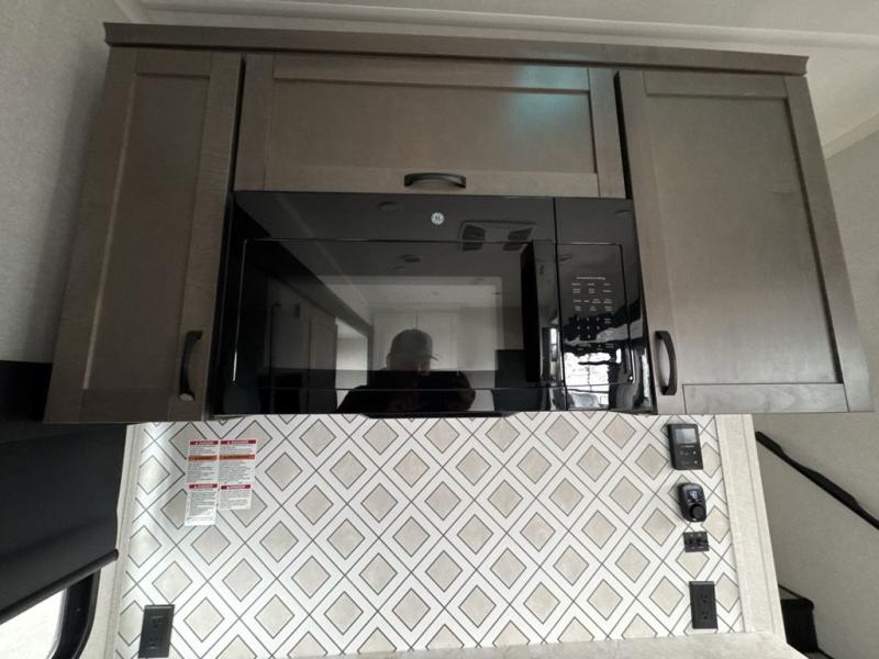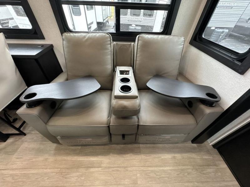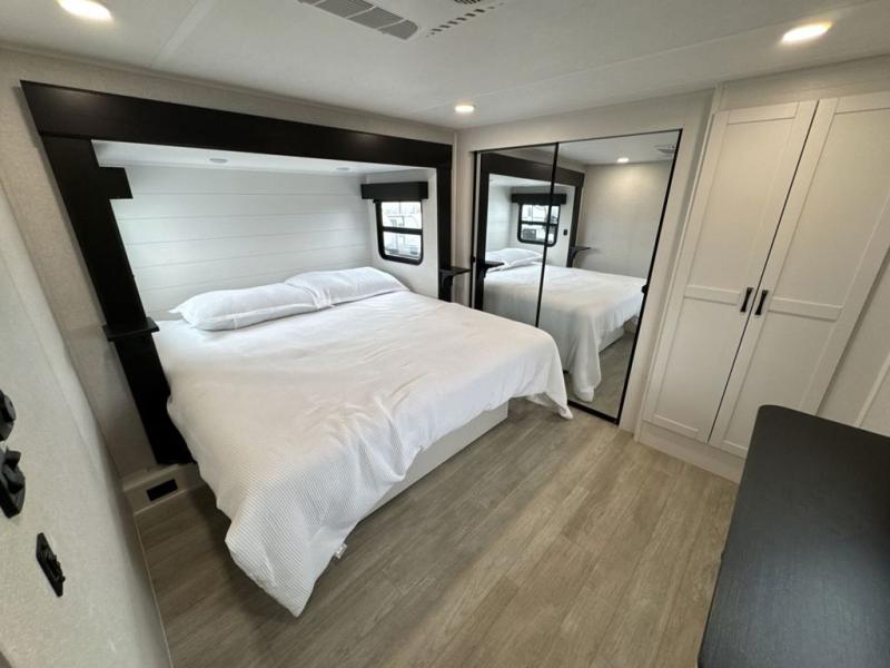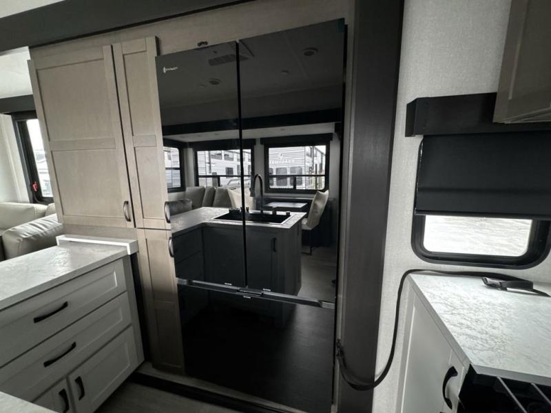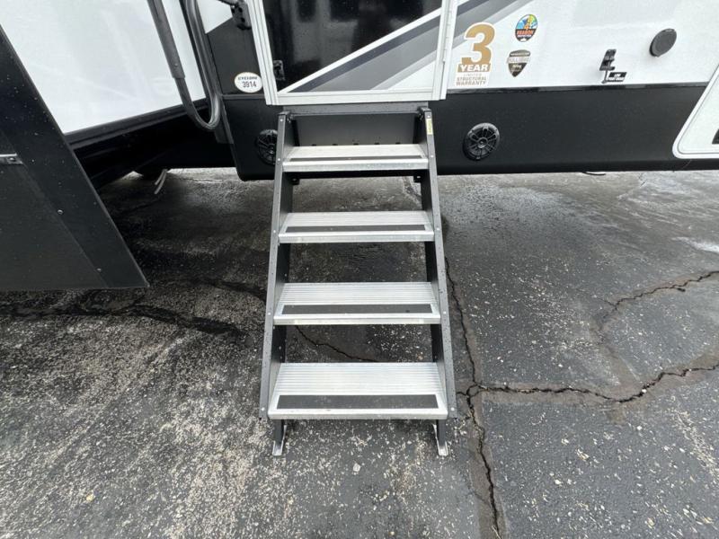 Get on the road with this toy hauler fifth wheel! The 14' garage is a playground for your toys, offering ample space for your ATV, motorcycle, or other gear. The loft above provides additional storage and an electric queen bed for a comfortable rest. The living room is a haven for relaxation, featuring an L-shaped sofa and a theater-style seat perfect for enjoying your favorite shows or movies on the TV. The kitchen is a culinary delight, equipped with a 12V refrigerator, microwave, overhead cabinets, and ample countertop space. The credenza with roll-out table is perfect for meal prep or serving, and the full bathroom provides a private space to freshen up, while the half bath option in the garage gives you more options. The cherry on top is that the front bedroom is a regal retreat, featuring a king bed, drawers, and a spacious walk-in closet.