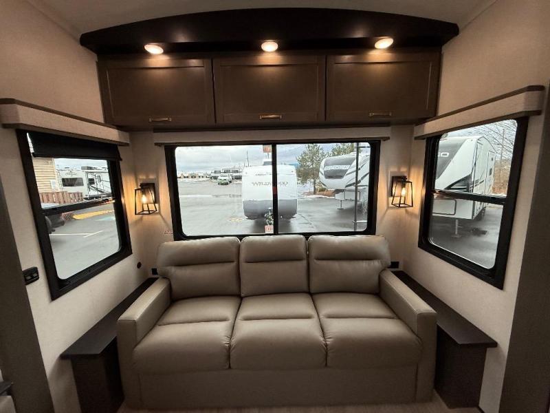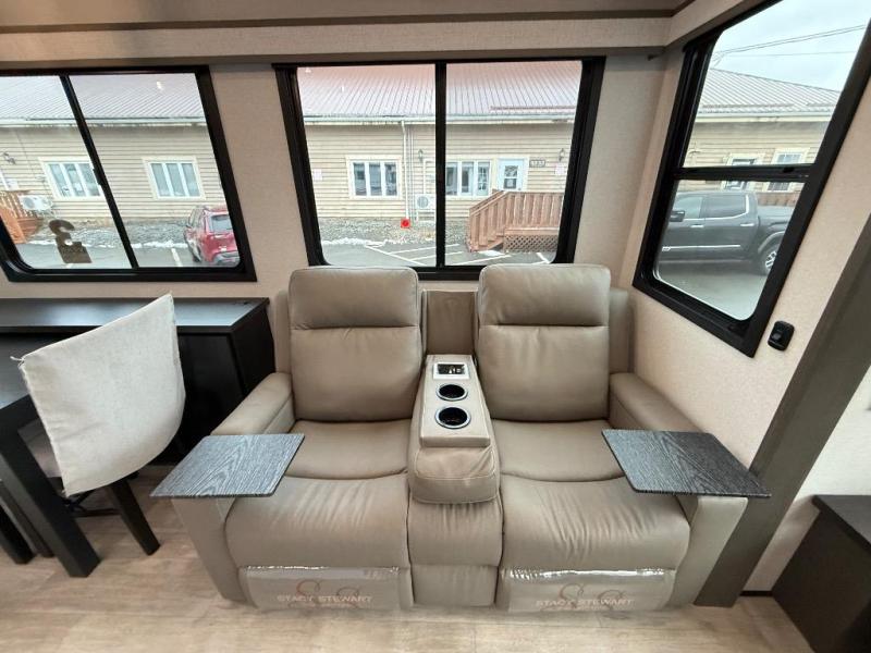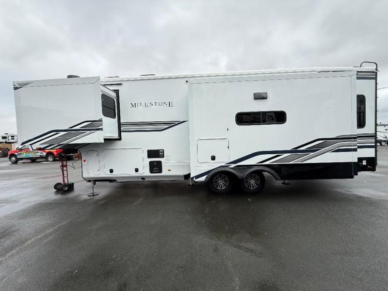 You'll be able to see the country in full luxury with this Milestone fifth wheel! There is a private bedroom in the front with a king-size bed where you can sleep comfortably each evening.The kitchen has all the appliances you will need to make the most out of your trips featuring a convection microwave, 21” oven, and a 16 cu. ft. 12V refrigerator. The living room will make for a great entertaining area, you can relax on the 78" hide-a-bed sofa that will serve as a bed so you can sit back and even have a nap! There is a full bathroom that has a 30" by 48" shower to freshen up each day. This RV has a wonderful design featuring dual opposing slides that will make for the real residential experience and make the most out of your travel.