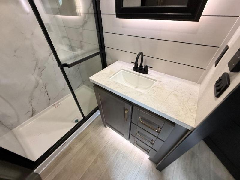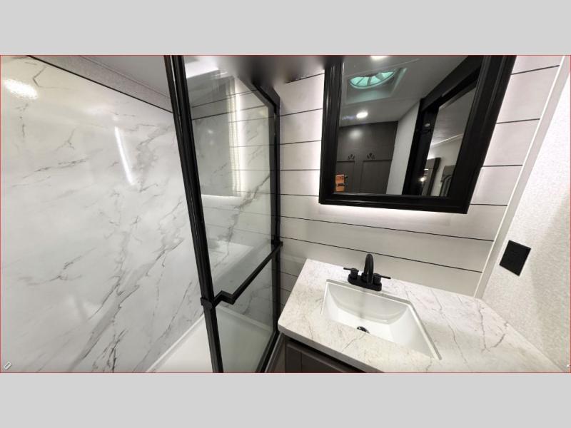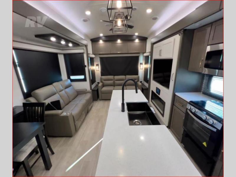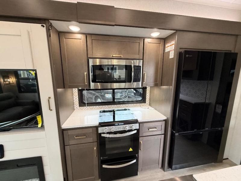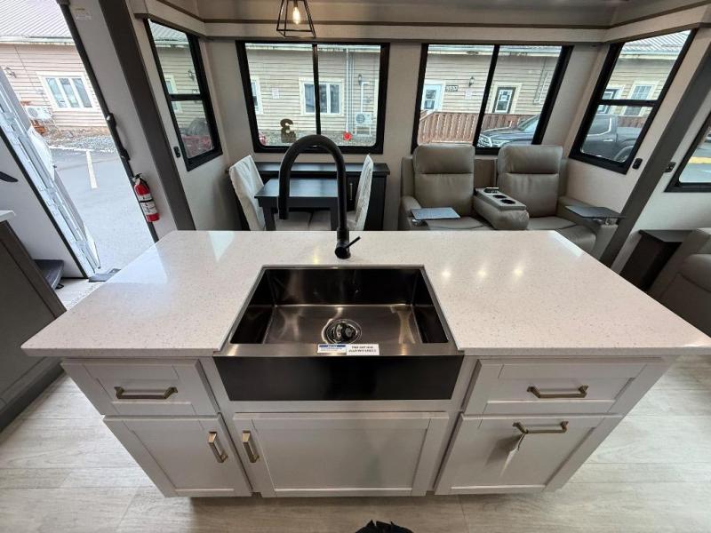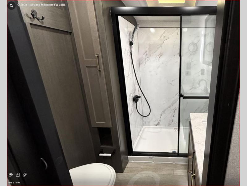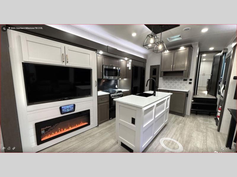 The Heartland Milestone is a full-profile luxury fifth wheel that is ready to help you make the most of your adventures! You will find a TrussTXL Roof System with Alpha roof membrane system offering quality exterior protection, and the Power Up Solar that includes a 200 watt solar panel will let you go off-grid when the adventure calls for it. The upgraded MORryde Step Above entrance steps will help you enter your unit with ease, and the 6-point hydraulic auto-leveling system comes standard to help you keep your unit secure while camping. The interior kitchen has some great features, like residential solid surface countertops and a large farmhouse sink. There are roller night shades throughout each unit to have privacy and comfort.