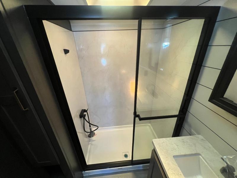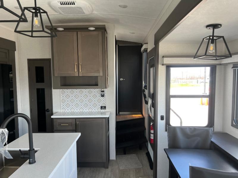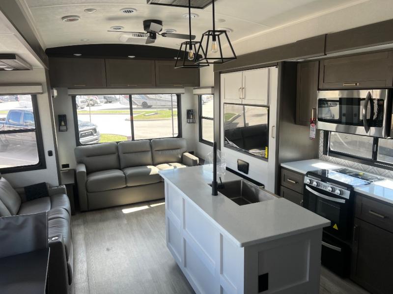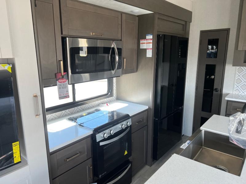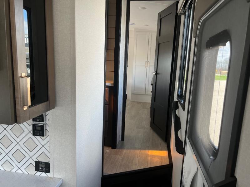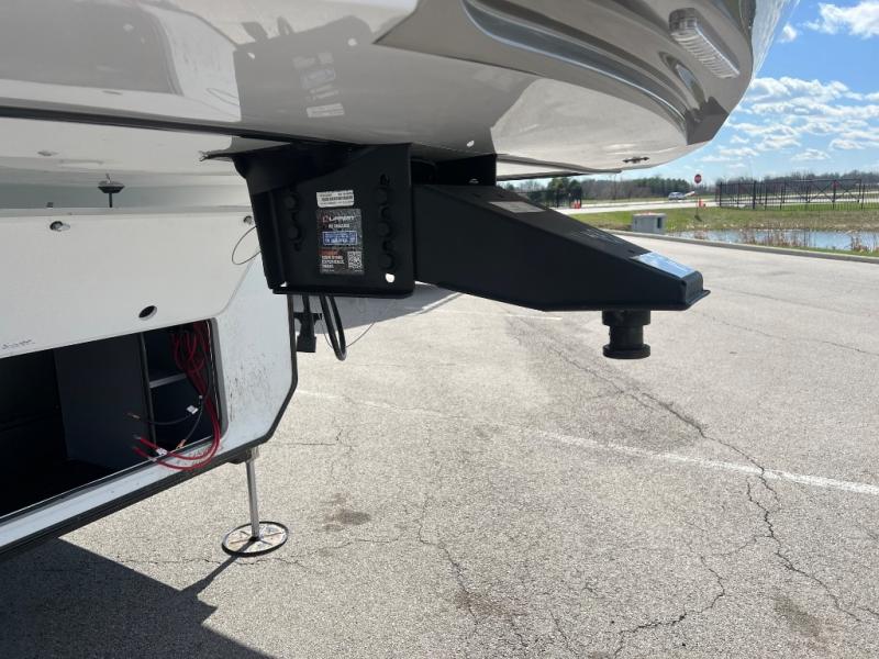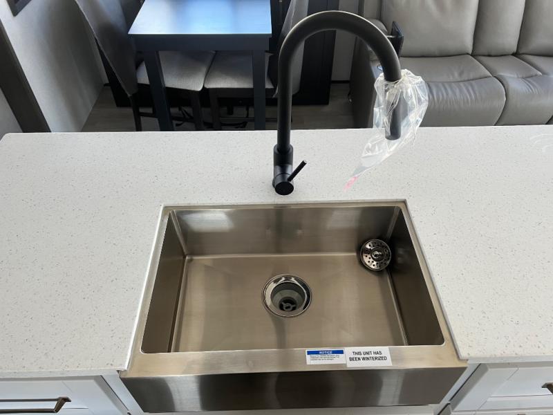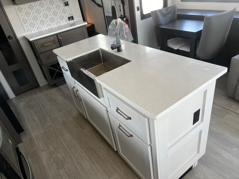 The Heartland Milestone is a full-profile luxury fifth wheel that is ready to help you make the most of your adventures! You will find a TrussTXL Roof System with Alpha roof membrane system offering quality exterior protection, and the Power Up Solar that includes a 200 watt solar panel will let you go off-grid when the adventure calls for it. The upgraded MORryde Step Above entrance steps will help you enter your unit with ease, and the 6-point hydraulic auto-leveling system comes standard to help you keep your unit secure while camping. The interior kitchen has some great features, like residential solid surface countertops and a large farmhouse sink. There are roller night shades throughout each unit to have privacy and comfort.
