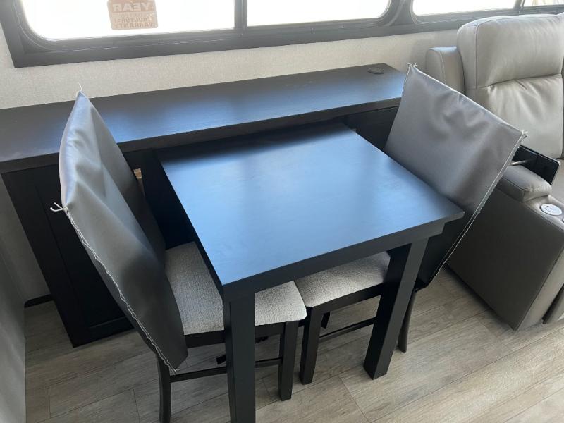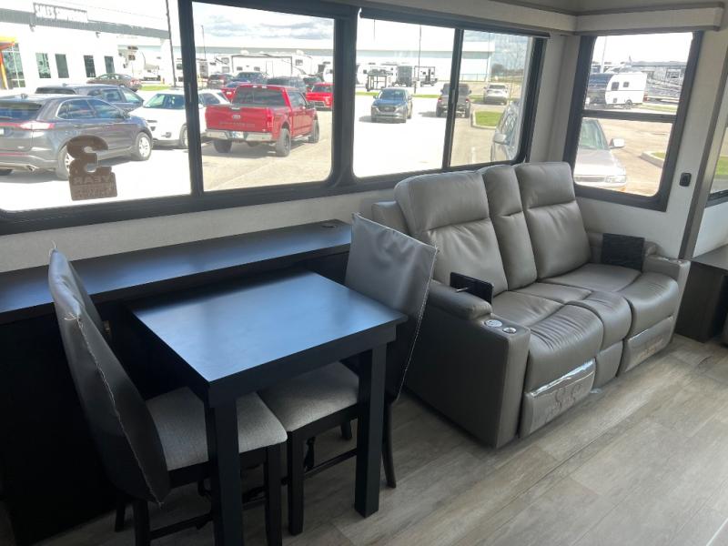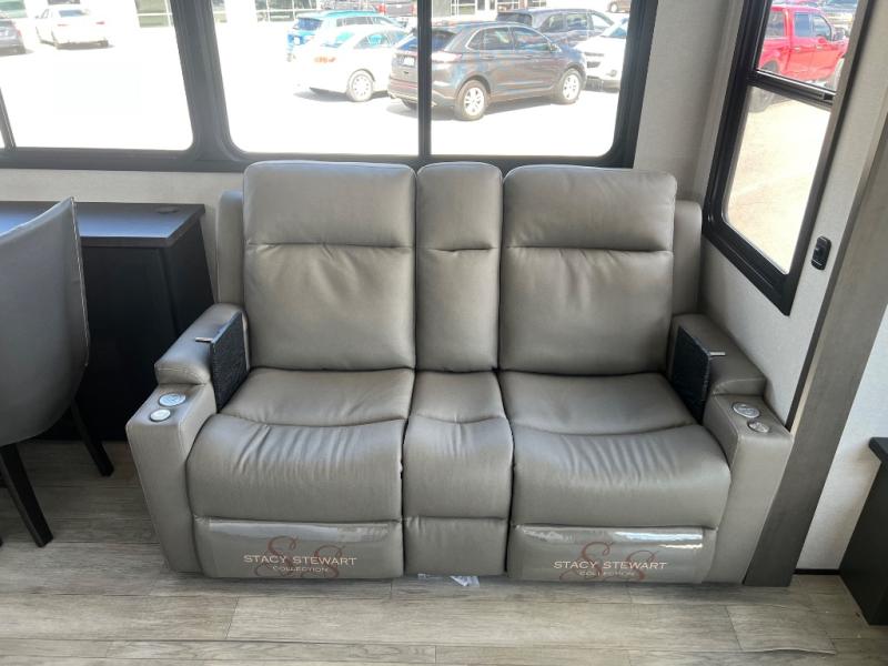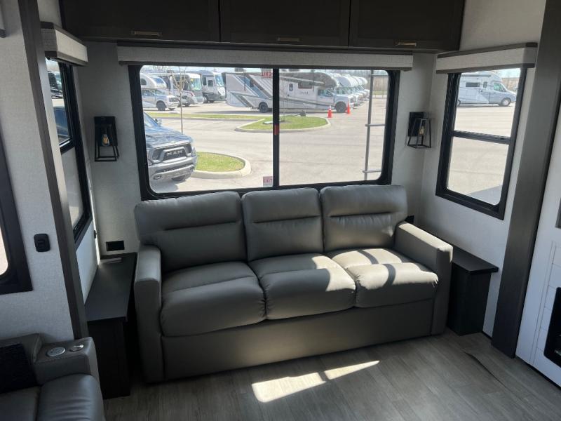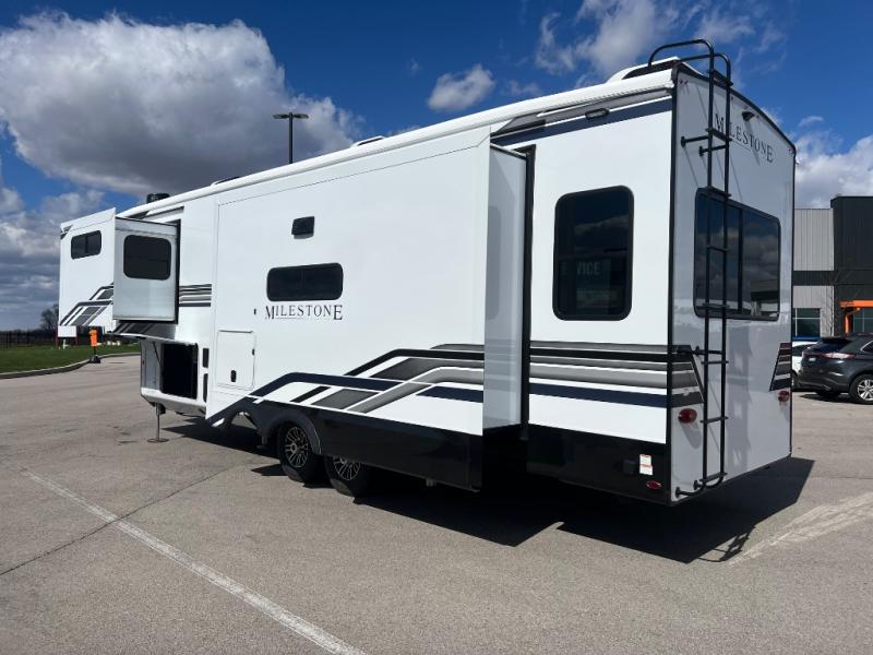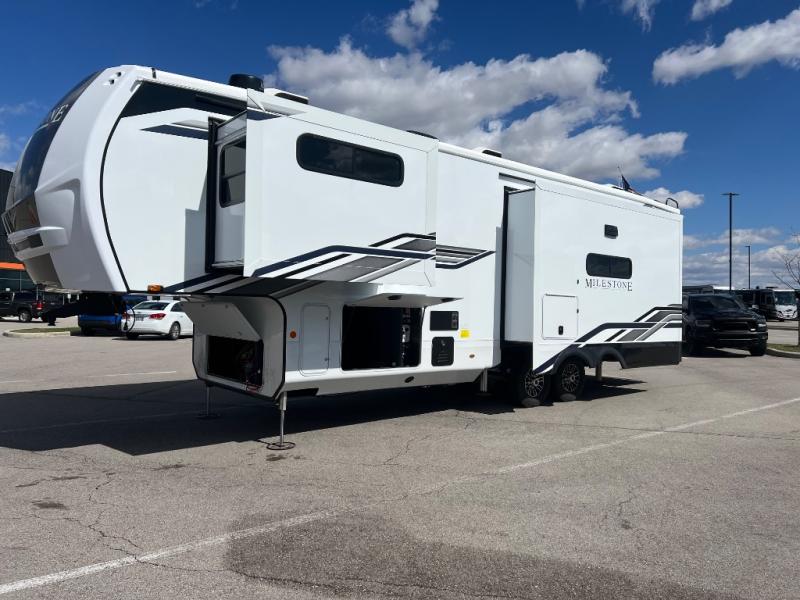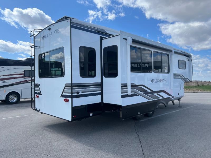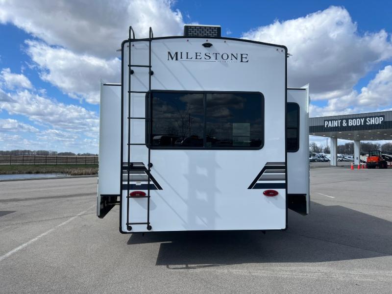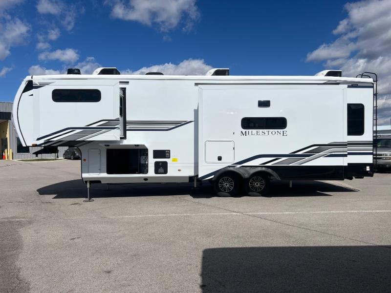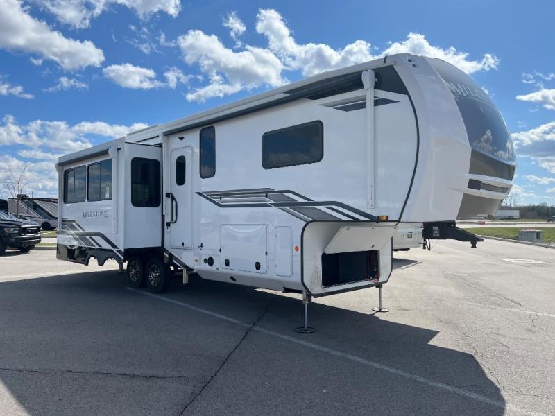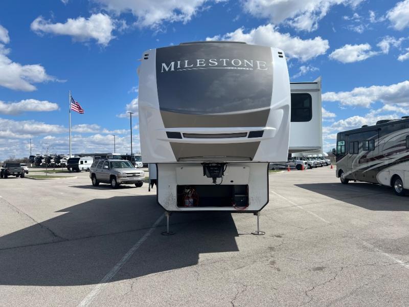 You'll be able to see the country in full luxury with this Milestone fifth wheel! There is a private bedroom in the front with a king-size bed where you can sleep comfortably each evening.The kitchen has all the appliances you will need to make the most out of your trips featuring a convection microwave, 21” oven, and a 16 cu. ft. 12V refrigerator. The living room will make for a great entertaining area, you can relax on the 78" hide-a-bed sofa that will serve as a bed so you can sit back and even have a nap! There is a full bathroom that has a 30" by 48" shower to freshen up each day. This RV has a wonderful design featuring dual opposing slides that will make for the real residential experience and make the most out of your travel.