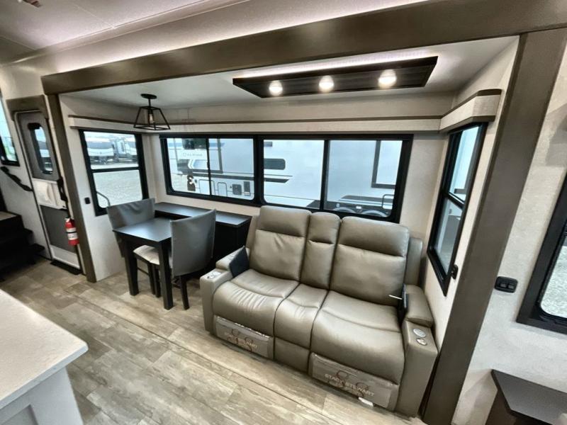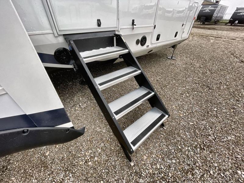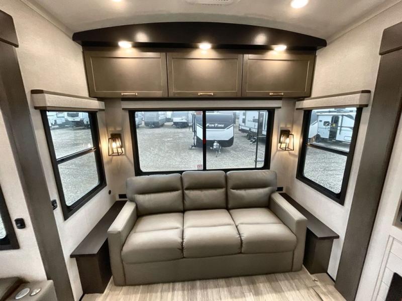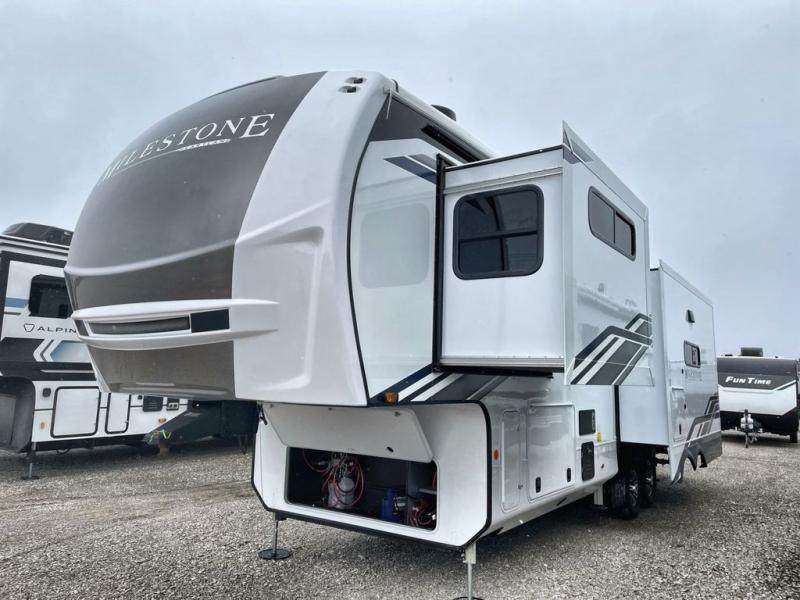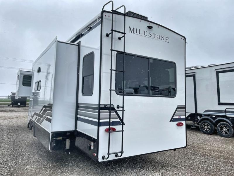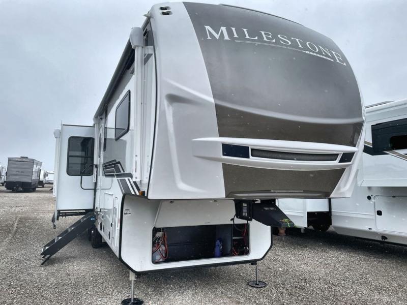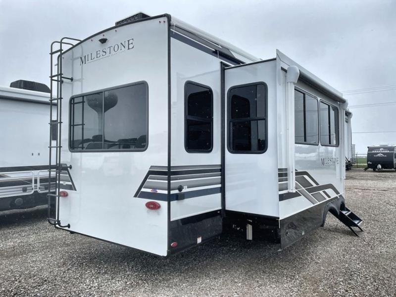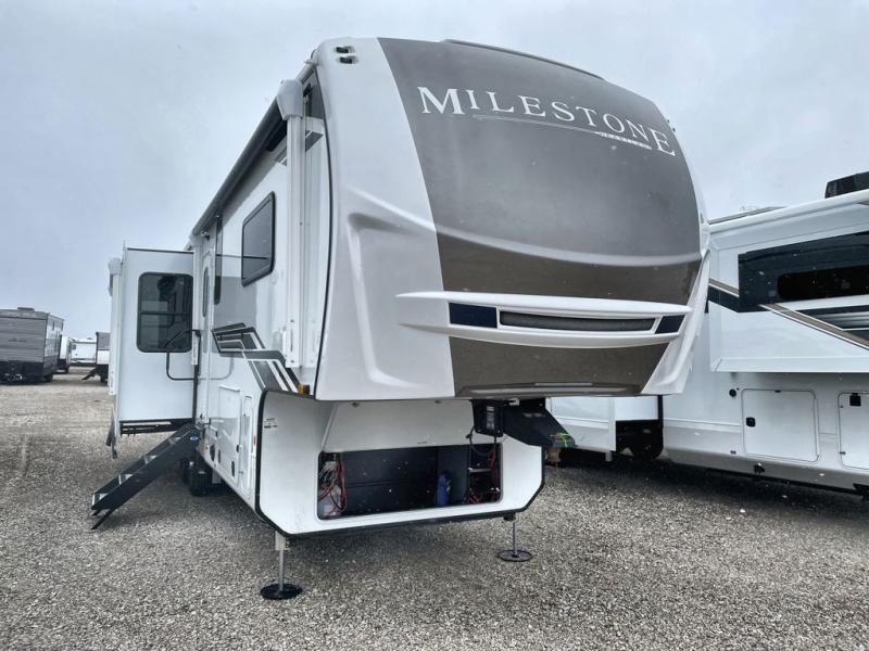 You'll be able to see the country in full luxury with this Milestone fifth wheel! There is a private bedroom in the front with a king-size bed where you can sleep comfortably each evening.The kitchen has all the appliances you will need to make the most out of your trips featuring a convection microwave, 21” oven, and a 16 cu. ft. 12V refrigerator. The living room will make for a great entertaining area, you can relax on the 78" hide-a-bed sofa that will serve as a bed so you can sit back and even have a nap! There is a full bathroom that has a 30" by 48" shower to freshen up each day. This RV has a wonderful design featuring dual opposing slides that will make for the real residential experience and make the most out of your travel.