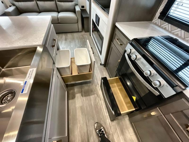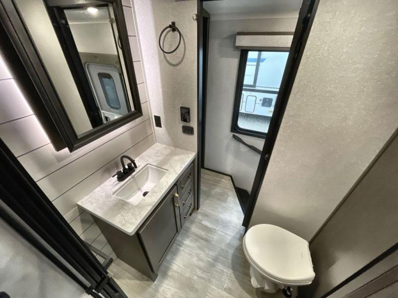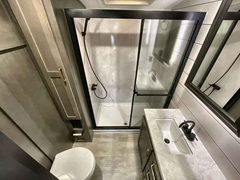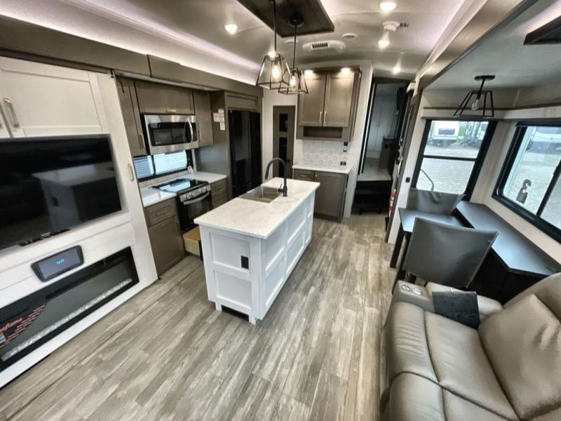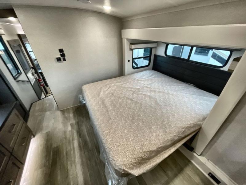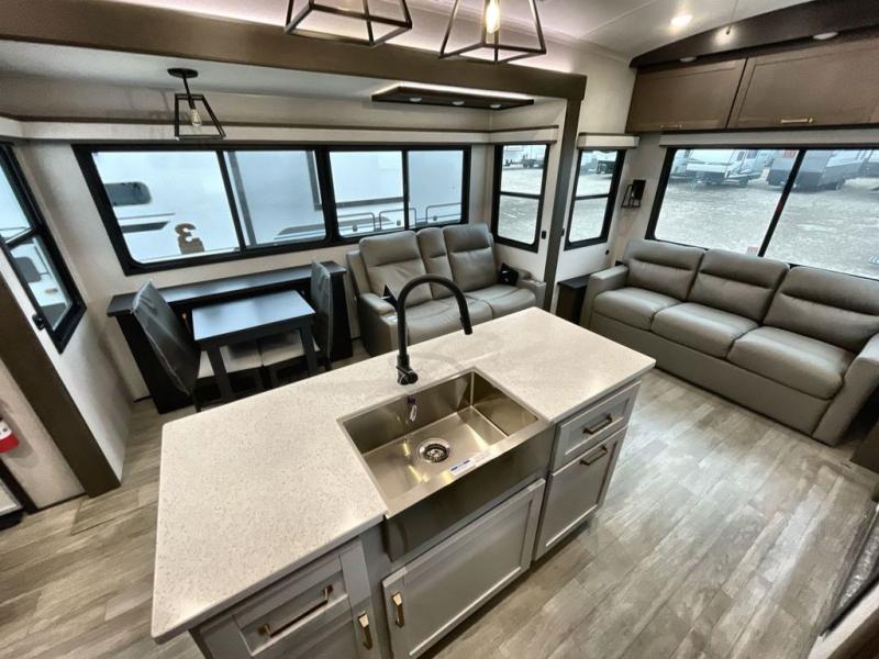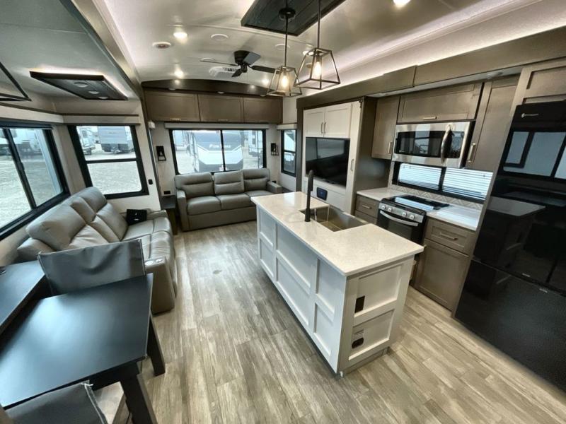 The Heartland Milestone is a full-profile luxury fifth wheel that is ready to help you make the most of your adventures! You will find a TrussTXL Roof System with Alpha roof membrane system offering quality exterior protection, and the Power Up Solar that includes a 200 watt solar panel will let you go off-grid when the adventure calls for it. The upgraded MORryde Step Above entrance steps will help you enter your unit with ease, and the 6-point hydraulic auto-leveling system comes standard to help you keep your unit secure while camping. The interior kitchen has some great features, like residential solid surface countertops and a large farmhouse sink. There are roller night shades throughout each unit to have privacy and comfort.