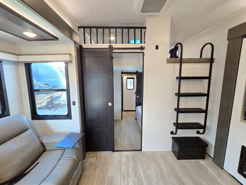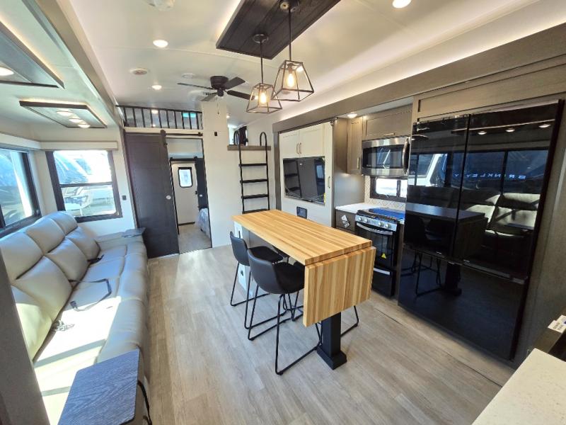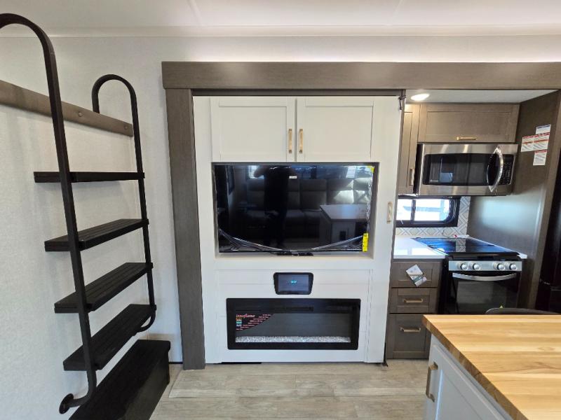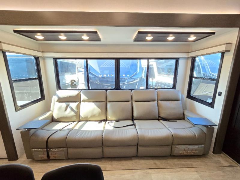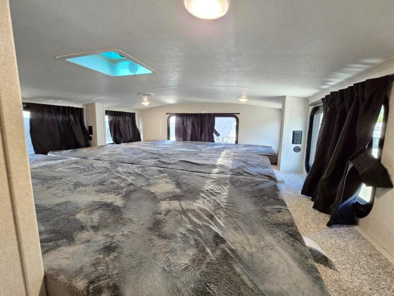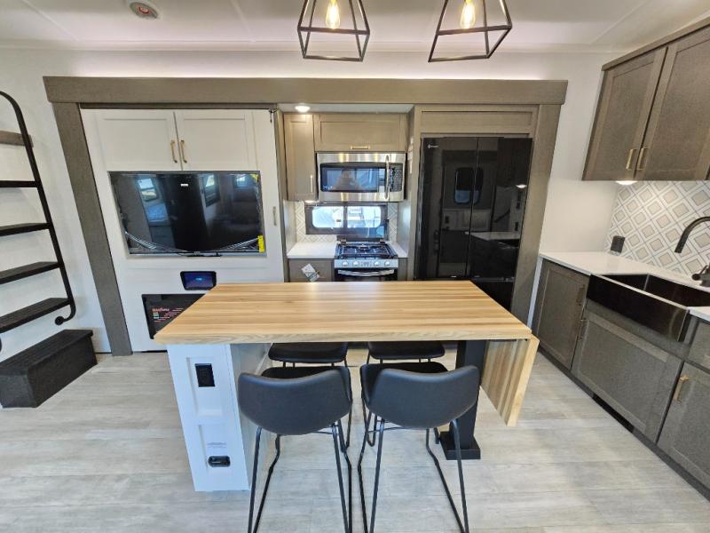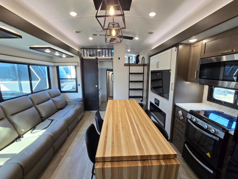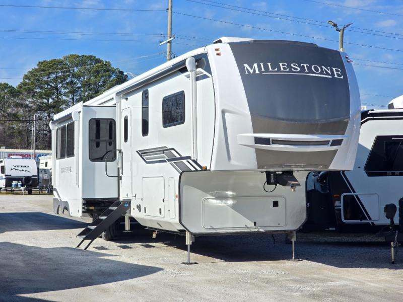 You'll be shocked with how many people can travel in full luxury with this Milestone fifth wheel! There are dual private bedrooms featuring a king-size bed in the front bedroom and a queen-size bed in the rear bedroom so you and your guests can have their own space. Use the loft for added sleeping space for the kiddos! This RV also has two full bathrooms on each end so it is of easy access, also, the rear bathroom has its own exterior entrance! The kitchen has all the counter space you will need to prepare your everyday meals, after cooking you can enjoy your creation at the island table with chairs.There is a super lounger that has all the space you'll need to enjoy quality time with all of your guests! Enjoy a wonderful design featuring dual opposing slides that will make for the real residential experience and make the most out of your travel.