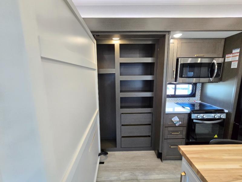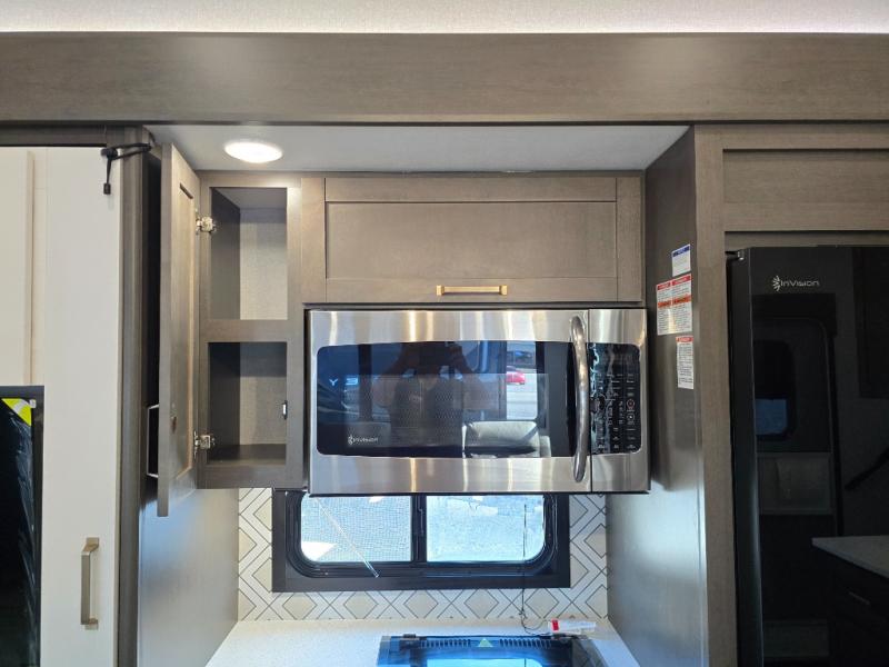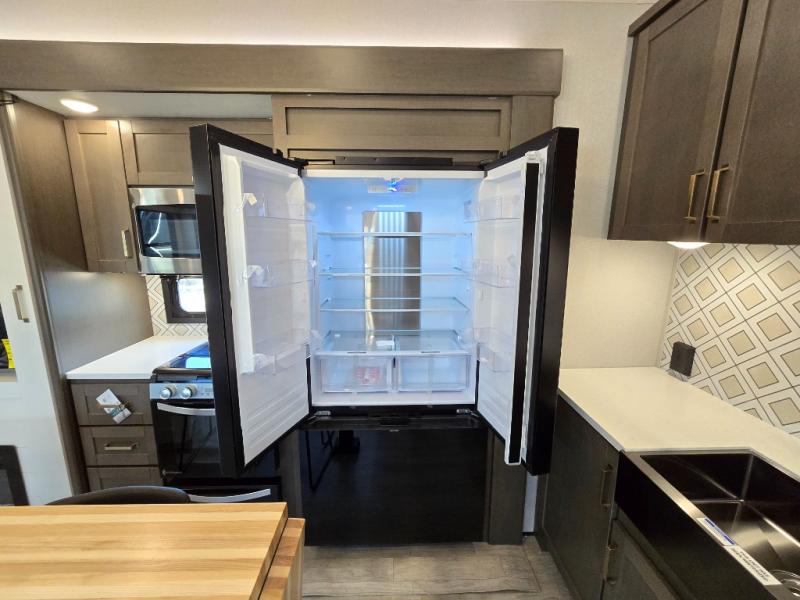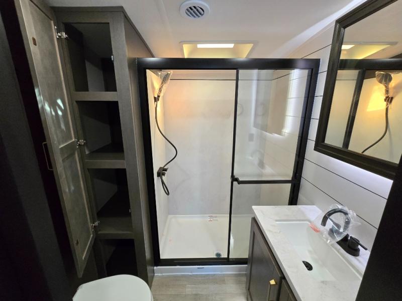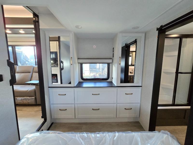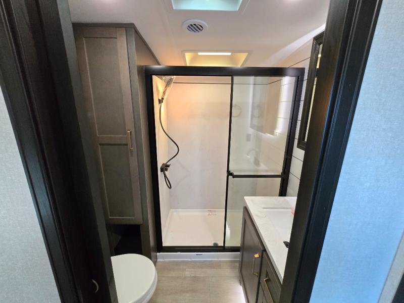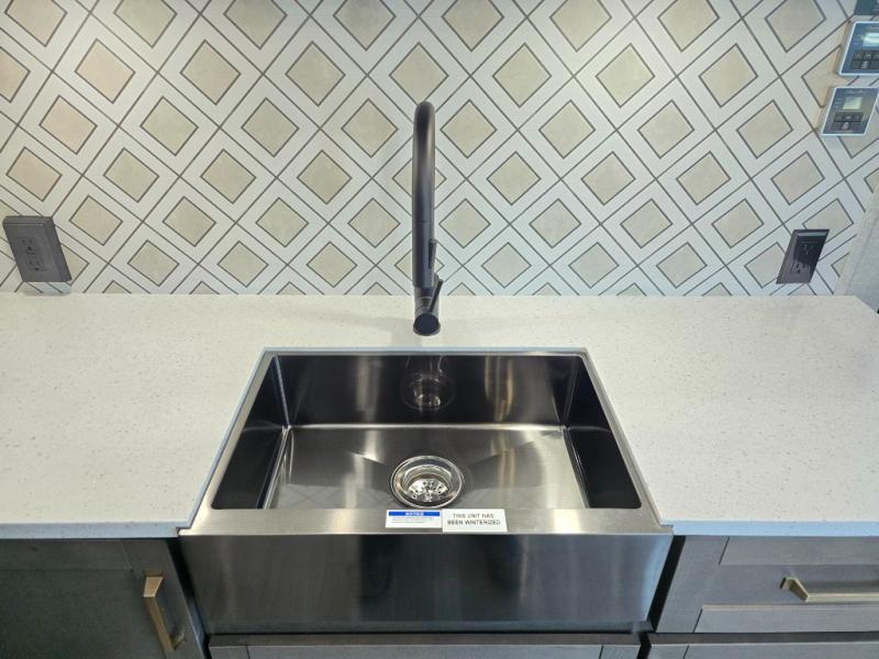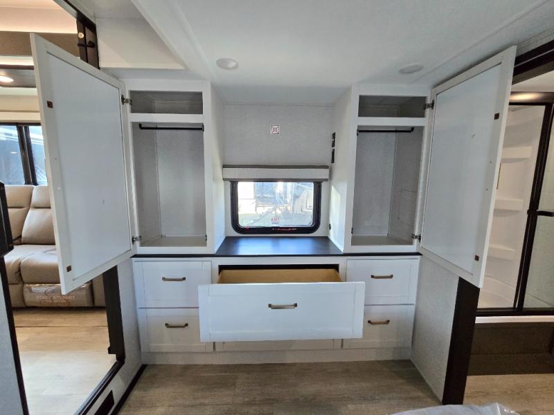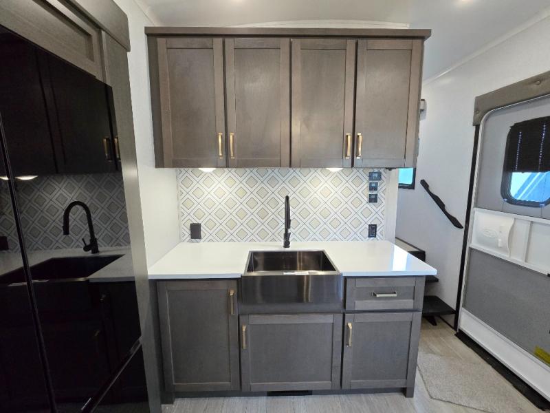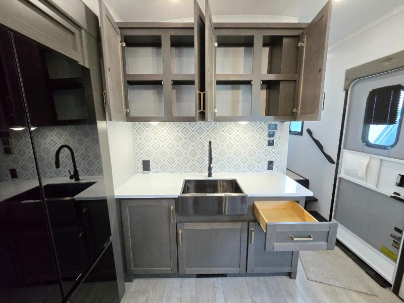 The Heartland Milestone is a full-profile luxury fifth wheel that is ready to help you make the most of your adventures! You will find a TrussTXL Roof System with Alpha roof membrane system offering quality exterior protection, and the Power Up Solar that includes a 200 watt solar panel will let you go off-grid when the adventure calls for it. The upgraded MORryde Step Above entrance steps will help you enter your unit with ease, and the 6-point hydraulic auto-leveling system comes standard to help you keep your unit secure while camping. The interior kitchen has some great features, like residential solid surface countertops and a large farmhouse sink. There are roller night shades throughout each unit to have privacy and comfort.