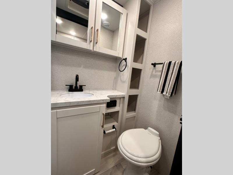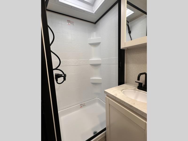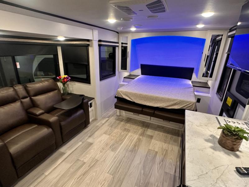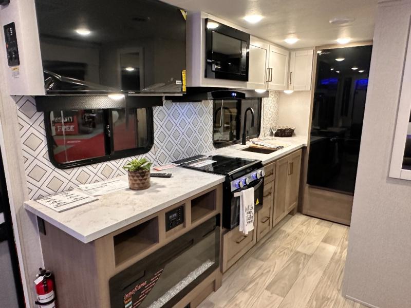 Once you step inside, you'll be welcomed by a thoughtfully designed front bedroom area featuring a 60" x 75" queen murphy bed, which conveniently converts into a 60" jack knife sofa, perfect for relaxing or hosting guests. On each side of the bed, you'll find a wardrobe and nightstand to store all your essentials within arm's reach. Moving into the slide-out, there's a cozy 60" theater seat equipped with table trays for comfortable dining or lounging, along with a storage compartment ideal for stashing board games or travel extras. Directly across, the kitchen stretches nearly the full length of the trailer wall, boasting a stainless-steel single basin sink with a high-rise pullout faucet and a butcher block cutting board, plus an 11-cu. ft. refrigerator to keep all your groceries fresh. Tucked into the rear corner is a full bathroom complete with a 30" x 36" shower, a medicine cabinet, and a porcelain foot flush toilet, offering the convenience and comfort of home without relying on campsite facilities.