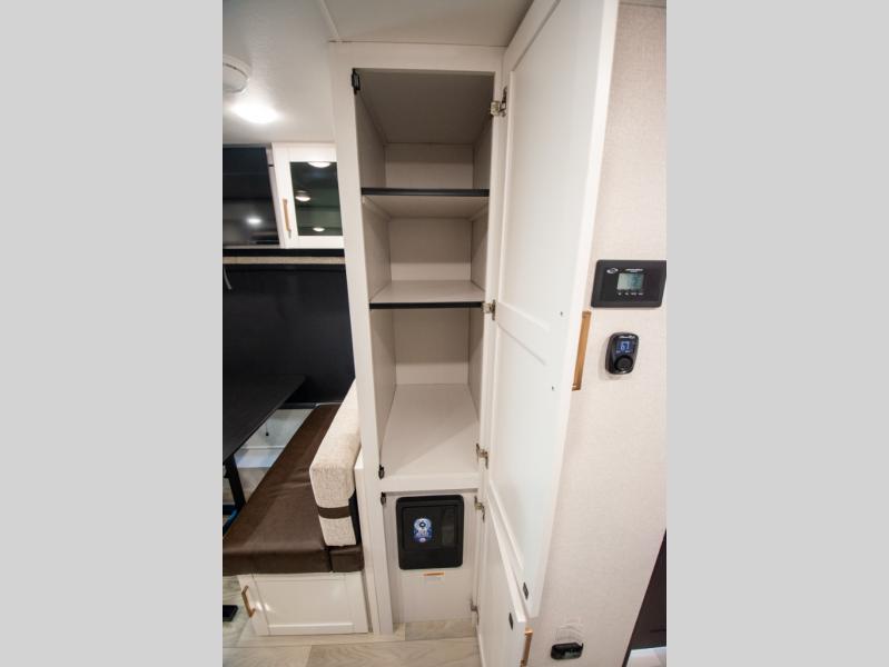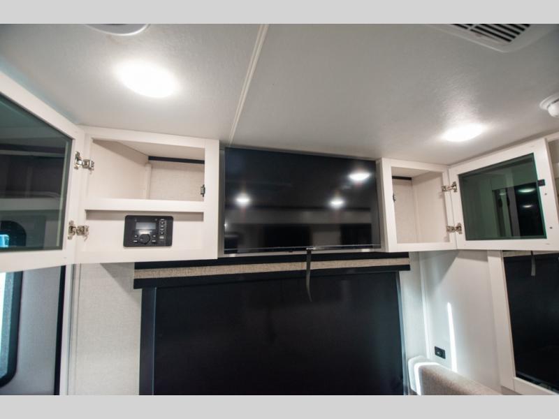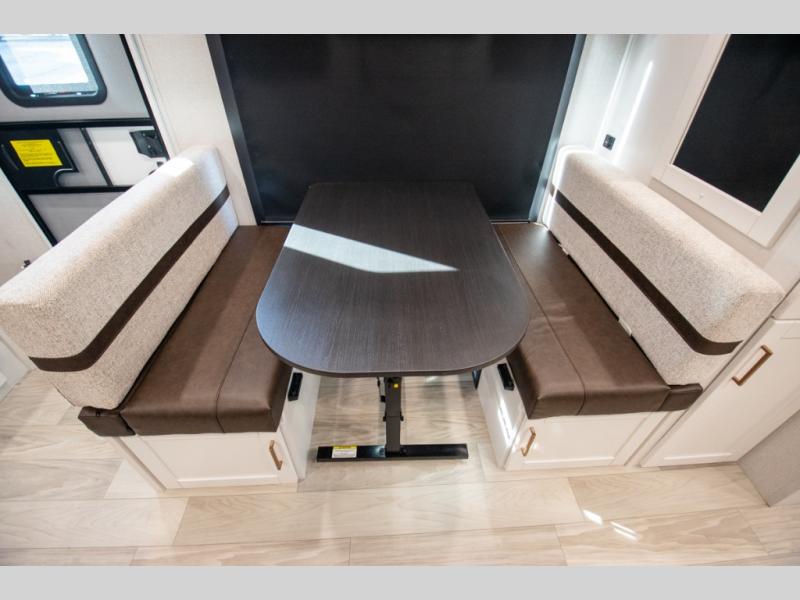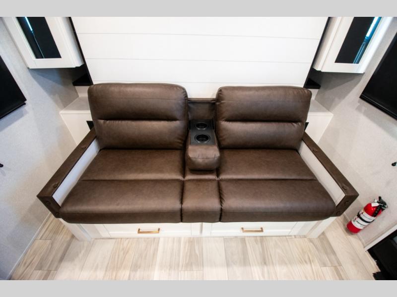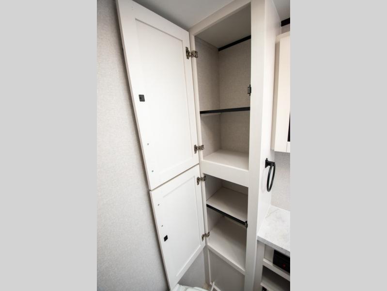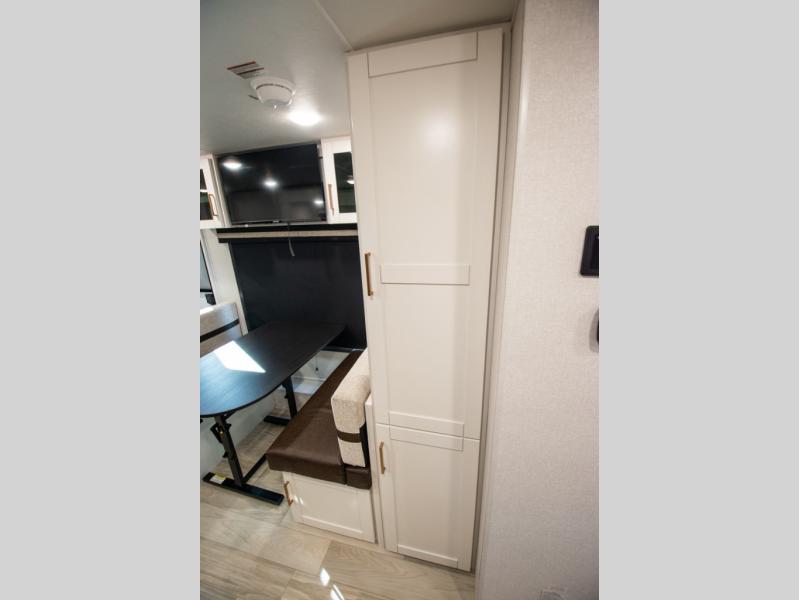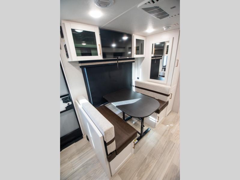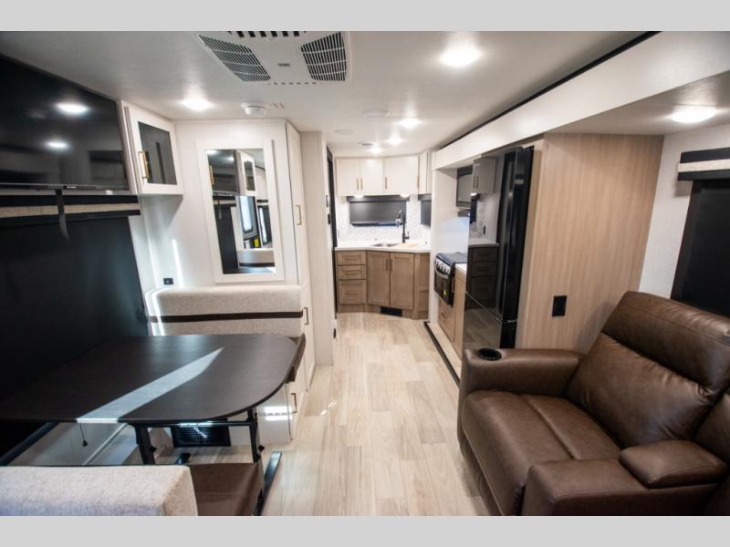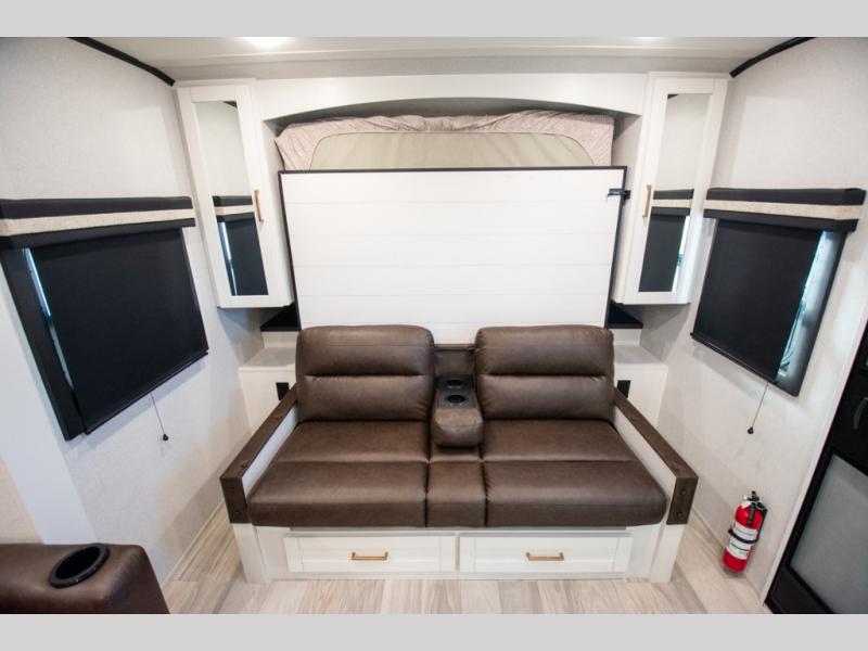 At the front of the trailer, you'll find a versatile 60" x 75" queen Murphy bed that easily converts into a 60" Jack Knife sofa, offering comfortable seating during the day and a cozy sleeping space at night. The slide-out expands the living area with a 60" theater seat, perfect for relaxing, while also housing a fully equipped kitchen with a three-burner range and an 11 cu. ft. refrigerator, making meal prep easy and convenient. Across from the slide, a spacious 38" x 68" dinette provides additional seating for meals, games, or gathering, situated right next to a pantry for storing all your dry goods. In the rear corner, the bathroom includes a roomy 40" shower, a foot-flush toilet, and a linen closet to keep towels and essentials neatly organized and within reach.