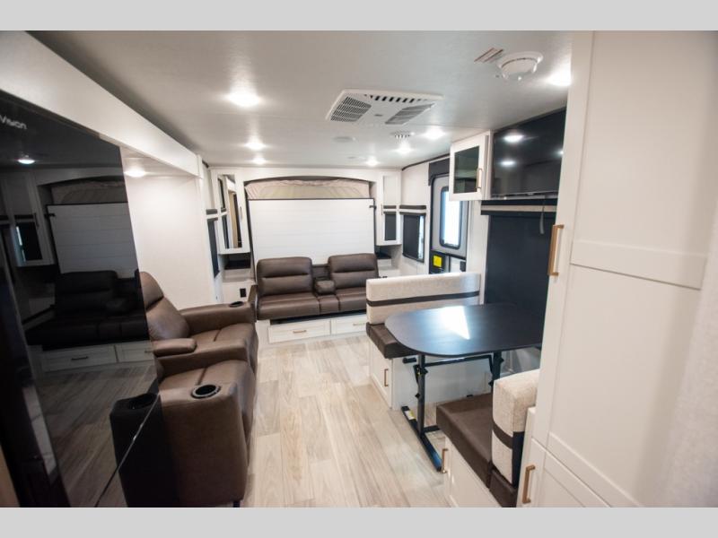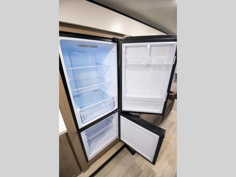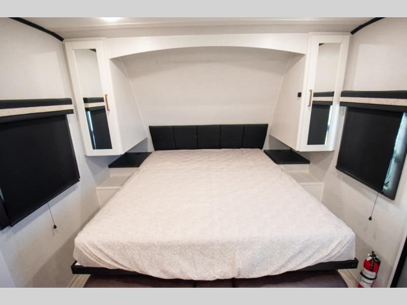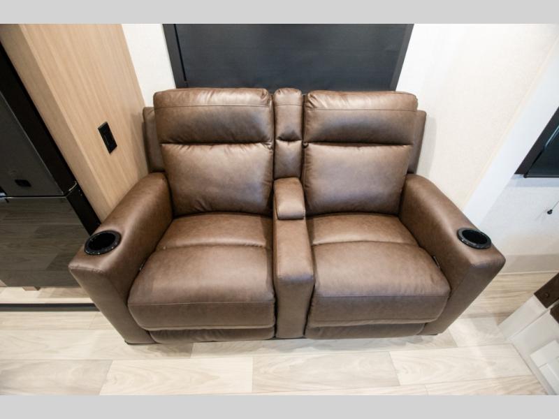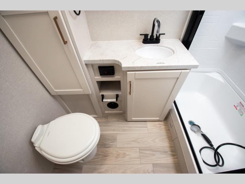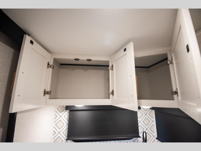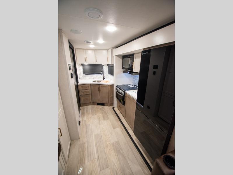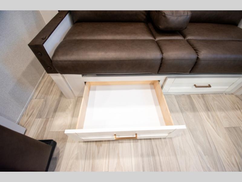 At the front of the trailer, you'll find a versatile 60" x 75" queen Murphy bed that easily converts into a 60" Jack Knife sofa, offering comfortable seating during the day and a cozy sleeping space at night. The slide-out expands the living area with a 60" theater seat, perfect for relaxing, while also housing a fully equipped kitchen with a three-burner range and an 11 cu. ft. refrigerator, making meal prep easy and convenient. Across from the slide, a spacious 38" x 68" dinette provides additional seating for meals, games, or gathering, situated right next to a pantry for storing all your dry goods. In the rear corner, the bathroom includes a roomy 40" shower, a foot-flush toilet, and a linen closet to keep towels and essentials neatly organized and within reach.