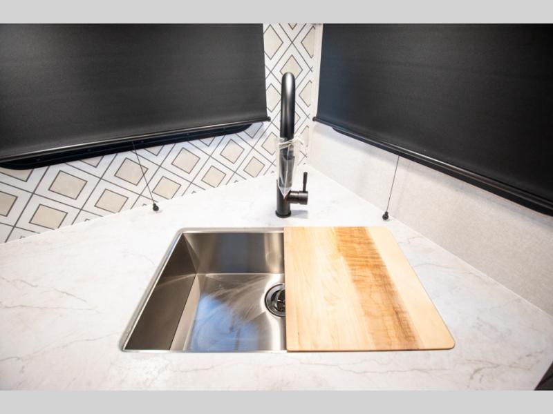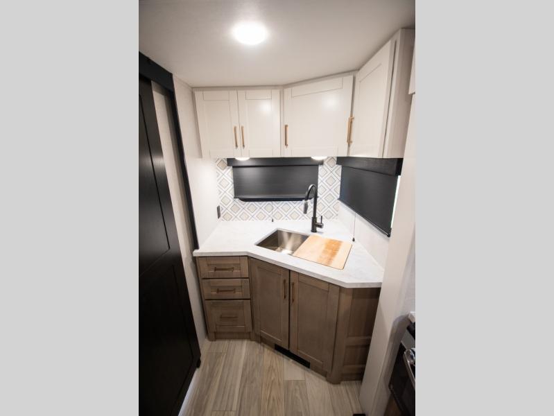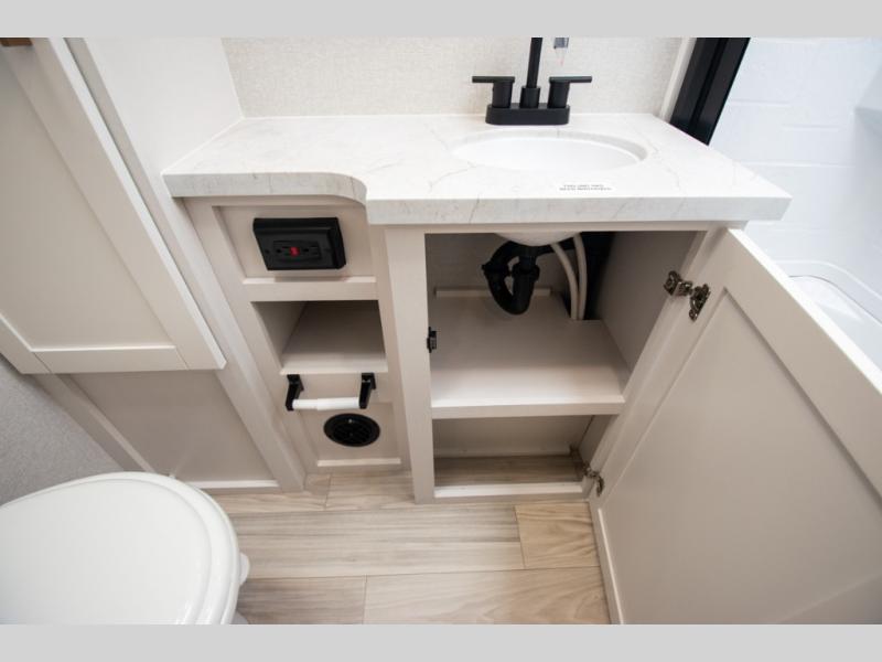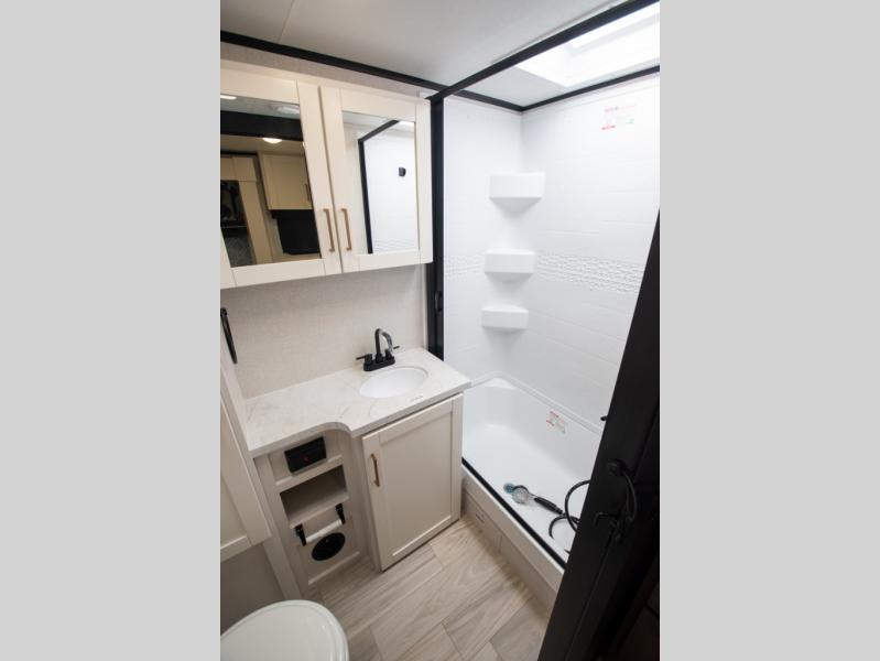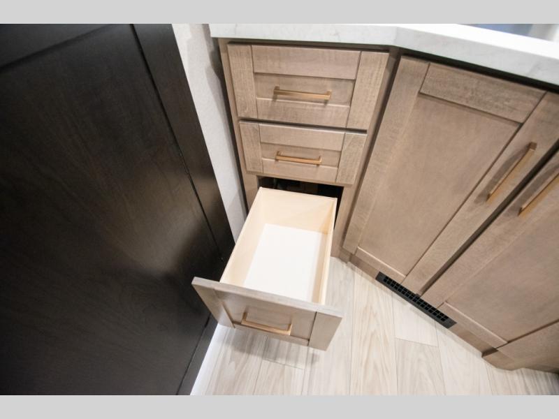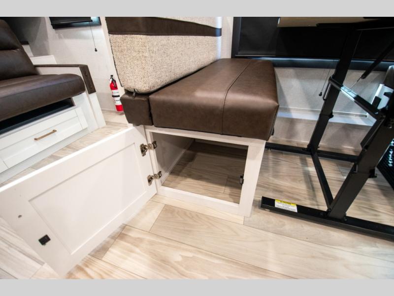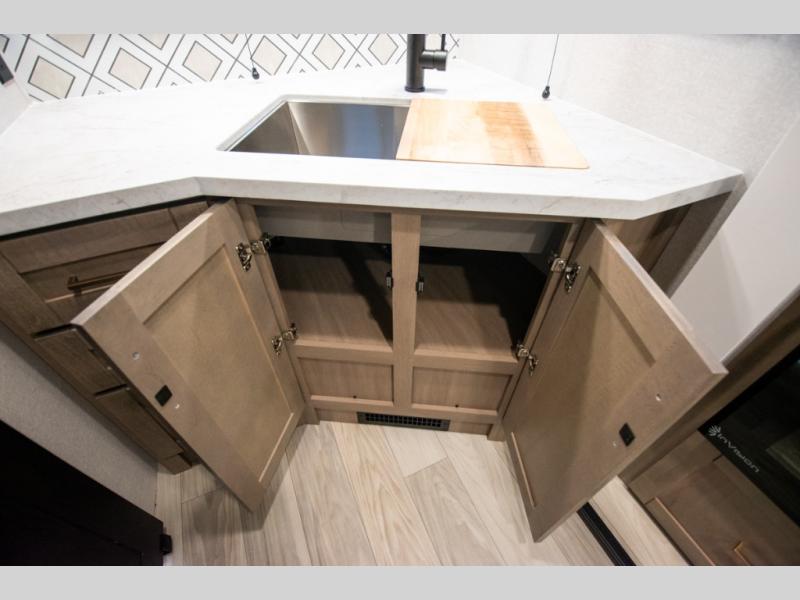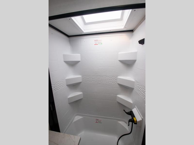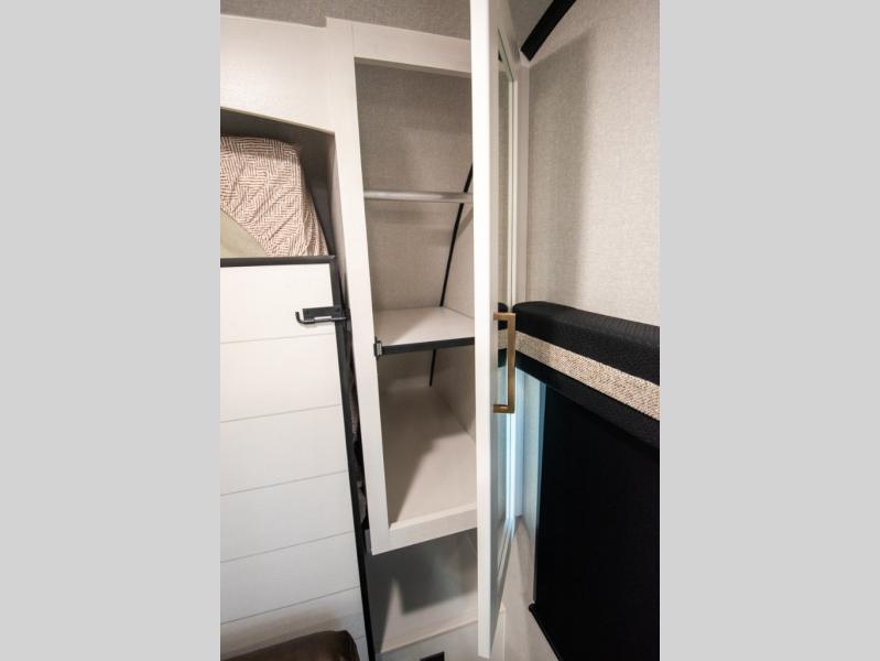 At the front of the trailer, you'll find a versatile 60" x 75" queen Murphy bed that easily converts into a 60" Jack Knife sofa, offering comfortable seating during the day and a cozy sleeping space at night. The slide-out expands the living area with a 60" theater seat, perfect for relaxing, while also housing a fully equipped kitchen with a three-burner range and an 11 cu. ft. refrigerator, making meal prep easy and convenient. Across from the slide, a spacious 38" x 68" dinette provides additional seating for meals, games, or gathering, situated right next to a pantry for storing all your dry goods. In the rear corner, the bathroom includes a roomy 40" shower, a foot-flush toilet, and a linen closet to keep towels and essentials neatly organized and within reach.