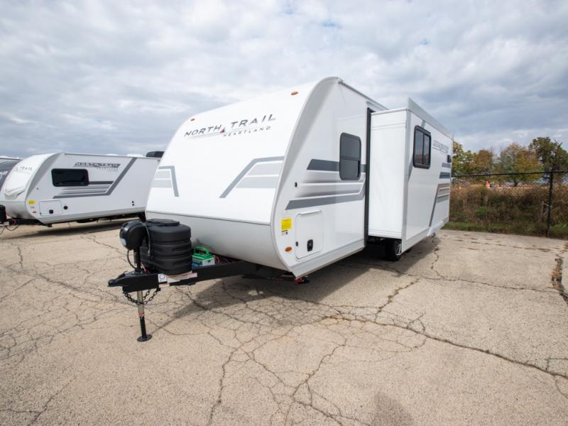 Built for comfort, durability, and modern convenience, these Heartland North Trail travel trailers offer everything you need for a premium camping experience. Each model features a strong American-made Norco Z-frame with an aerodynamic front profile and front diamond plating for added protection. The exclusive TrusstXL Roof System and CoreShield vacuum-bonded walls with Azdel provide superior insulation. Inside, enjoy residential comforts like seamless countertops, solid hardwood maple cabinet doors, LED lighting throughout, and 60 x 80 in. queen beds or 60 x 76 in. Murphy beds. Tech-ready features include an LED smart TV, USB ports, TPMS monitoring, and a 200W solar panel with 30 AMP digital controller. With a Quiet Series A/C, on-demand 60K BTU water heater, with these trailers you are equipped to make every trip comfortable and adventure-ready.
