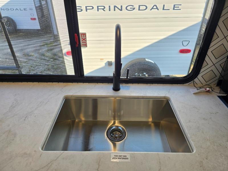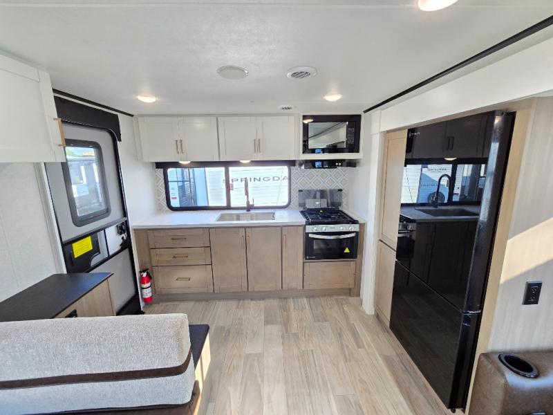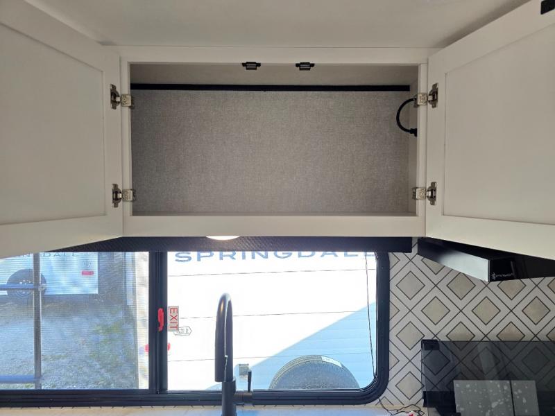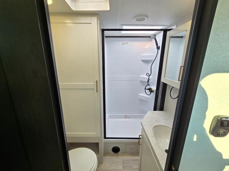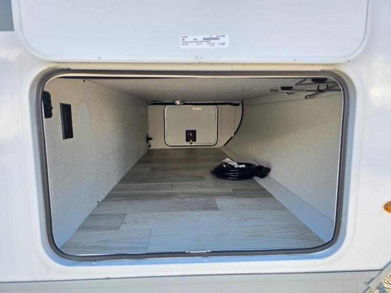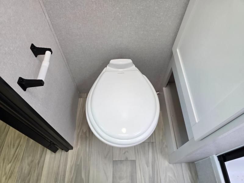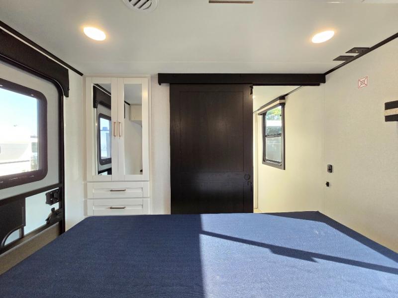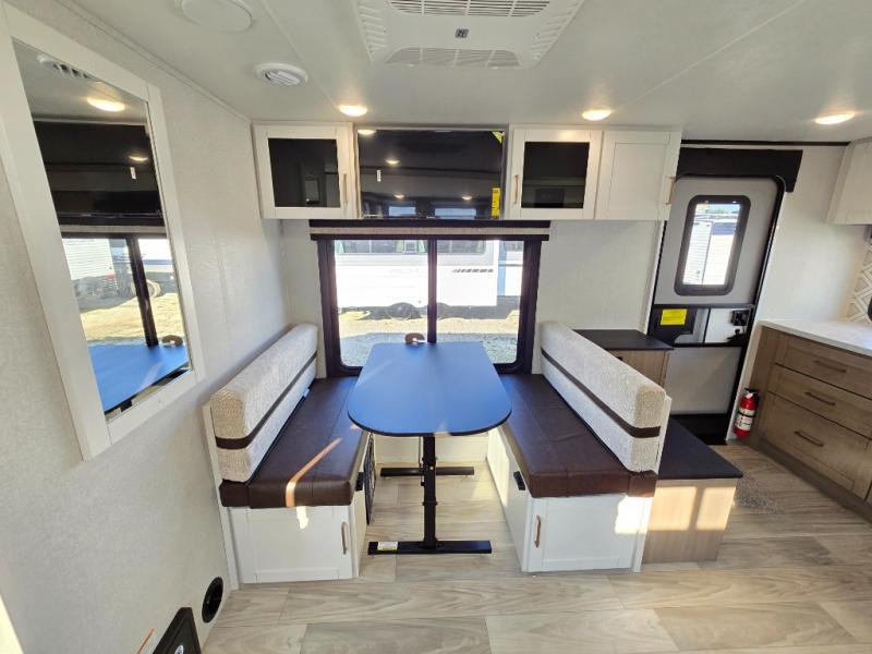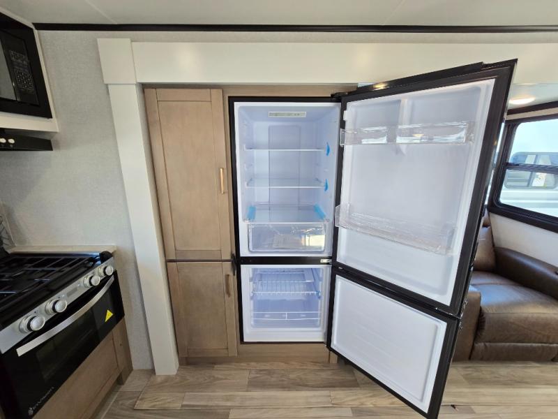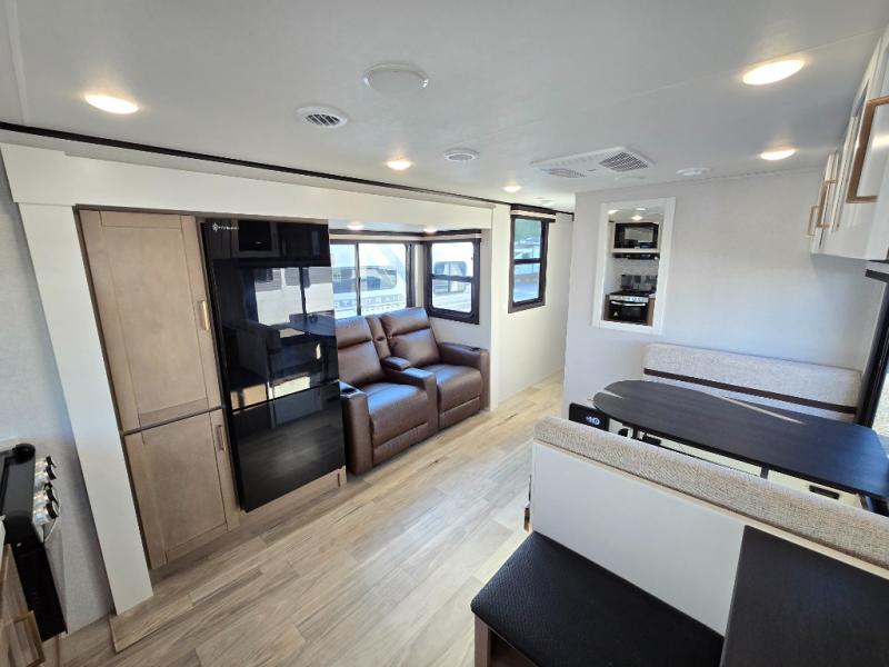 At the front of this travel trailer, you'll find a private bedroom featuring a spacious 60" x 80" queen bed, complete with pull-out nightstands and wardrobes on each side for convenient storage of clothes and essentials. One of the two entry doors is located here, providing added privacy and easy access. Moving down the hall, the full bathroom offers a 30" x 36" shower, a porcelain foot-flush toilet, and a linen cabinet to keep towels and hygiene items neatly organized. In the main living area, you can enjoy meals or game nights at the 38" x 68" booth dinette, while the 60" theater seat in the slide-out provides a cozy spot to relax. At the rear, the kitchen spans the full width of the trailer and includes a stainless-steel single-basin sink with a high-rise pullout faucet and butcher block cutting board, a three-burner range, and generous seamless countertops. Also, in the slide-out are a pantry and an 11-cu. ft. refrigerator, giving you plenty of room to store food, snacks, and leftovers for the whole trip. The second entry door is located in between the kitchen and dinette for your convenience.