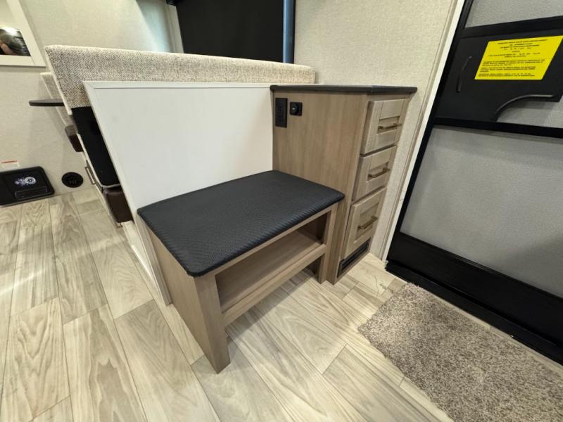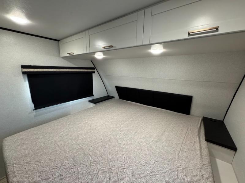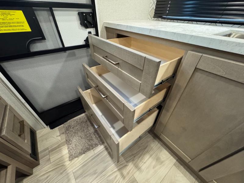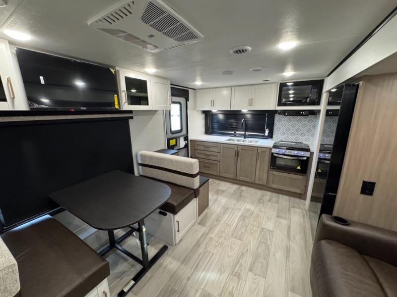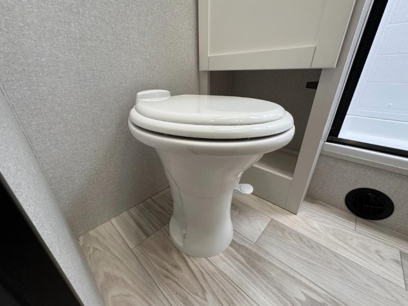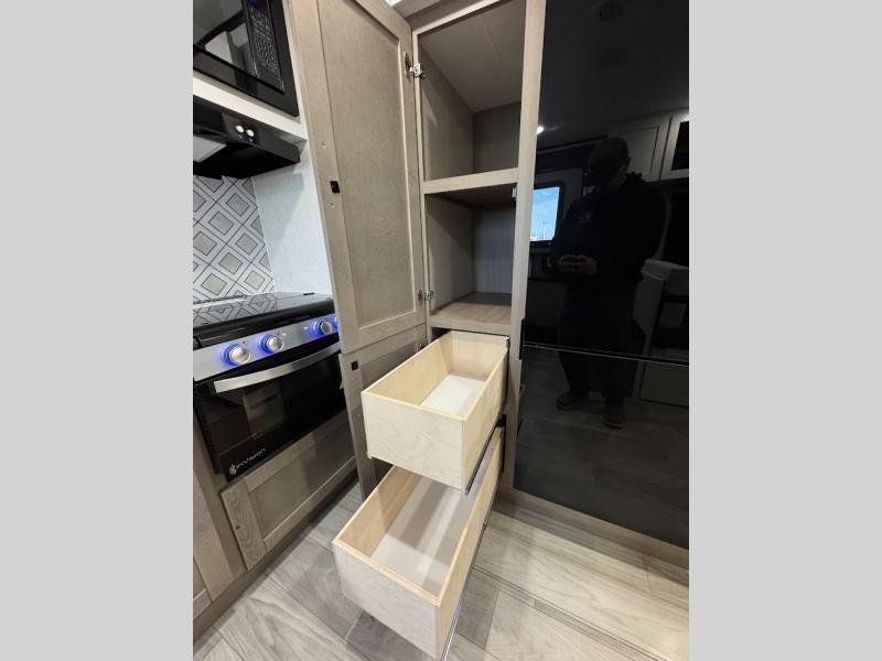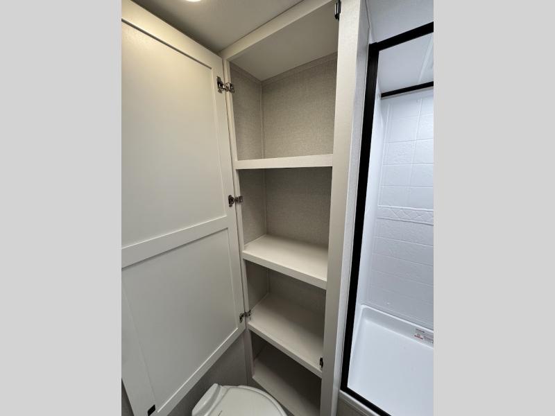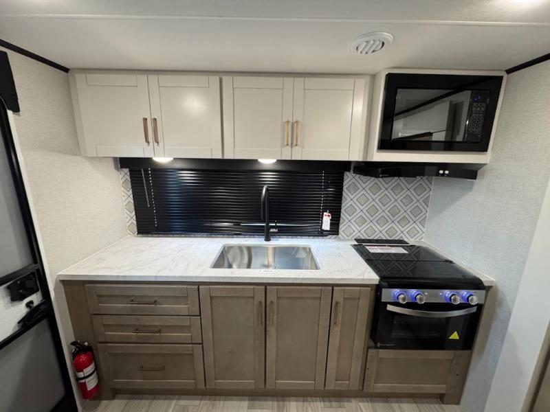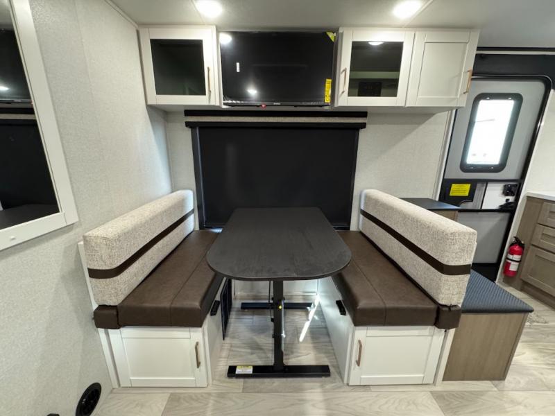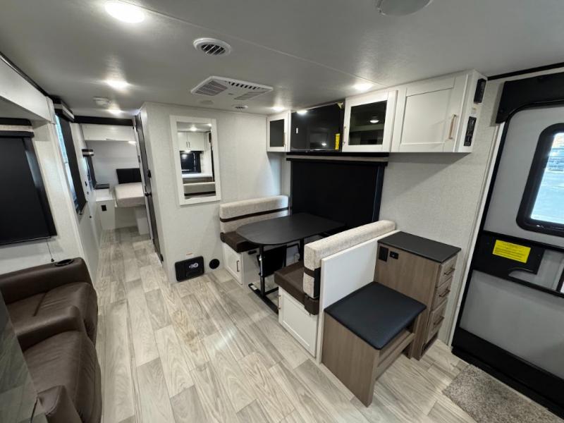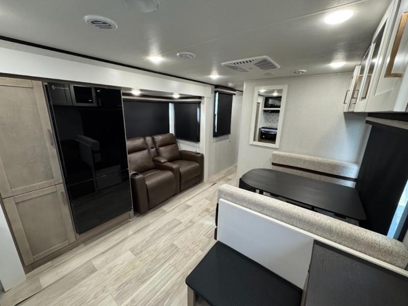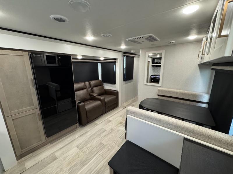At the front of this travel trailer, you'll find a private bedroom featuring a spacious 60" x 80" queen bed, complete with pull-out nightstands and wardrobes on each side for convenient storage of clothes and essentials. One of the two entry doors is located here, providing added privacy and easy access. Moving down the hall, the full bathroom offers a 30" x 36" shower, a porcelain foot-flush toilet, and a linen cabinet to keep towels and hygiene items neatly organized. In the main living area, you can enjoy meals or game nights at the 38" x 68" booth dinette, while the 60" theater seat in the slide-out provides a cozy spot to relax. At the rear, the kitchen spans the full width of the trailer and includes a stainless-steel single-basin sink with a high-rise pullout faucet and butcher block cutting board, a three-burner range, and generous seamless countertops. Also, in the slide-out are a pantry and an 11-cu. ft. refrigerator, giving you plenty of room to store food, snacks, and leftovers for the whole trip. The second entry door is located in between the kitchen and dinette for your convenience.
