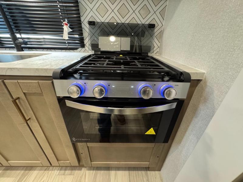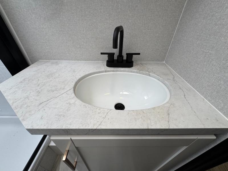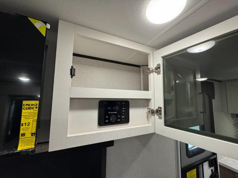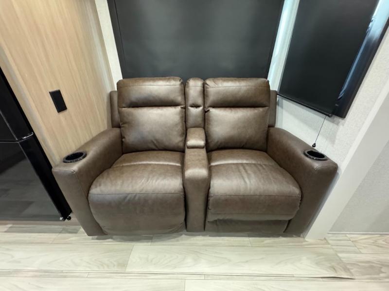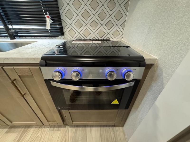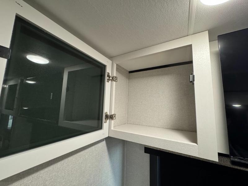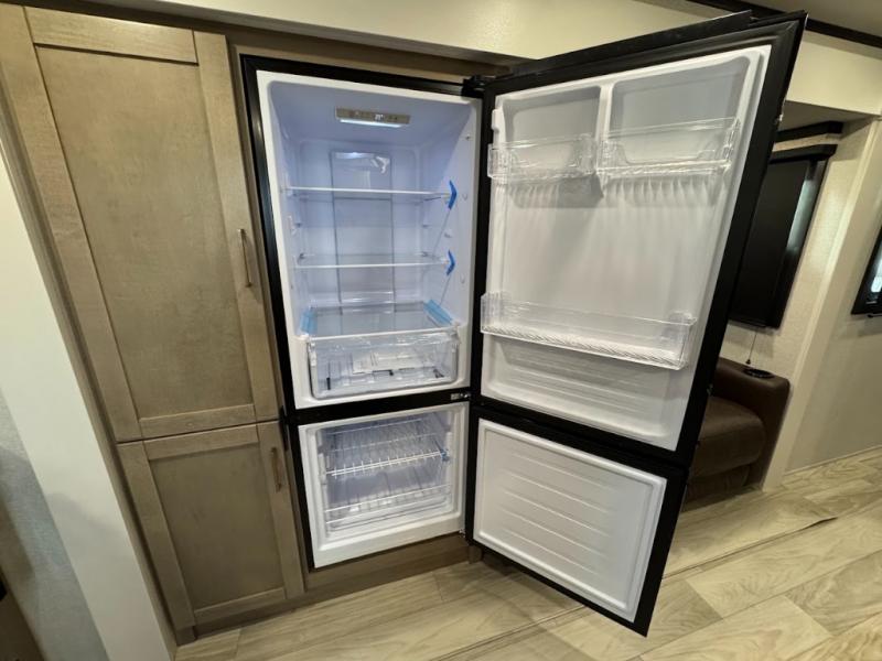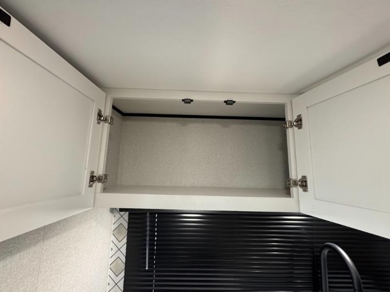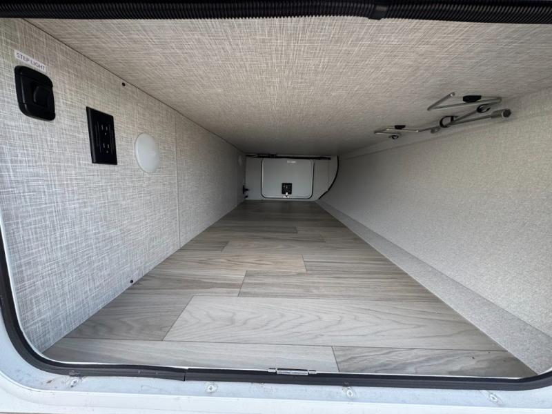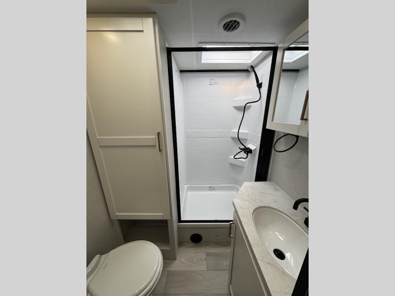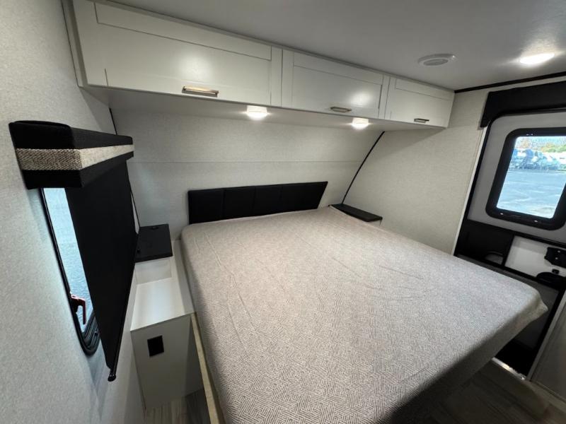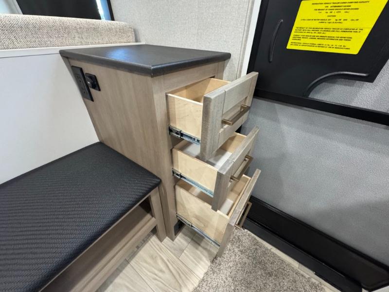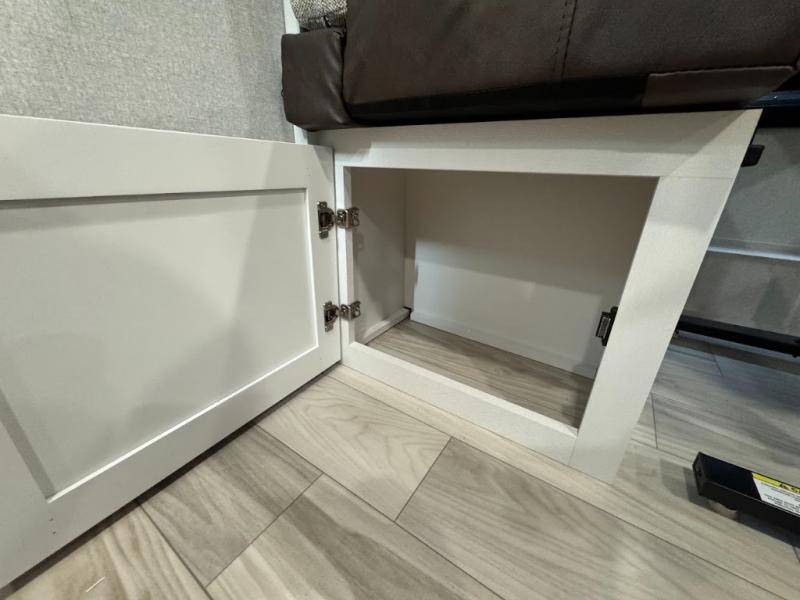 At the front of this travel trailer, you'll find a private bedroom featuring a spacious 60" x 80" queen bed, complete with pull-out nightstands and wardrobes on each side for convenient storage of clothes and essentials. One of the two entry doors is located here, providing added privacy and easy access. Moving down the hall, the full bathroom offers a 30" x 36" shower, a porcelain foot-flush toilet, and a linen cabinet to keep towels and hygiene items neatly organized. In the main living area, you can enjoy meals or game nights at the 38" x 68" booth dinette, while the 60" theater seat in the slide-out provides a cozy spot to relax. At the rear, the kitchen spans the full width of the trailer and includes a stainless-steel single-basin sink with a high-rise pullout faucet and butcher block cutting board, a three-burner range, and generous seamless countertops. Also, in the slide-out are a pantry and an 11-cu. ft. refrigerator, giving you plenty of room to store food, snacks, and leftovers for the whole trip. The second entry door is located in between the kitchen and dinette for your convenience.