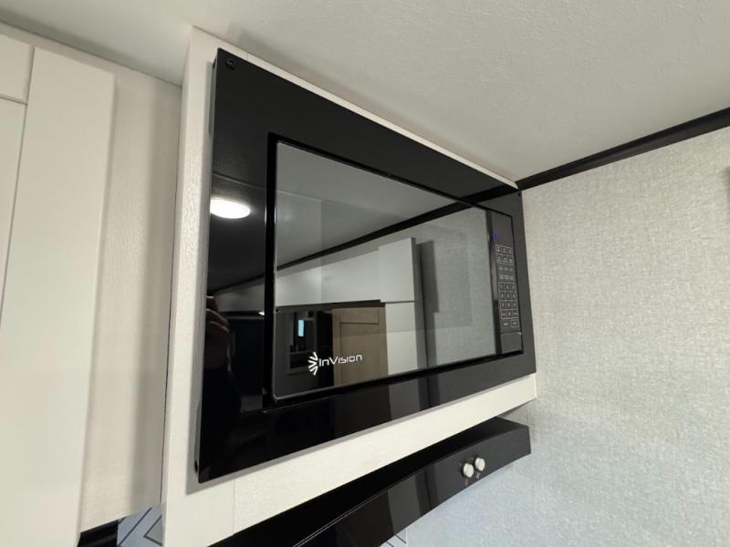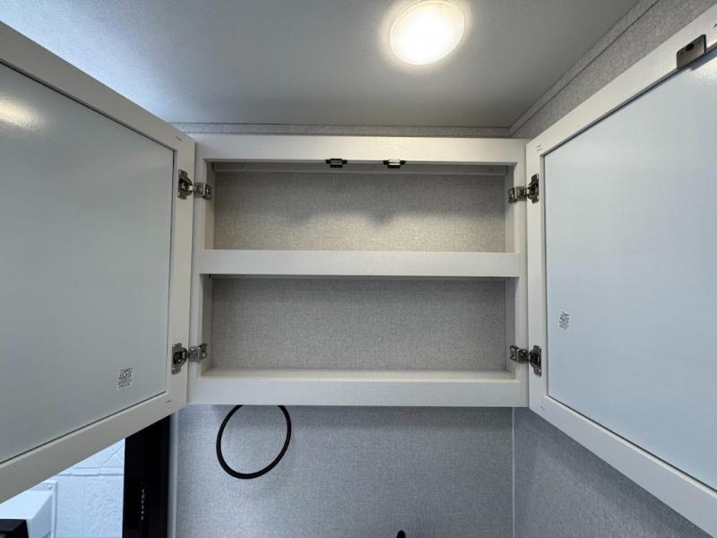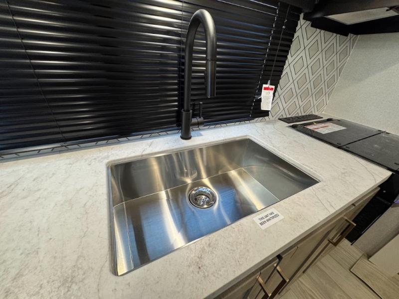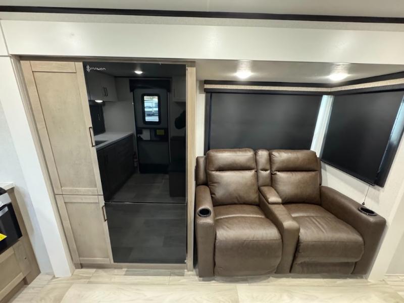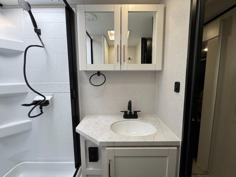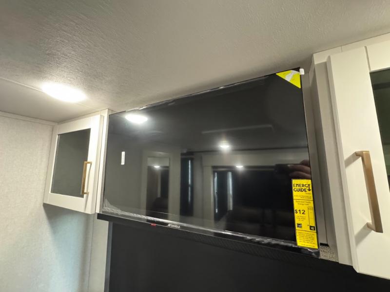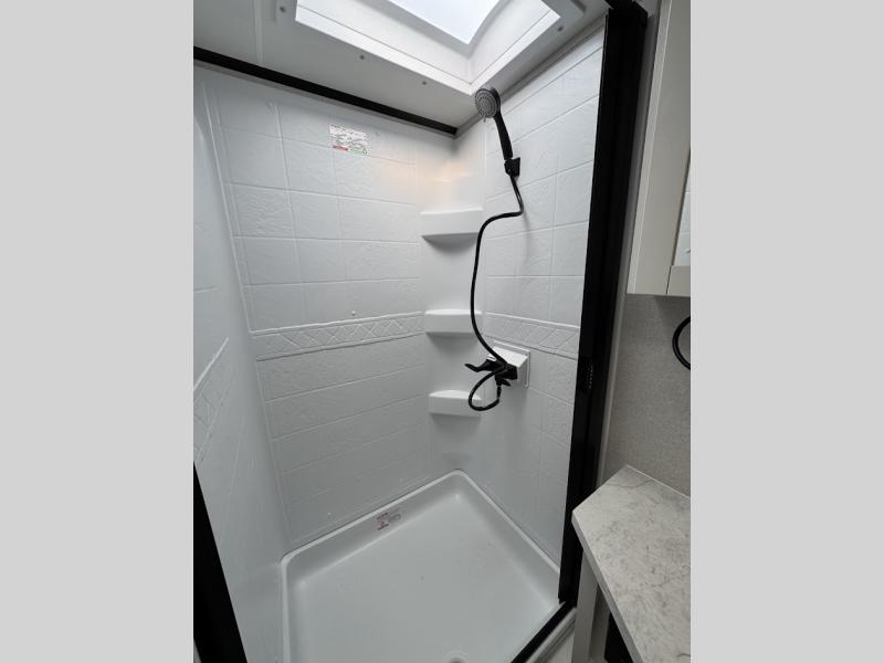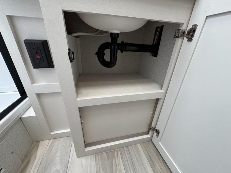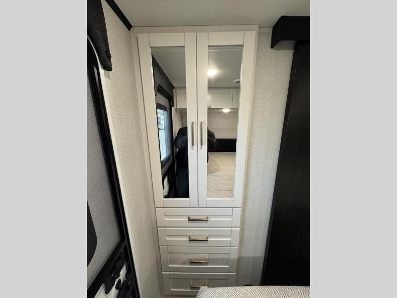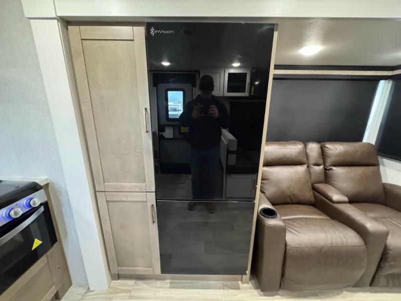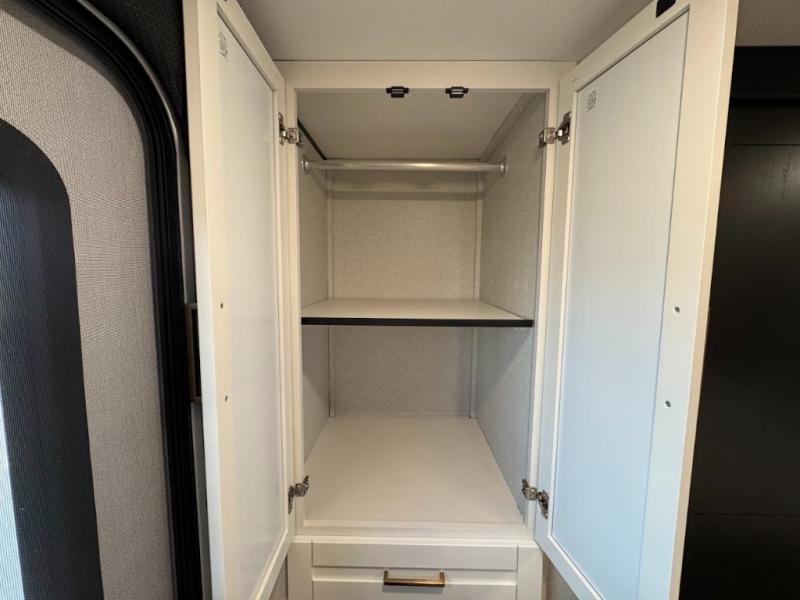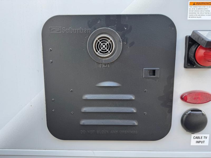 At the front of this travel trailer, you'll find a private bedroom featuring a spacious 60" x 80" queen bed, complete with pull-out nightstands and wardrobes on each side for convenient storage of clothes and essentials. One of the two entry doors is located here, providing added privacy and easy access. Moving down the hall, the full bathroom offers a 30" x 36" shower, a porcelain foot-flush toilet, and a linen cabinet to keep towels and hygiene items neatly organized. In the main living area, you can enjoy meals or game nights at the 38" x 68" booth dinette, while the 60" theater seat in the slide-out provides a cozy spot to relax. At the rear, the kitchen spans the full width of the trailer and includes a stainless-steel single-basin sink with a high-rise pullout faucet and butcher block cutting board, a three-burner range, and generous seamless countertops. Also, in the slide-out are a pantry and an 11-cu. ft. refrigerator, giving you plenty of room to store food, snacks, and leftovers for the whole trip. The second entry door is located in between the kitchen and dinette for your convenience.