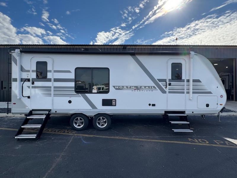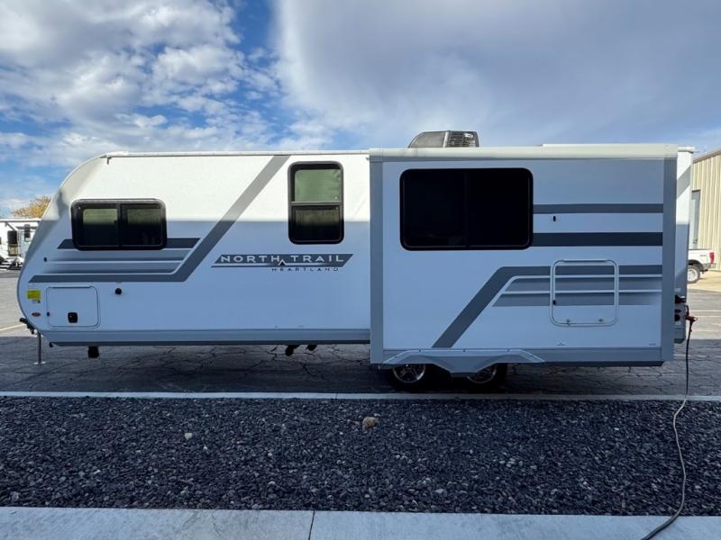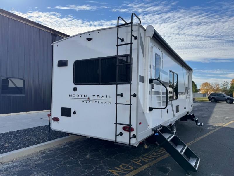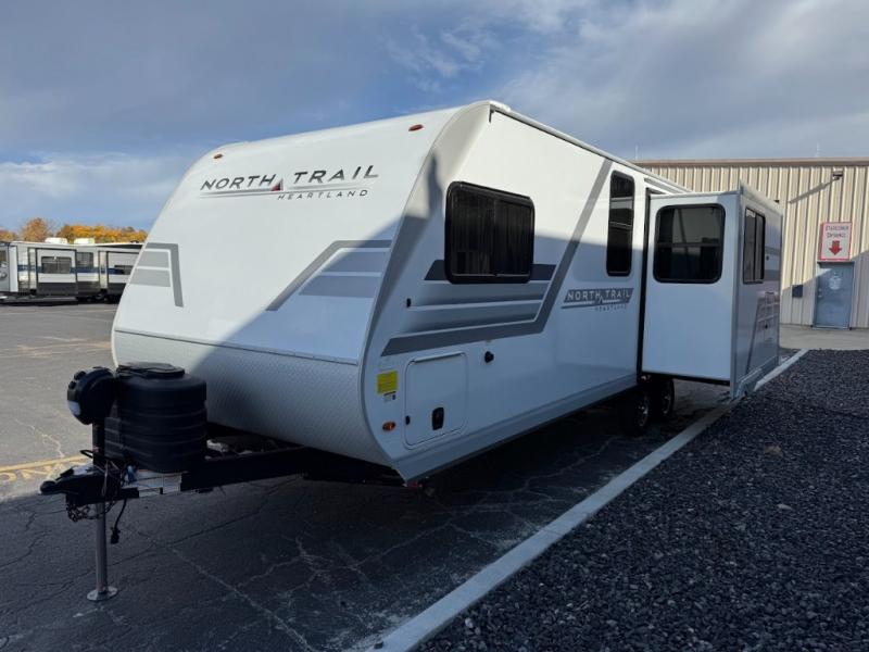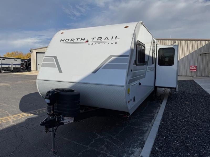 Built for comfort, durability, and modern convenience, these Heartland North Trail travel trailers offer everything you need for a premium camping experience. Each model features a strong American-made Norco Z-frame with an aerodynamic front profile and front diamond plating for added protection. The exclusive TrusstXL Roof System and CoreShield vacuum-bonded walls with Azdel provide superior insulation. Inside, enjoy residential comforts like seamless countertops, solid hardwood maple cabinet doors, LED lighting throughout, and 60 x 80 in. queen beds or 60 x 76 in. Murphy beds. Tech-ready features include an LED smart TV, USB ports, TPMS monitoring, and a 200W solar panel with 30 AMP digital controller. With a Quiet Series A/C, on-demand 60K BTU water heater, with these trailers you are equipped to make every trip comfortable and adventure-ready.