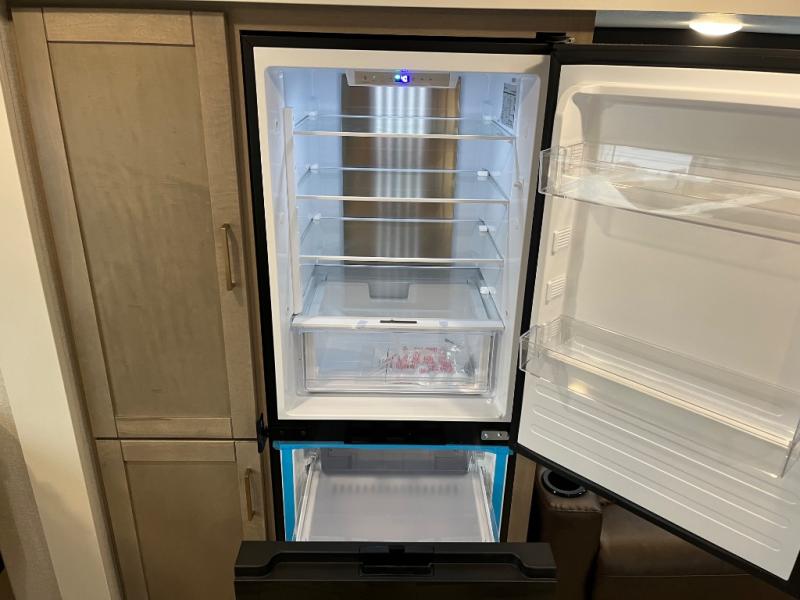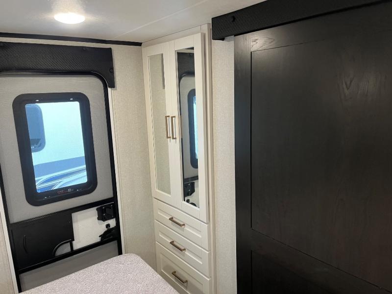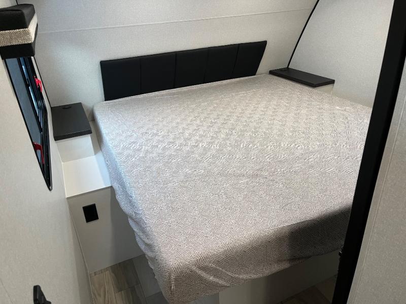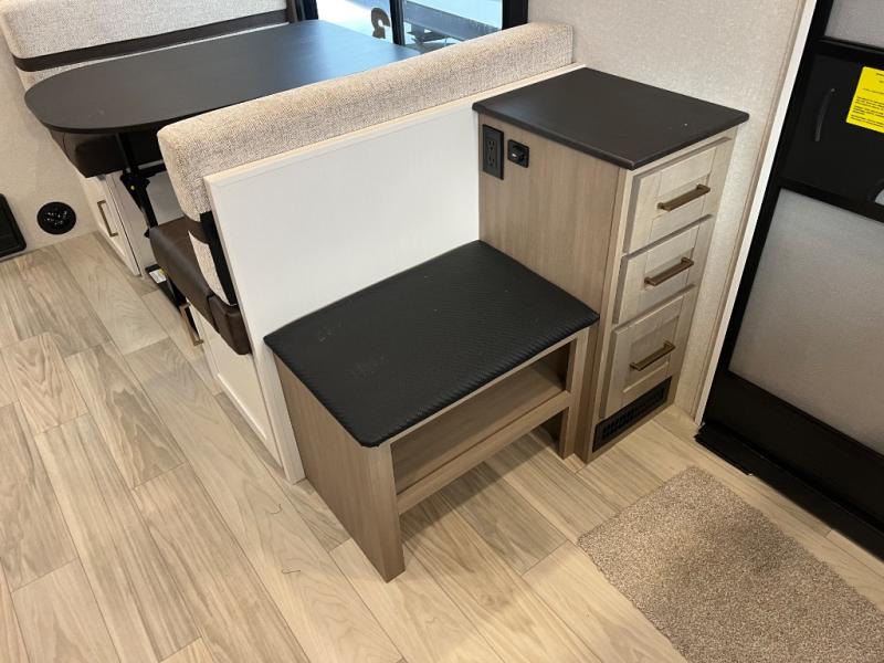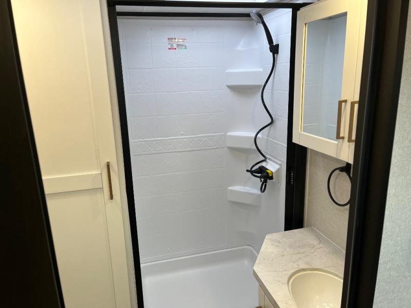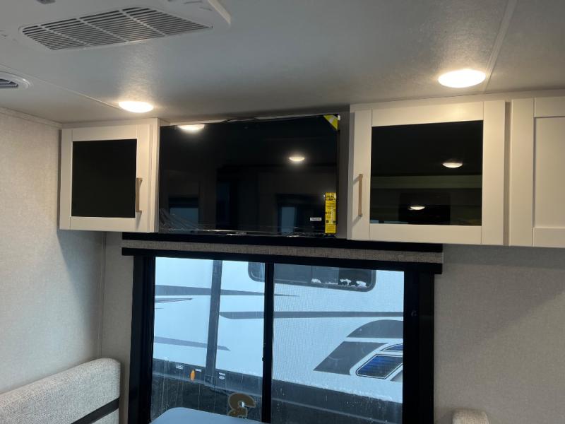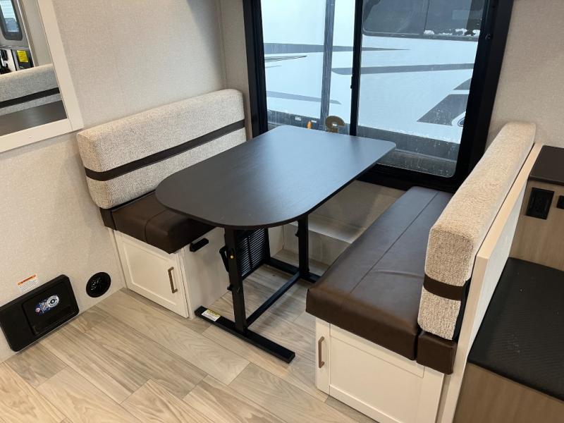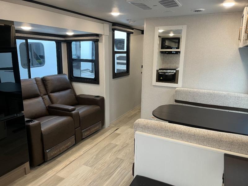 At the front of this travel trailer, you'll find a private bedroom featuring a spacious 60" x 80" queen bed, complete with pull-out nightstands and wardrobes on each side for convenient storage of clothes and essentials. One of the two entry doors is located here, providing added privacy and easy access. Moving down the hall, the full bathroom offers a 30" x 36" shower, a porcelain foot-flush toilet, and a linen cabinet to keep towels and hygiene items neatly organized. In the main living area, you can enjoy meals or game nights at the 38" x 68" booth dinette, while the 60" theater seat in the slide-out provides a cozy spot to relax. At the rear, the kitchen spans the full width of the trailer and includes a stainless-steel single-basin sink with a high-rise pullout faucet and butcher block cutting board, a three-burner range, and generous seamless countertops. Also, in the slide-out are a pantry and an 11-cu. ft. refrigerator, giving you plenty of room to store food, snacks, and leftovers for the whole trip. The second entry door is located in between the kitchen and dinette for your convenience.