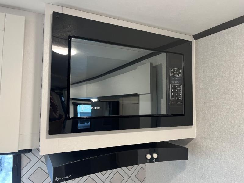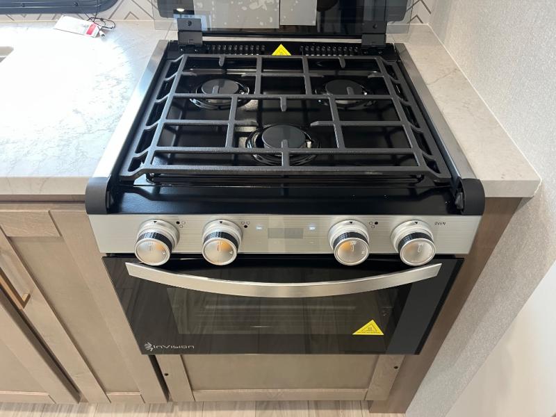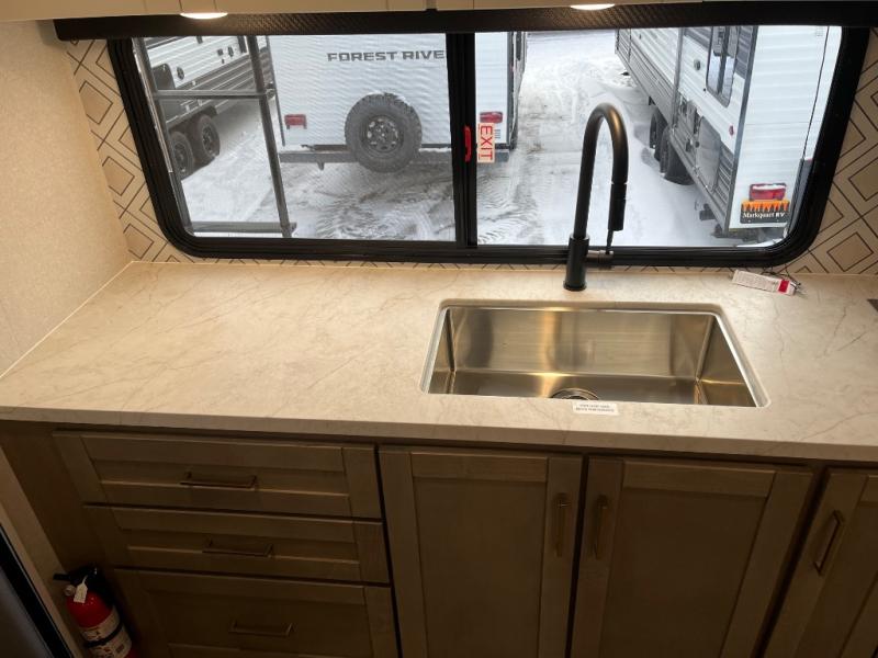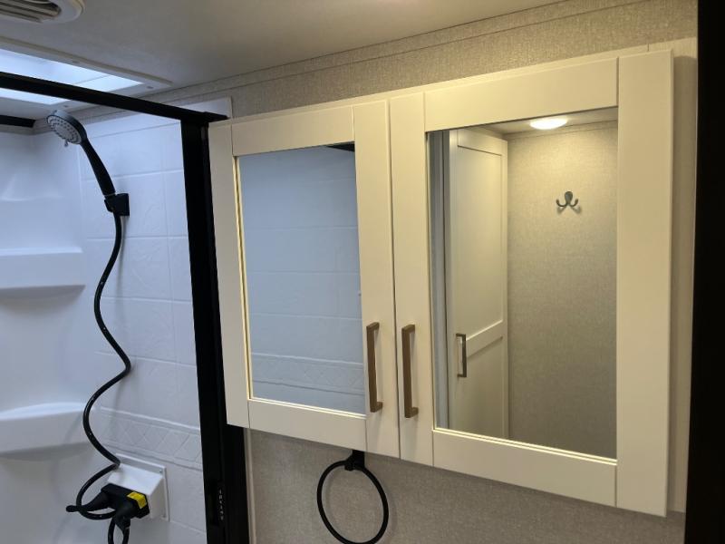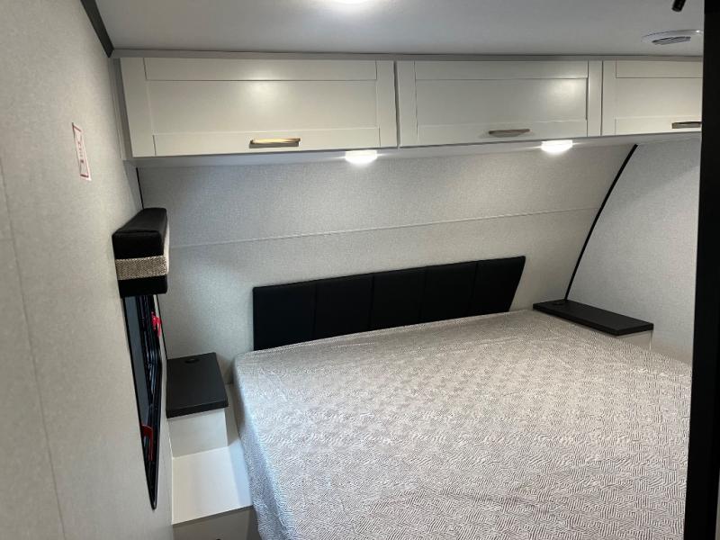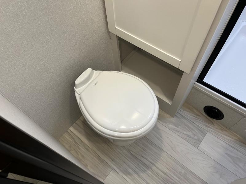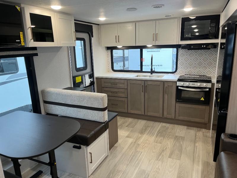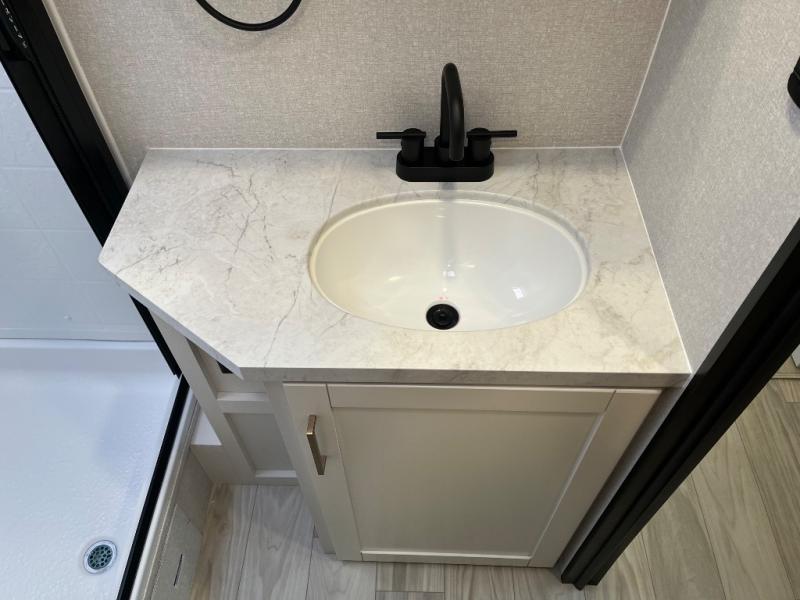 At the front of this travel trailer, you'll find a private bedroom featuring a spacious 60" x 80" queen bed, complete with pull-out nightstands and wardrobes on each side for convenient storage of clothes and essentials. One of the two entry doors is located here, providing added privacy and easy access. Moving down the hall, the full bathroom offers a 30" x 36" shower, a porcelain foot-flush toilet, and a linen cabinet to keep towels and hygiene items neatly organized. In the main living area, you can enjoy meals or game nights at the 38" x 68" booth dinette, while the 60" theater seat in the slide-out provides a cozy spot to relax. At the rear, the kitchen spans the full width of the trailer and includes a stainless-steel single-basin sink with a high-rise pullout faucet and butcher block cutting board, a three-burner range, and generous seamless countertops. Also, in the slide-out are a pantry and an 11-cu. ft. refrigerator, giving you plenty of room to store food, snacks, and leftovers for the whole trip. The second entry door is located in between the kitchen and dinette for your convenience.