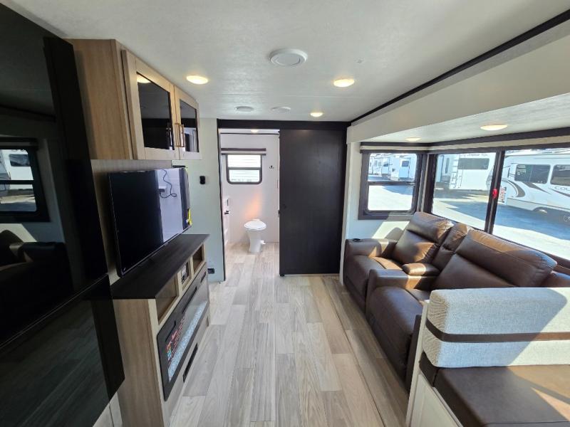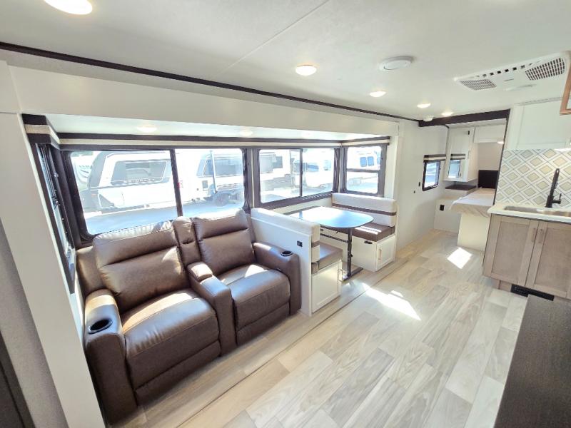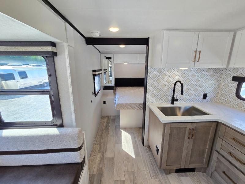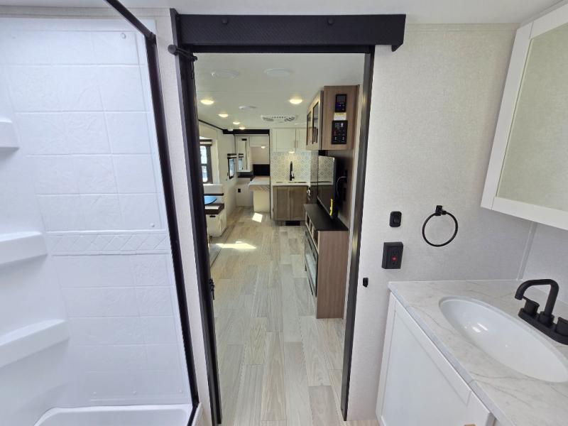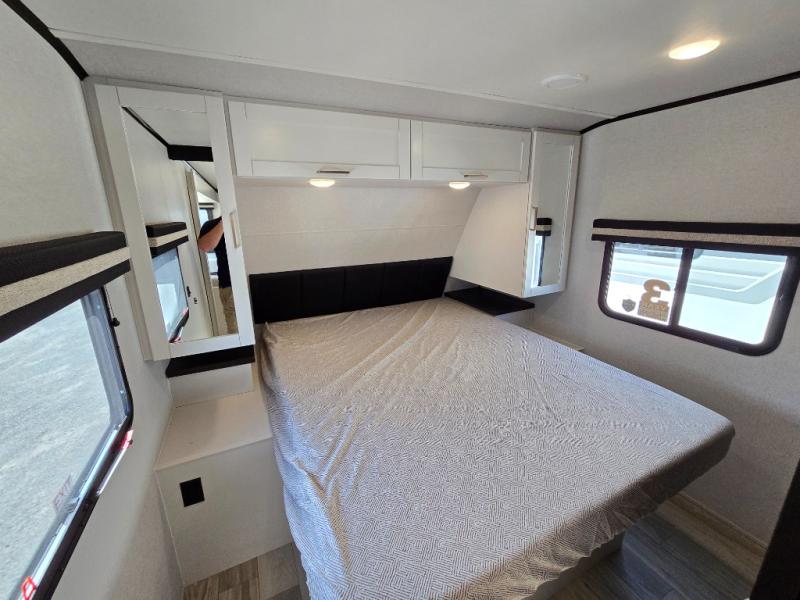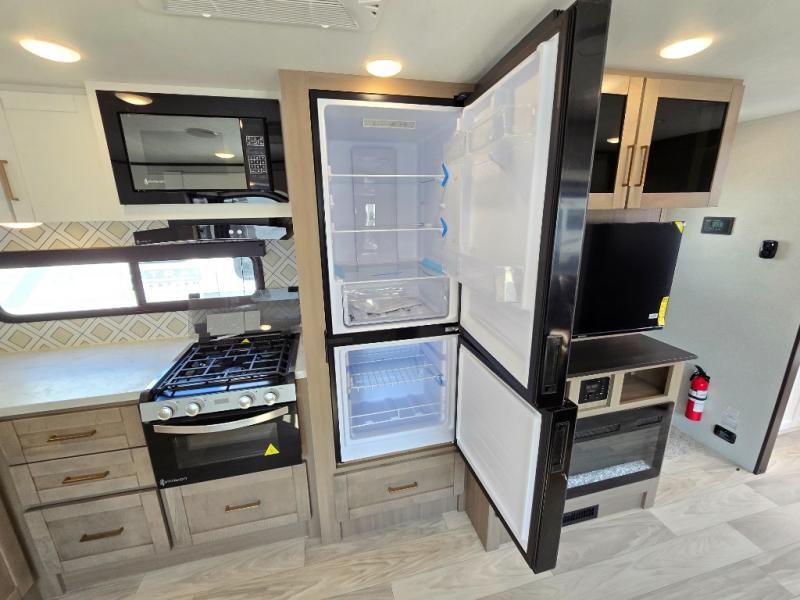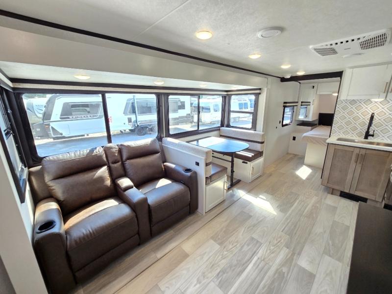 At the front of this travel trailer, you'll find a private bedroom featuring a 60" x 80" queen bed for a restful night’s sleep, in between nightstands on each side for added convenience. Moving into the center of the trailer, the main living area offers a spacious slide-out with a 60" tri-fold sofa perfect for lounging, and a 40" x 70" dinette ideal for meals, game nights, or gathering with friends and family—both of which convert into extra-sleeping space if needed. Across from the slide, the L-shaped kitchen is thoughtfully designed for ease and efficiency, featuring a stainless steel sink on one end, seamless countertop space for prepping meals, a three-burner range, and an 11 cu. ft. refrigerator for all your cooking essentials. Just beside the refrigerator is the entertainment center, with a walk-in pantry tucked behind it to store all your dry goods and snacks. At the rear, the full bathroom provides generous counter space, making it easy and comfortable to get ready each day.
