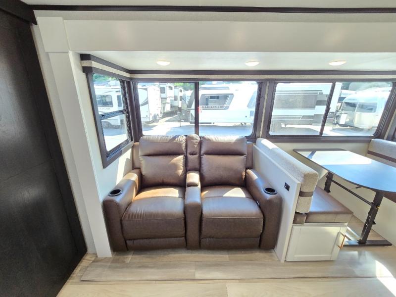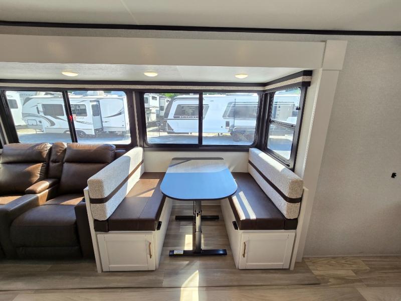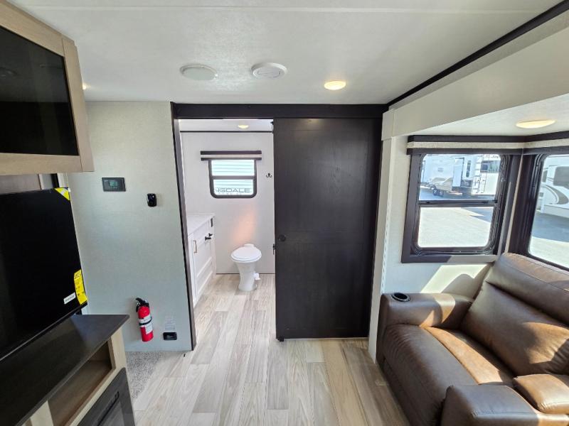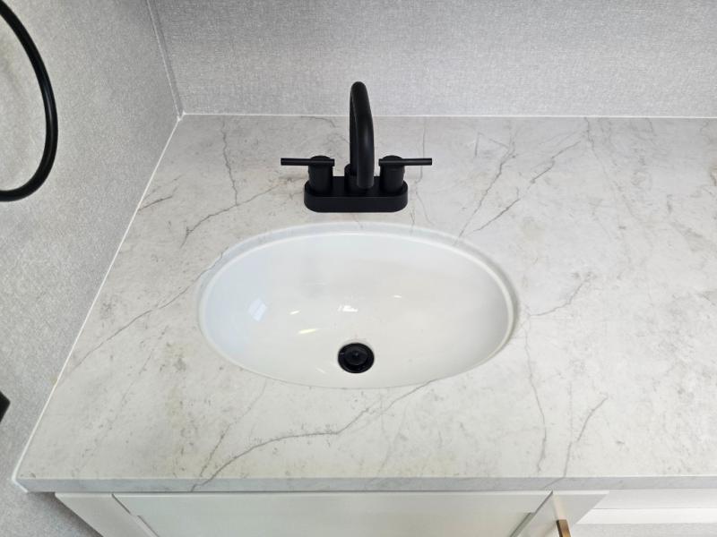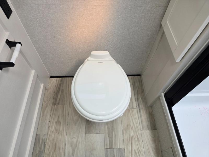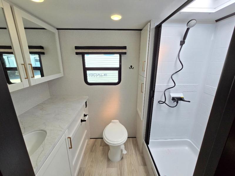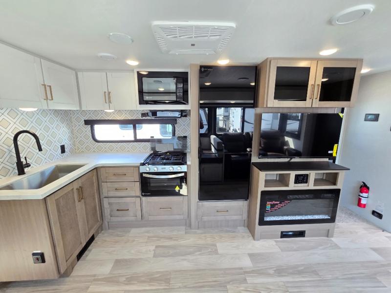 At the front of this travel trailer, you'll find a private bedroom featuring a 60" x 80" queen bed for a restful night’s sleep, in between nightstands on each side for added convenience. Moving into the center of the trailer, the main living area offers a spacious slide-out with a 60" tri-fold sofa perfect for lounging, and a 40" x 70" dinette ideal for meals, game nights, or gathering with friends and family—both of which convert into extra-sleeping space if needed. Across from the slide, the L-shaped kitchen is thoughtfully designed for ease and efficiency, featuring a stainless steel sink on one end, seamless countertop space for prepping meals, a three-burner range, and an 11 cu. ft. refrigerator for all your cooking essentials. Just beside the refrigerator is the entertainment center, with a walk-in pantry tucked behind it to store all your dry goods and snacks. At the rear, the full bathroom provides generous counter space, making it easy and comfortable to get ready each day.