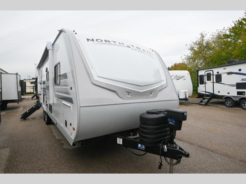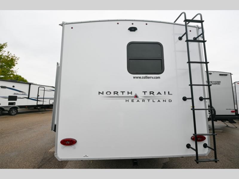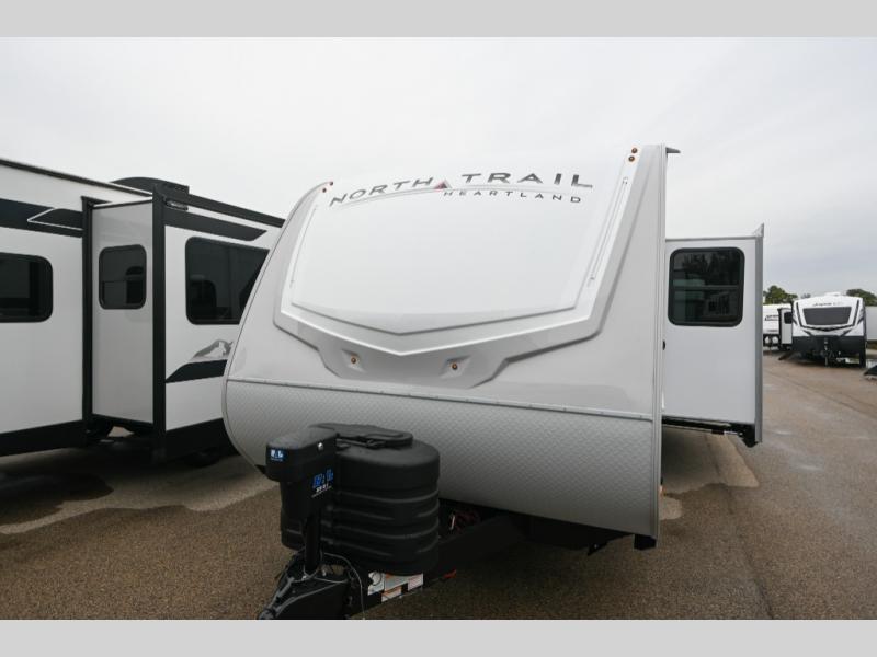 Built for comfort, durability, and modern convenience, these Heartland North Trail travel trailers offer everything you need for a premium camping experience. Each model features a strong American-made Norco Z-frame with an aerodynamic front profile and front diamond plating for added protection. The exclusive TrusstXL Roof System and CoreShield vacuum-bonded walls with Azdel provide superior insulation. Inside, enjoy residential comforts like seamless countertops, solid hardwood maple cabinet doors, LED lighting throughout, and 60 x 80 in. queen beds or 60 x 76 in. Murphy beds. Tech-ready features include an LED smart TV, USB ports, TPMS monitoring, and a 200W solar panel with 30 AMP digital controller. With a Quiet Series A/C, on-demand 60K BTU water heater, with these trailers you are equipped to make every trip comfortable and adventure-ready.