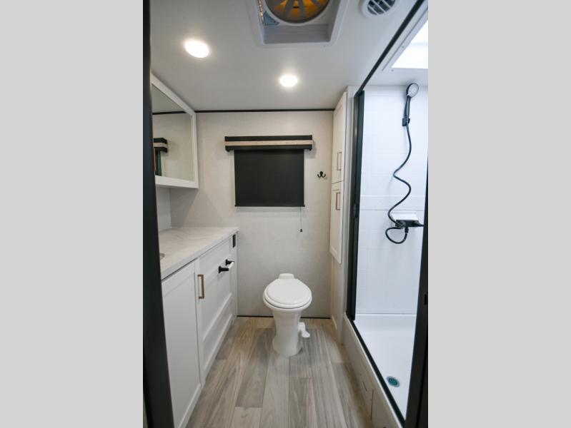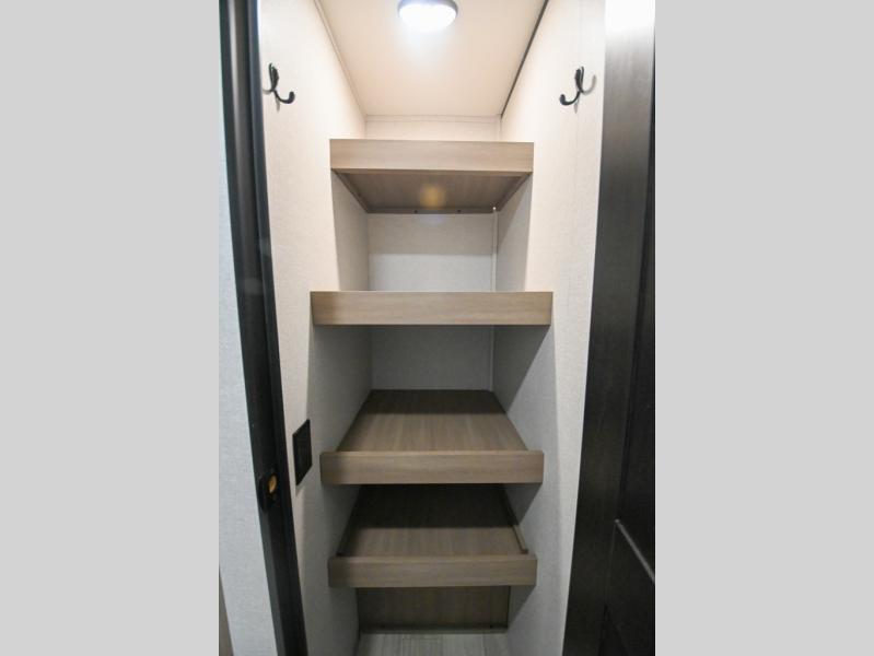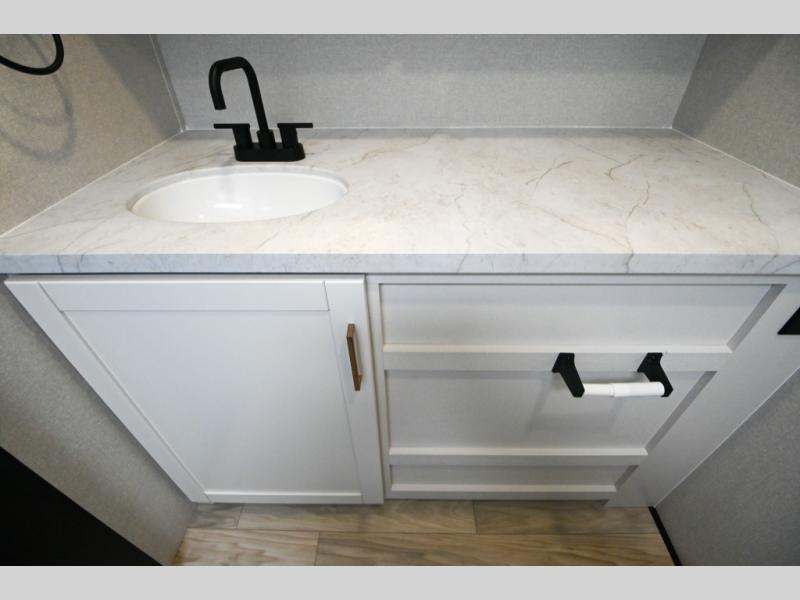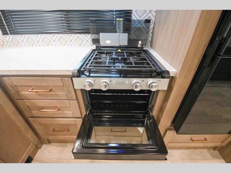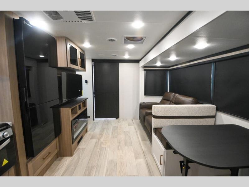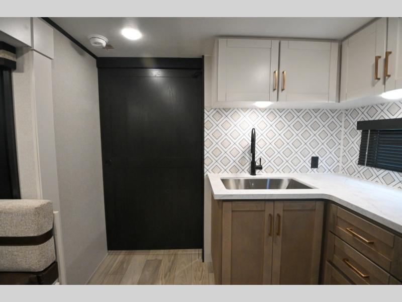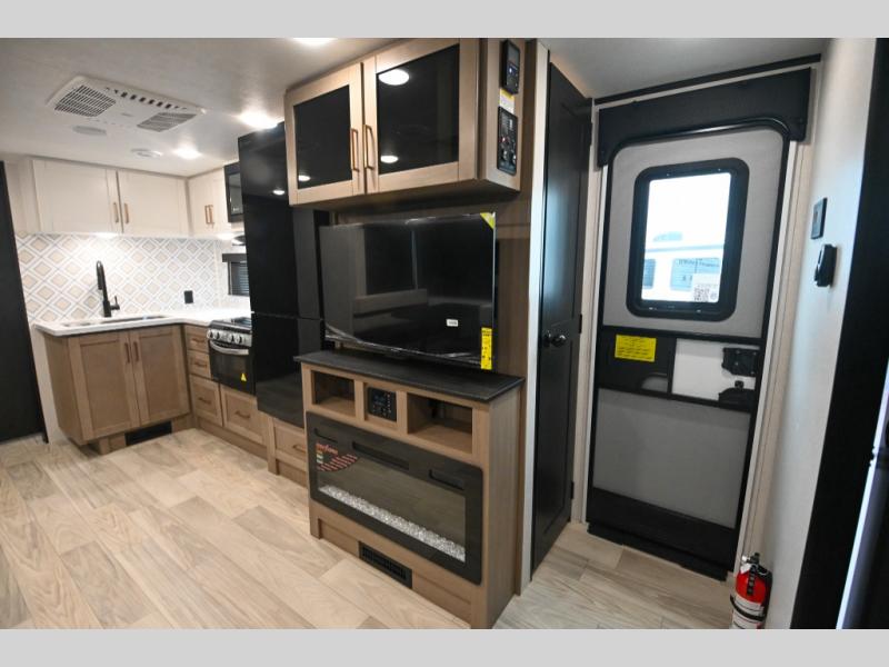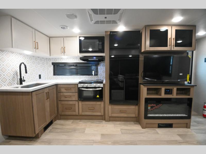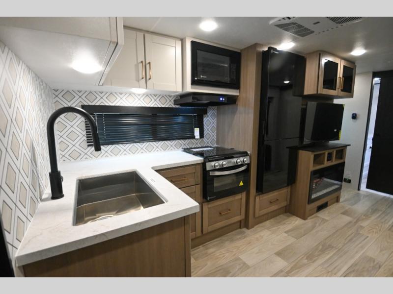 At the front of this travel trailer, you'll find a private bedroom featuring a 60" x 80" queen bed for a restful night’s sleep, in between nightstands on each side for added convenience. Moving into the center of the trailer, the main living area offers a spacious slide-out with a 60" tri-fold sofa perfect for lounging, and a 40" x 70" dinette ideal for meals, game nights, or gathering with friends and family—both of which convert into extra-sleeping space if needed. Across from the slide, the L-shaped kitchen is thoughtfully designed for ease and efficiency, featuring a stainless steel sink on one end, seamless countertop space for prepping meals, a three-burner range, and an 11 cu. ft. refrigerator for all your cooking essentials. Just beside the refrigerator is the entertainment center, with a walk-in pantry tucked behind it to store all your dry goods and snacks. At the rear, the full bathroom provides generous counter space, making it easy and comfortable to get ready each day.