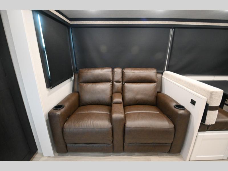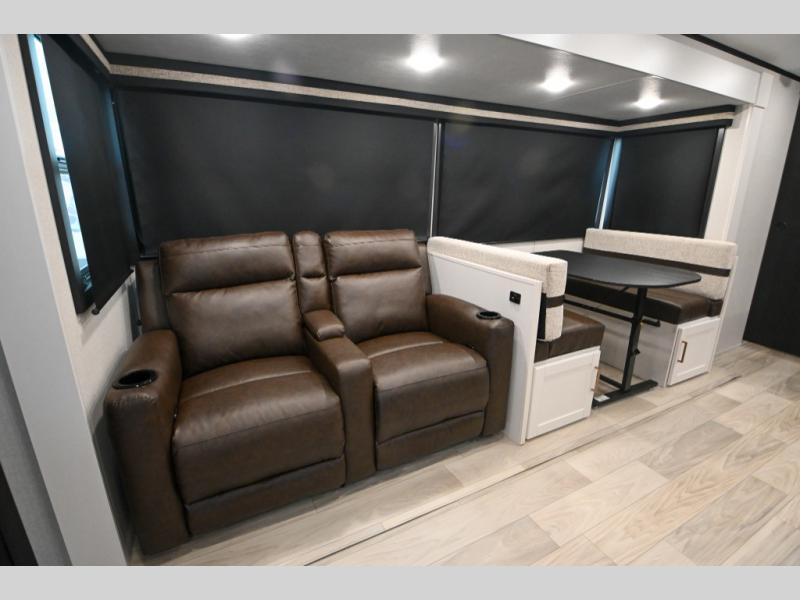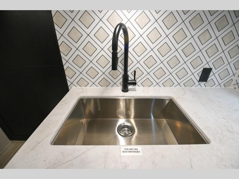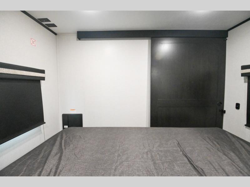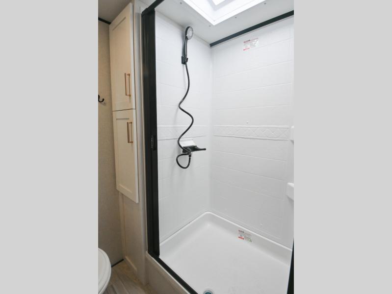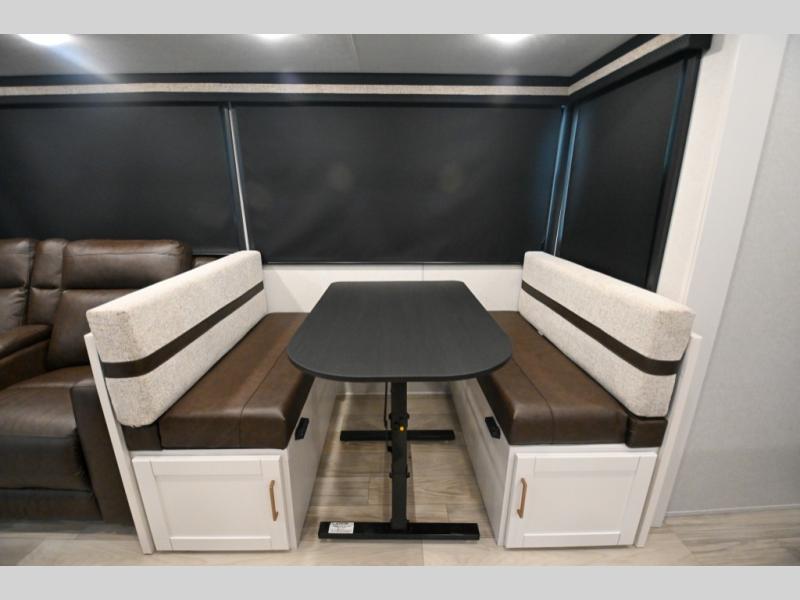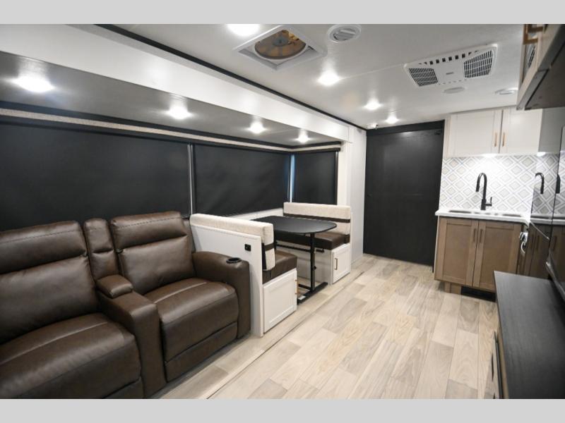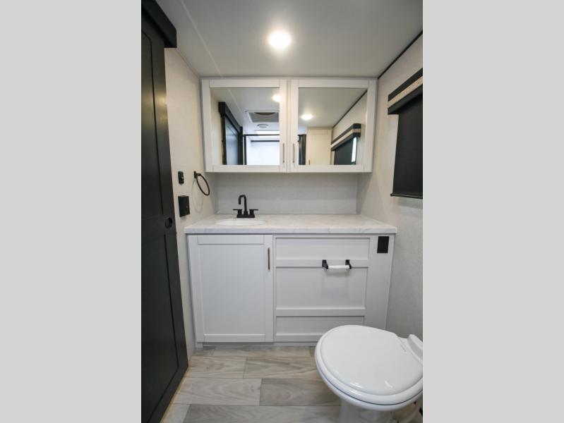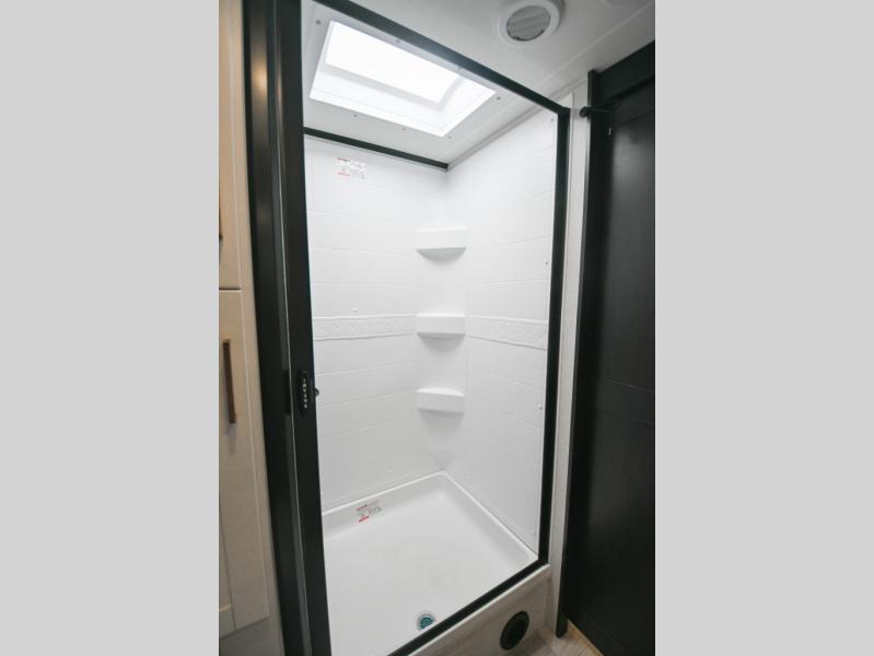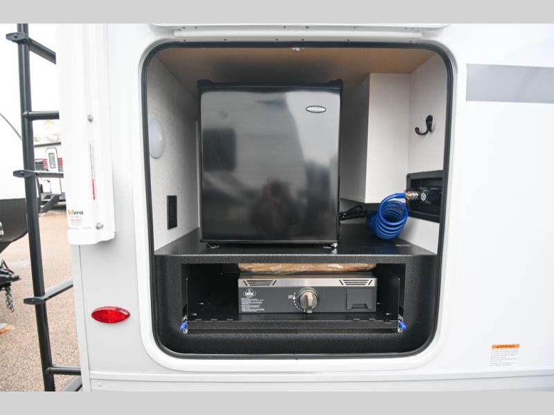 At the front of this travel trailer, you'll find a private bedroom featuring a 60" x 80" queen bed for a restful night’s sleep, in between nightstands on each side for added convenience. Moving into the center of the trailer, the main living area offers a spacious slide-out with a 60" tri-fold sofa perfect for lounging, and a 40" x 70" dinette ideal for meals, game nights, or gathering with friends and family—both of which convert into extra-sleeping space if needed. Across from the slide, the L-shaped kitchen is thoughtfully designed for ease and efficiency, featuring a stainless steel sink on one end, seamless countertop space for prepping meals, a three-burner range, and an 11 cu. ft. refrigerator for all your cooking essentials. Just beside the refrigerator is the entertainment center, with a walk-in pantry tucked behind it to store all your dry goods and snacks. At the rear, the full bathroom provides generous counter space, making it easy and comfortable to get ready each day.