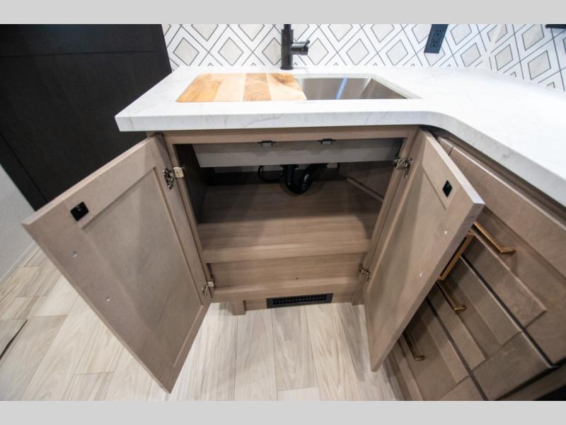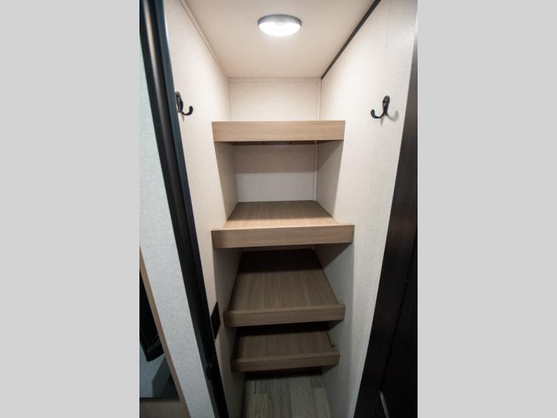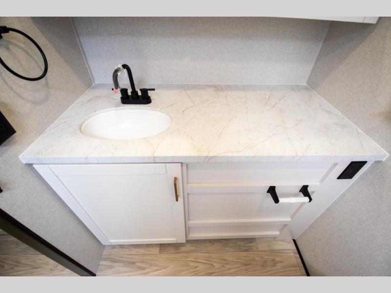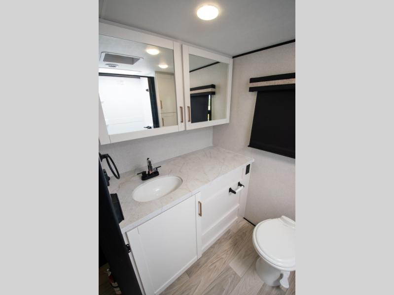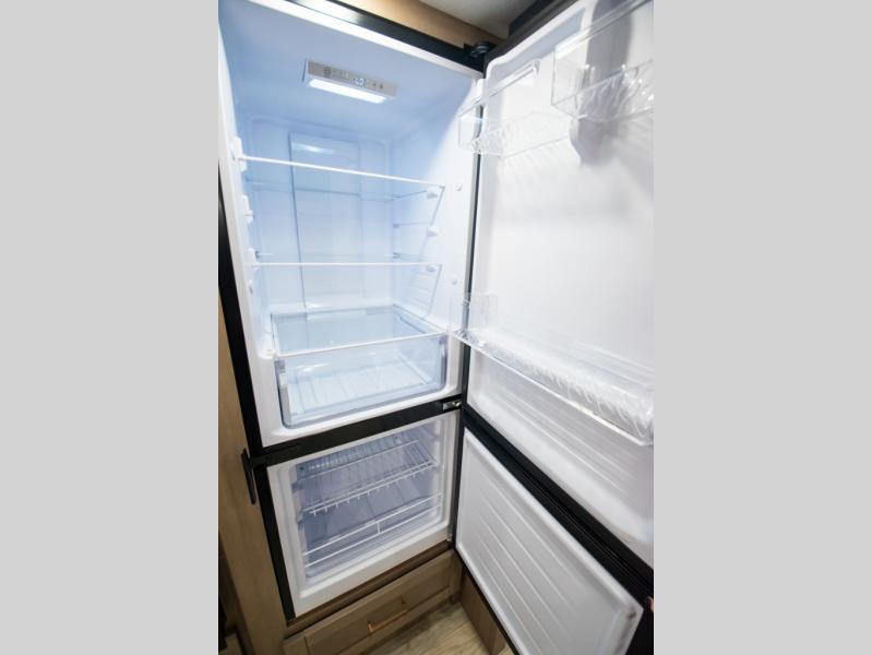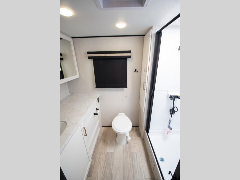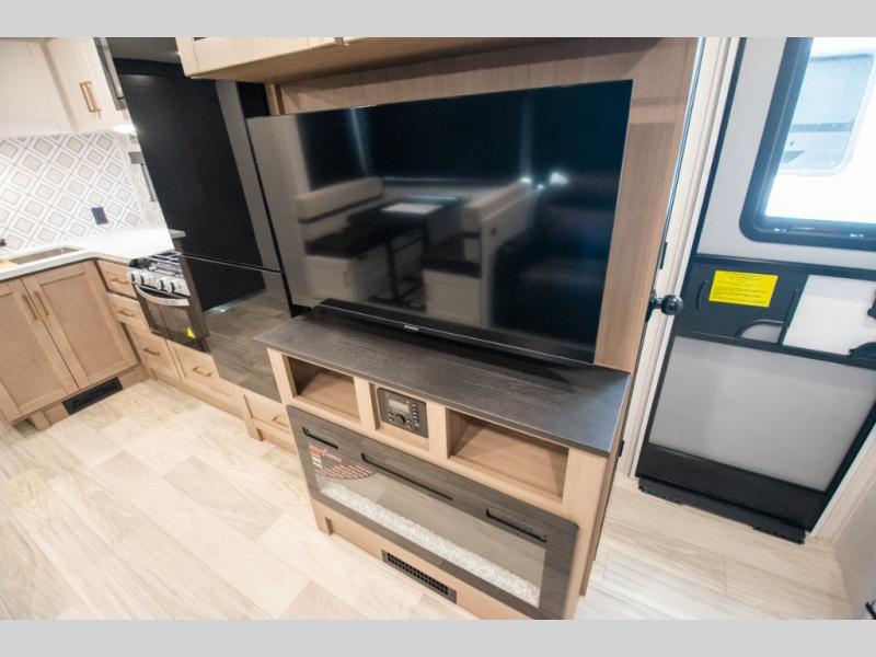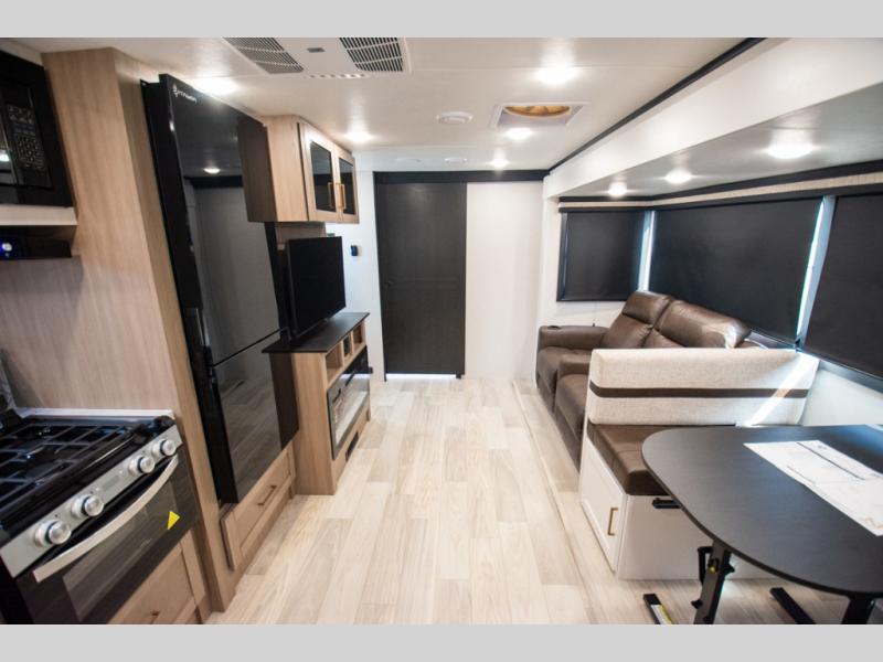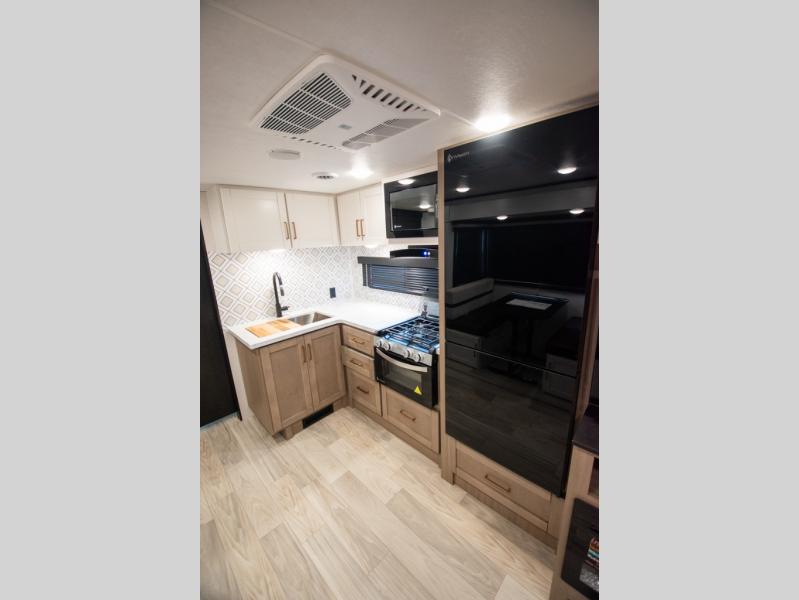 At the front of this travel trailer, you'll find a private bedroom featuring a 60" x 80" queen bed for a restful night’s sleep, in between nightstands on each side for added convenience. Moving into the center of the trailer, the main living area offers a spacious slide-out with a 60" tri-fold sofa perfect for lounging, and a 40" x 70" dinette ideal for meals, game nights, or gathering with friends and family—both of which convert into extra-sleeping space if needed. Across from the slide, the L-shaped kitchen is thoughtfully designed for ease and efficiency, featuring a stainless steel sink on one end, seamless countertop space for prepping meals, a three-burner range, and an 11 cu. ft. refrigerator for all your cooking essentials. Just beside the refrigerator is the entertainment center, with a walk-in pantry tucked behind it to store all your dry goods and snacks. At the rear, the full bathroom provides generous counter space, making it easy and comfortable to get ready each day.