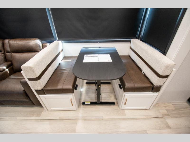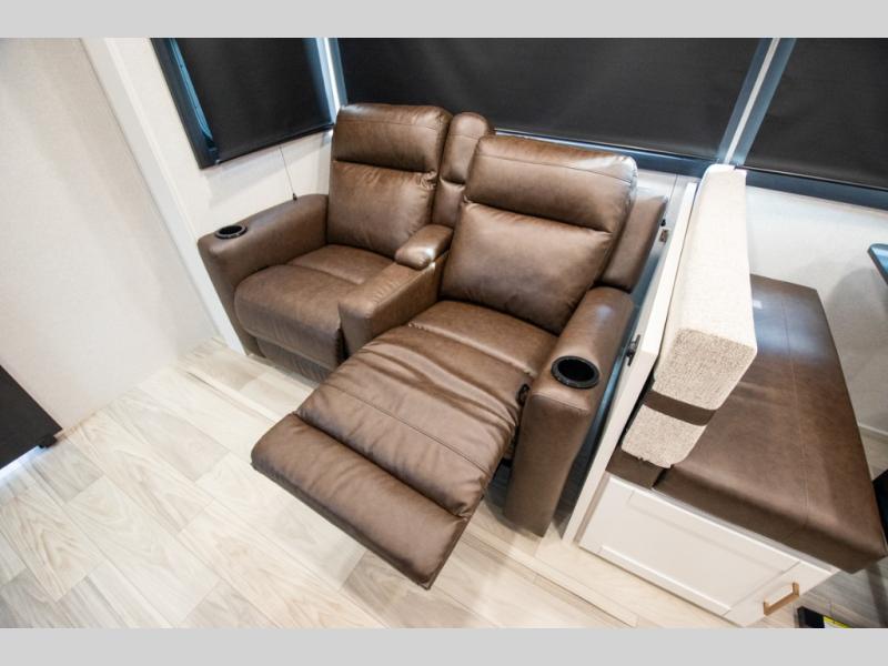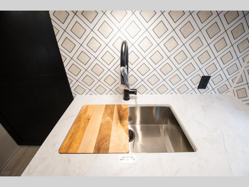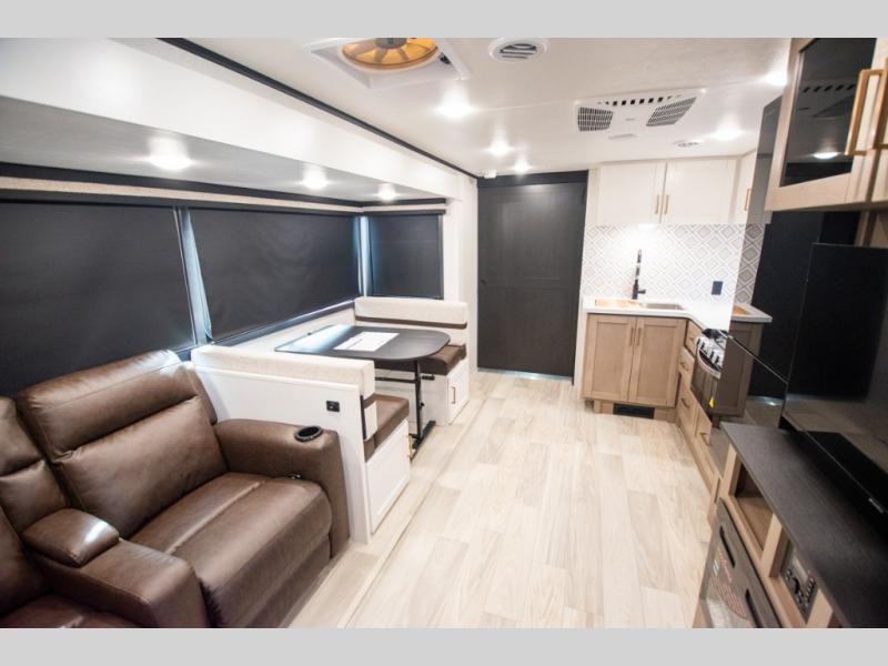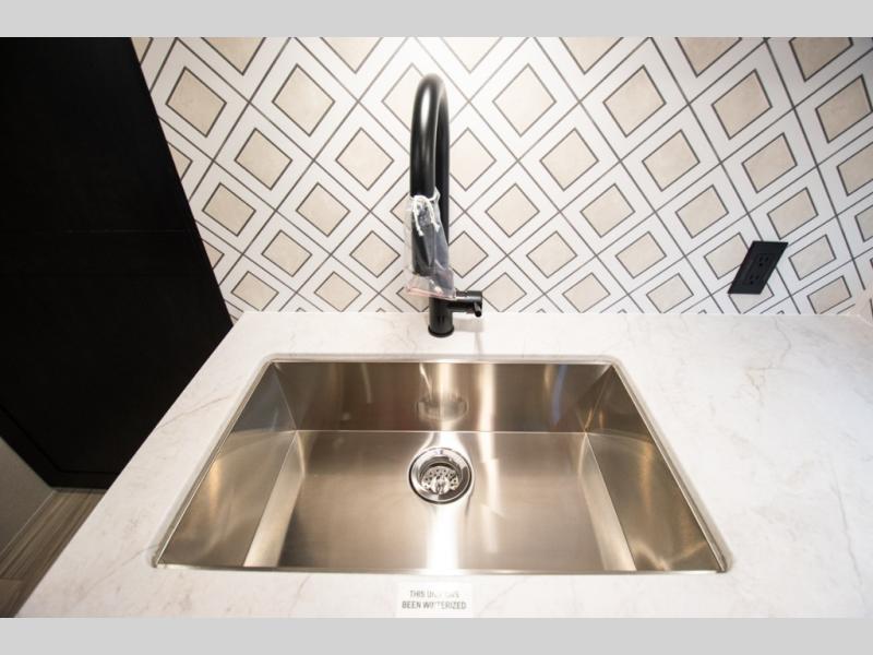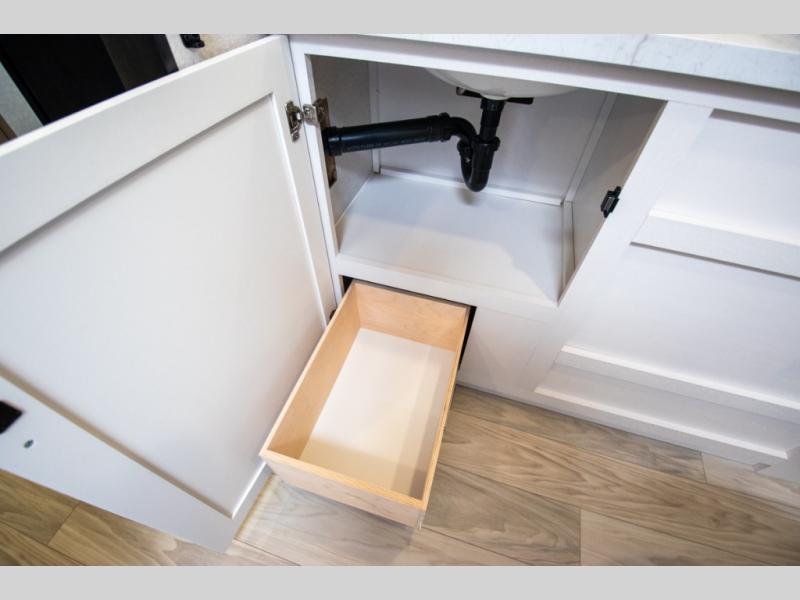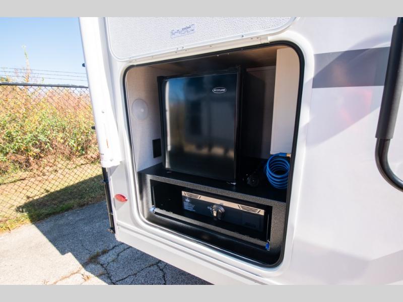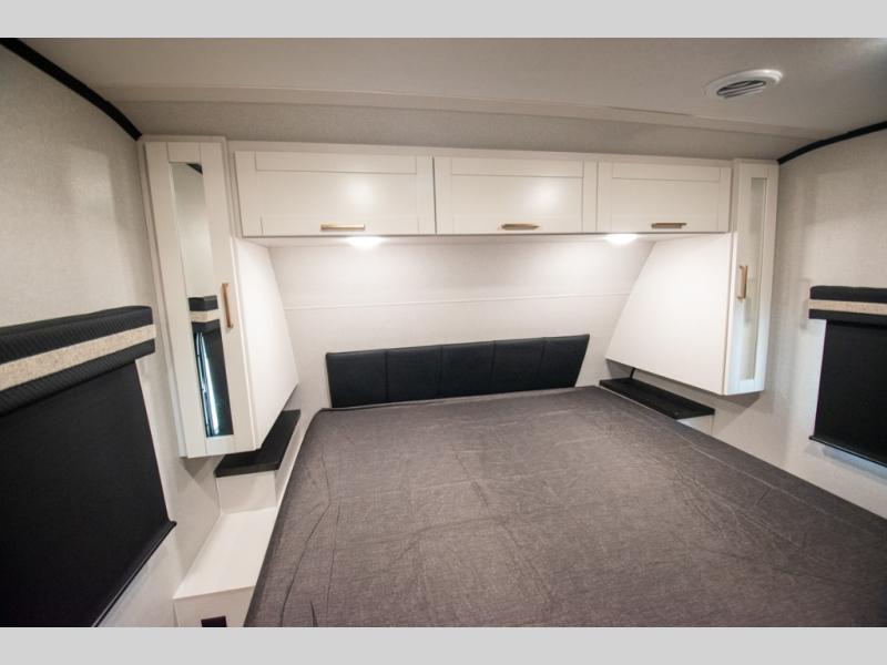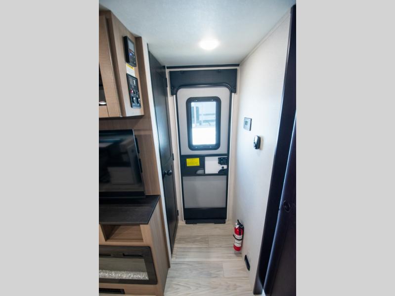 At the front of this travel trailer, you'll find a private bedroom featuring a 60" x 80" queen bed for a restful night’s sleep, in between nightstands on each side for added convenience. Moving into the center of the trailer, the main living area offers a spacious slide-out with a 60" tri-fold sofa perfect for lounging, and a 40" x 70" dinette ideal for meals, game nights, or gathering with friends and family—both of which convert into extra-sleeping space if needed. Across from the slide, the L-shaped kitchen is thoughtfully designed for ease and efficiency, featuring a stainless steel sink on one end, seamless countertop space for prepping meals, a three-burner range, and an 11 cu. ft. refrigerator for all your cooking essentials. Just beside the refrigerator is the entertainment center, with a walk-in pantry tucked behind it to store all your dry goods and snacks. At the rear, the full bathroom provides generous counter space, making it easy and comfortable to get ready each day.